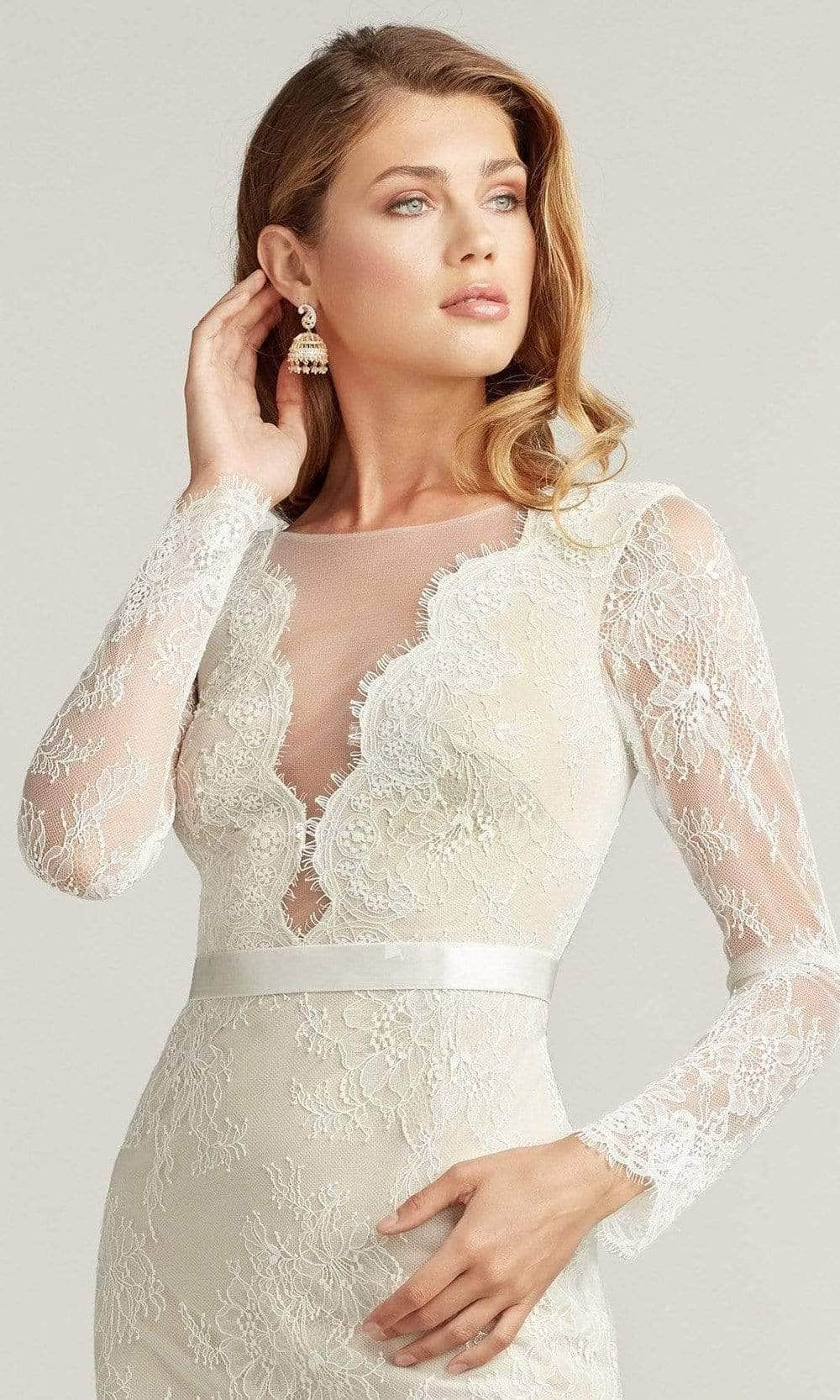Make a remarkable entrance with this Tadashi Shoji BHA19181S cocktail dress, standing out as the most enchanting. The dress is crafted with delicate Chantilly lace, showcasing a plunging neckline adorned with a tulle illusion. The elegant addition of a satin belt imparts a Bohemian aesthetic with a hint of allure. The full A-line silhouette skirt is lined with tulle and gracefully flows to a horsehair hem, accentuated by a center-back invisible zipper. This Tadashi Shoji creation promises to present you with a picture-perfect look!