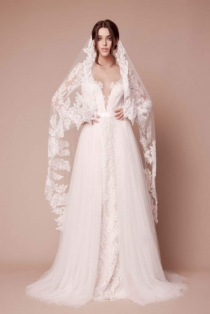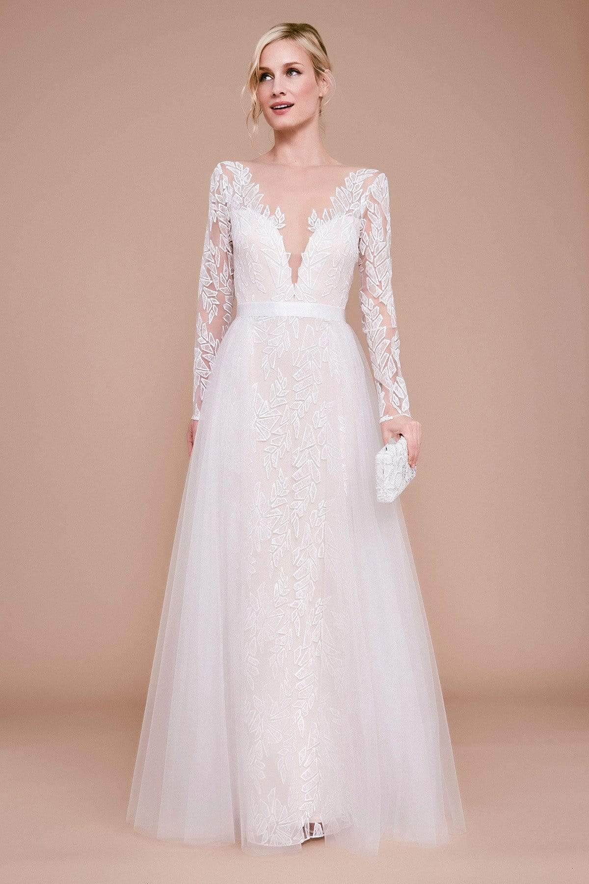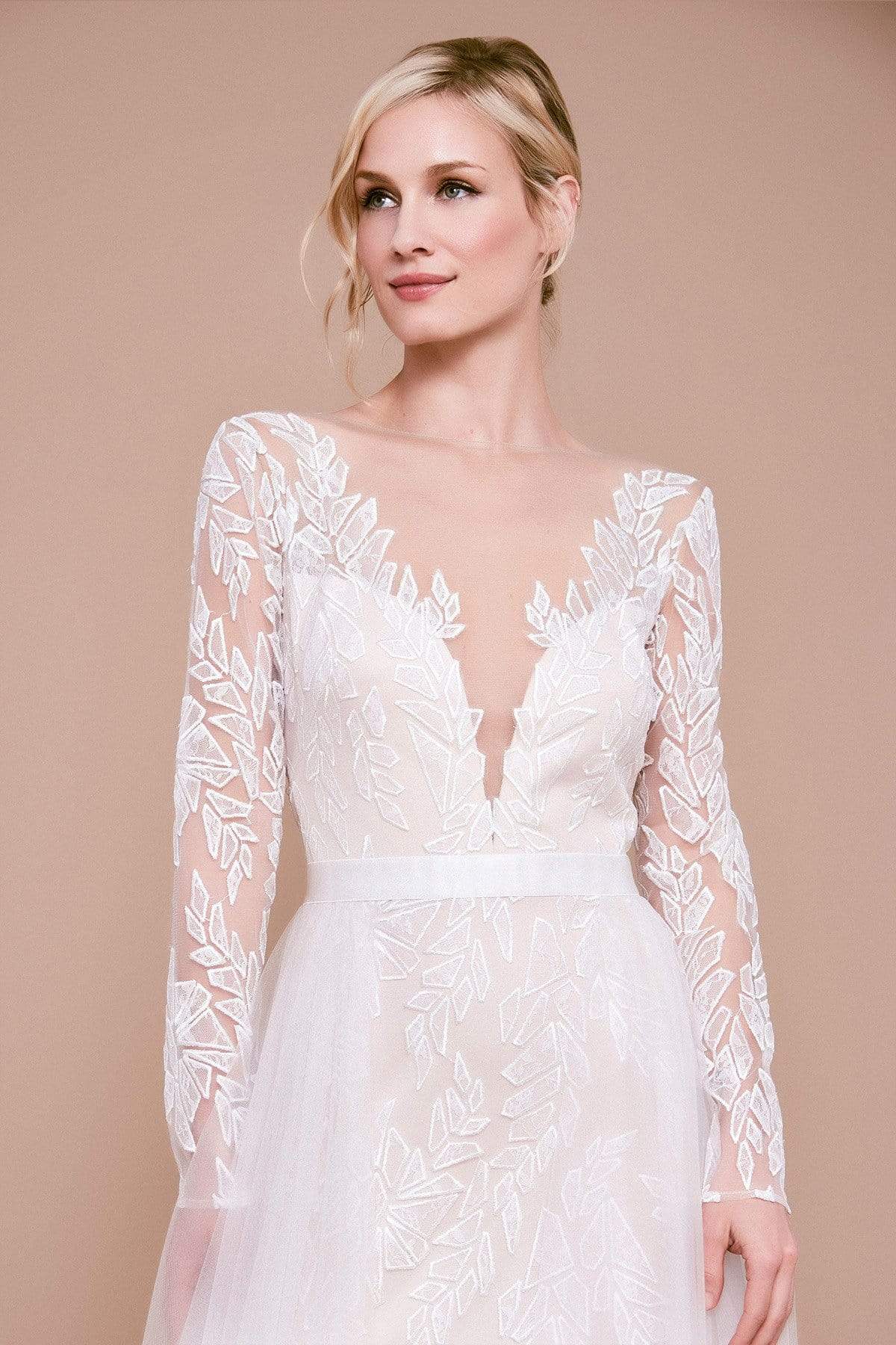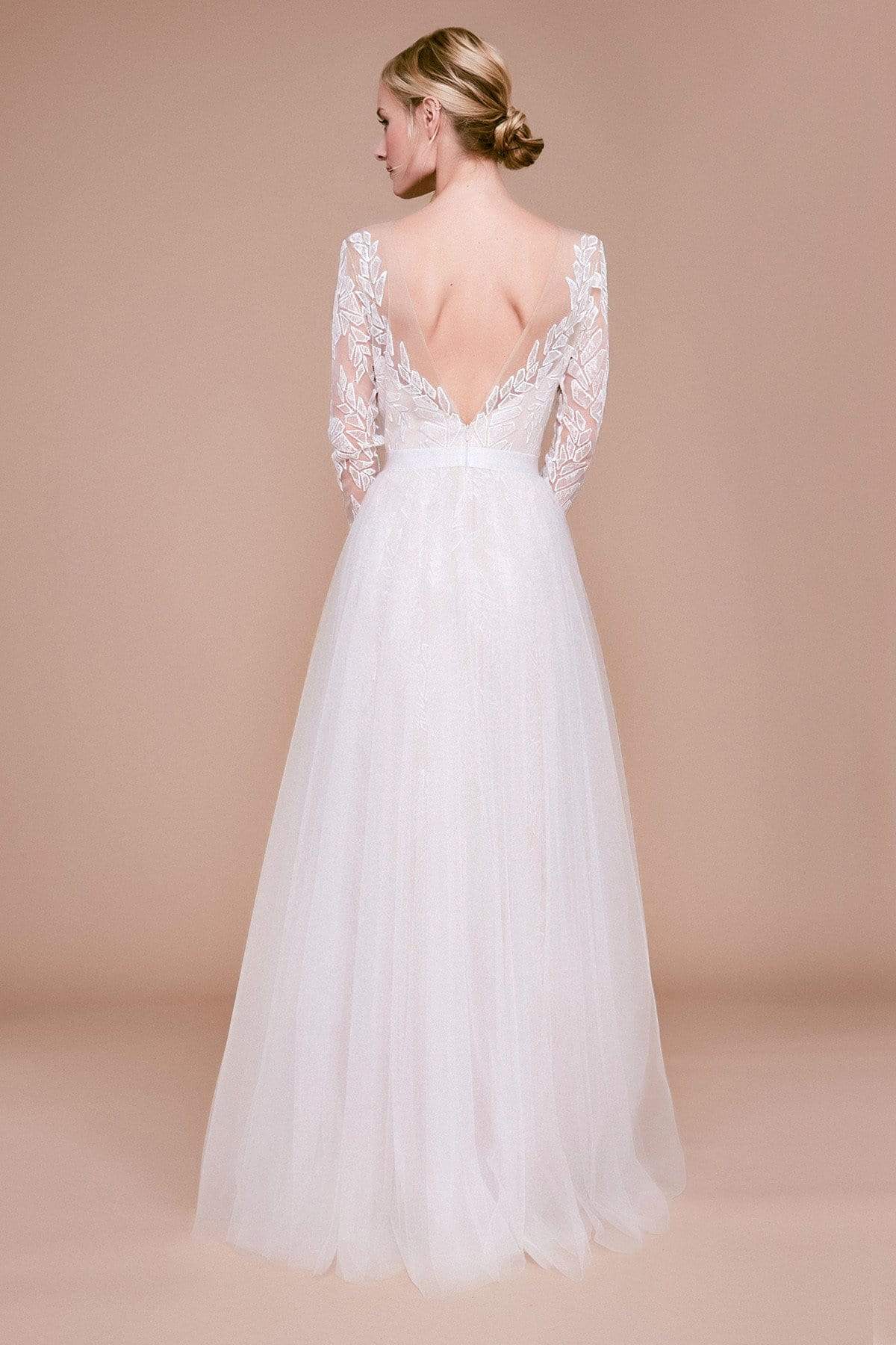 | Details: | Sheer long sleeves, Plunging neckline, Waistband, Lace, Tulle, A-line skirt, Open back, Back zipper |
