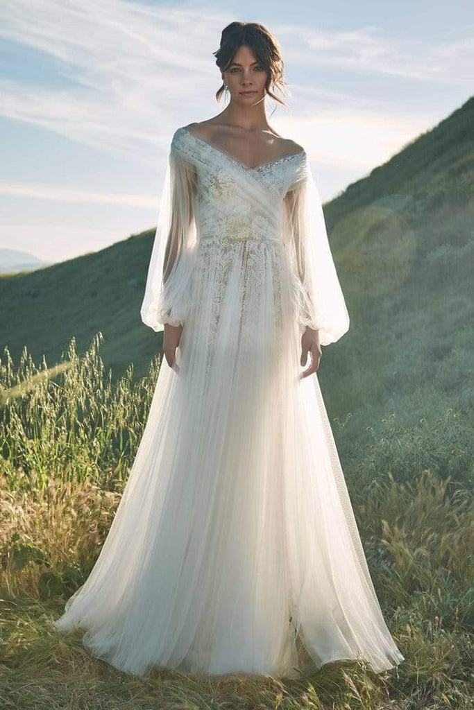 | Details: | Lace Embroideries, Crisscross Bodice, Pleated, Sheer Tulle Overlay, Long Puffed Sleeves, Floor Length |
