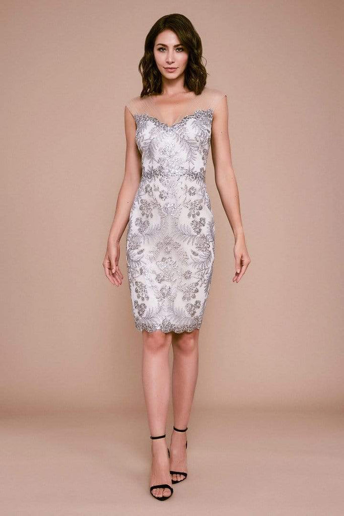 A shimmering v-neckline with tulle illusion beautifully complements the elegant sophistication of this embroidered tulle, paillette-dusted sheath. The style’s cool silver-grey hues are set off by a warm tonal underlayer.
