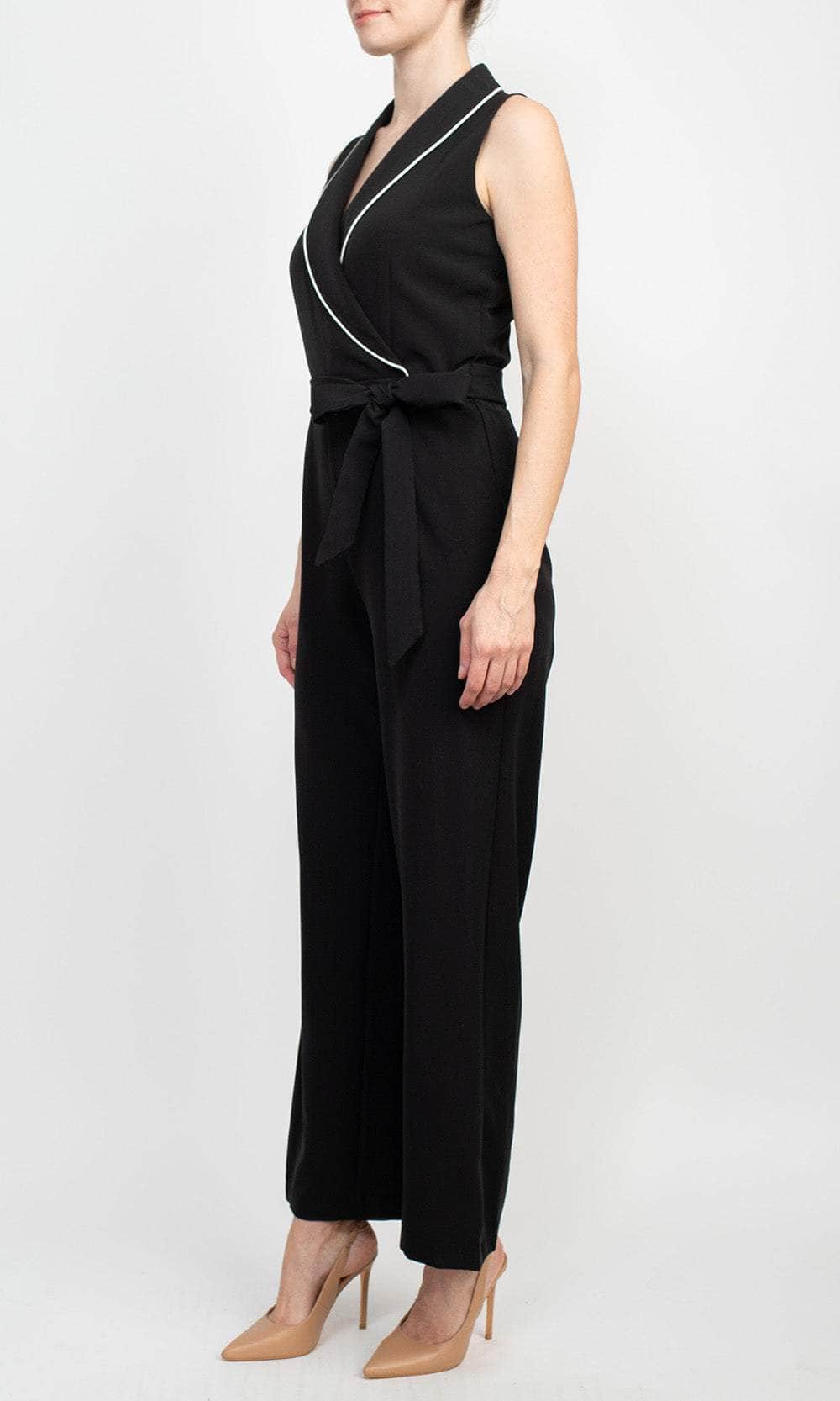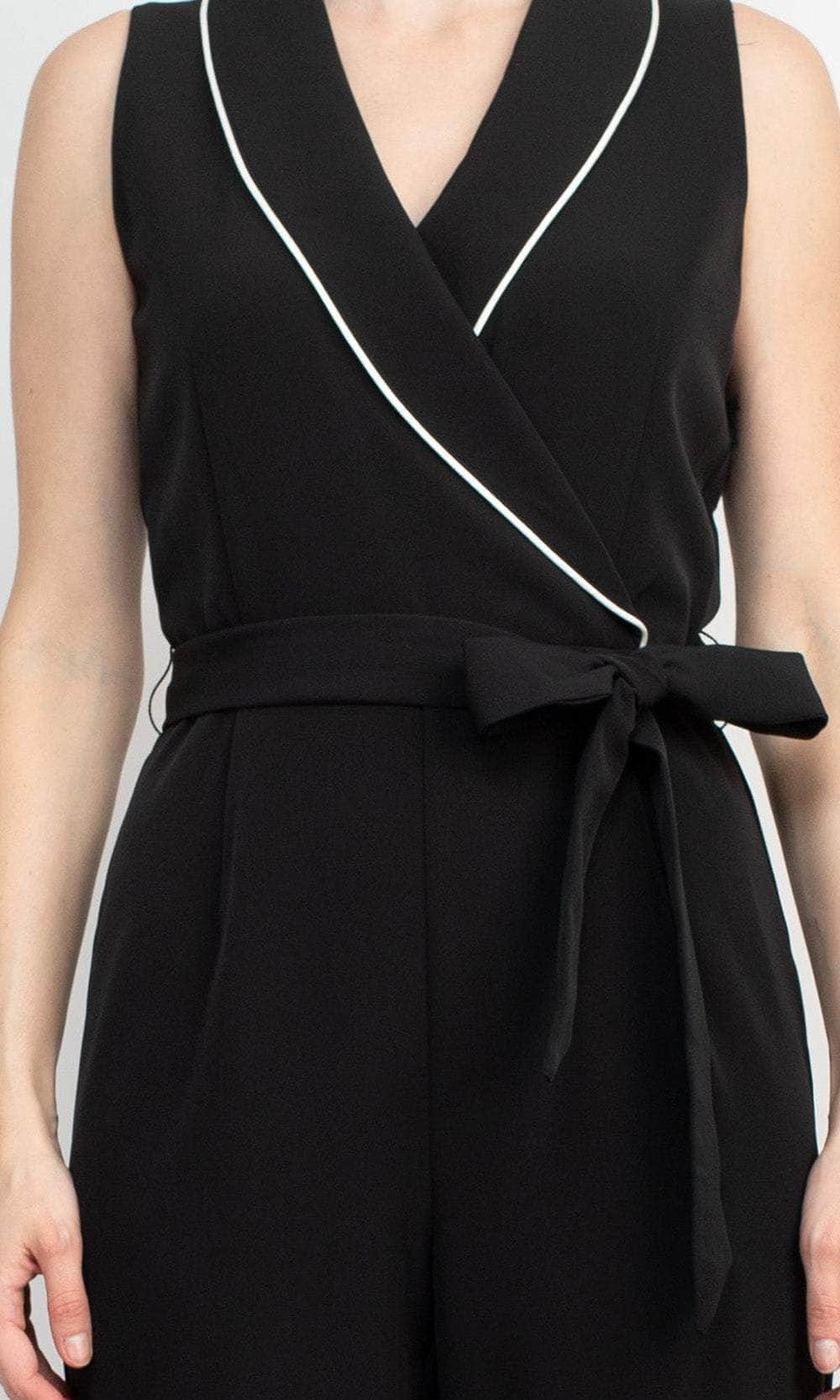 Look fabulous for your event in this Tahari TD001031 masterpiece. Boast your fashion-forward statement in this jumpsuit ensemble that features a surplice bodice with a sleeveless collared v-neckline. The piping detail adds a touch of beauty and glamour, while the waist embraces a tie band that effortlessly flatters your figure. The full-back design and a pair of straight pants complete this look. Fall in love when you slip on this Tahari TD001031 design. Model is wearing the Black Ivory color.