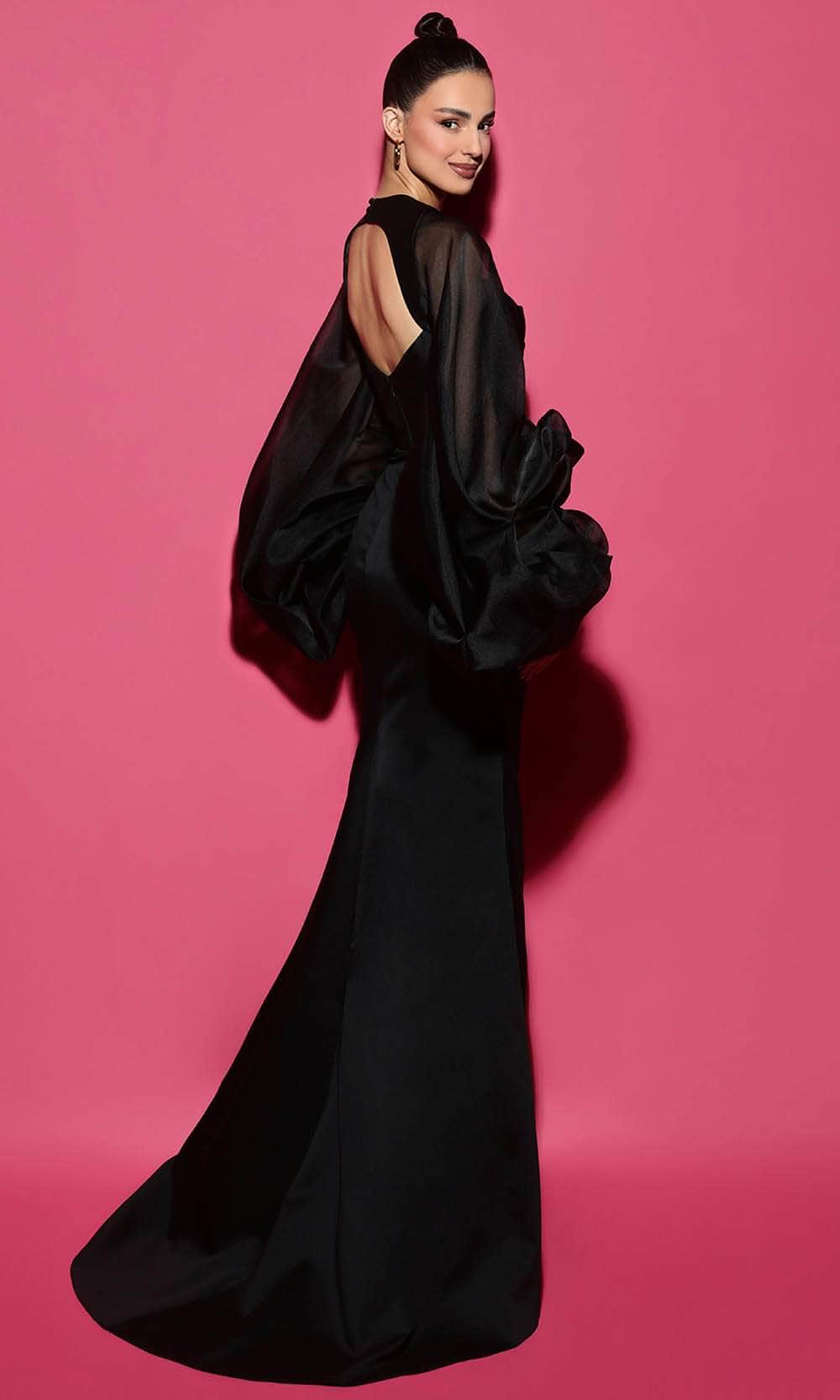 Make a statement in Tarik Deiz 53154, an alluring taffeta-made dress meticulously crafted to enchant. The long balloon-ruffled sleeves add a touch of drama and sophistication, while the ruched bodice exudes elegance and grace. The back cut-out creates a captivating and modern aesthetic, and the floor-length sheath skirt, featuring a high slit and train, ensures a mesmerizing and unforgettable entrance. Secured with a back zipper closure, this dress promises a seamless and flattering fit. Tarik Deiz 53154 guarantees to steal the spotlight.Model is wearing Black color.