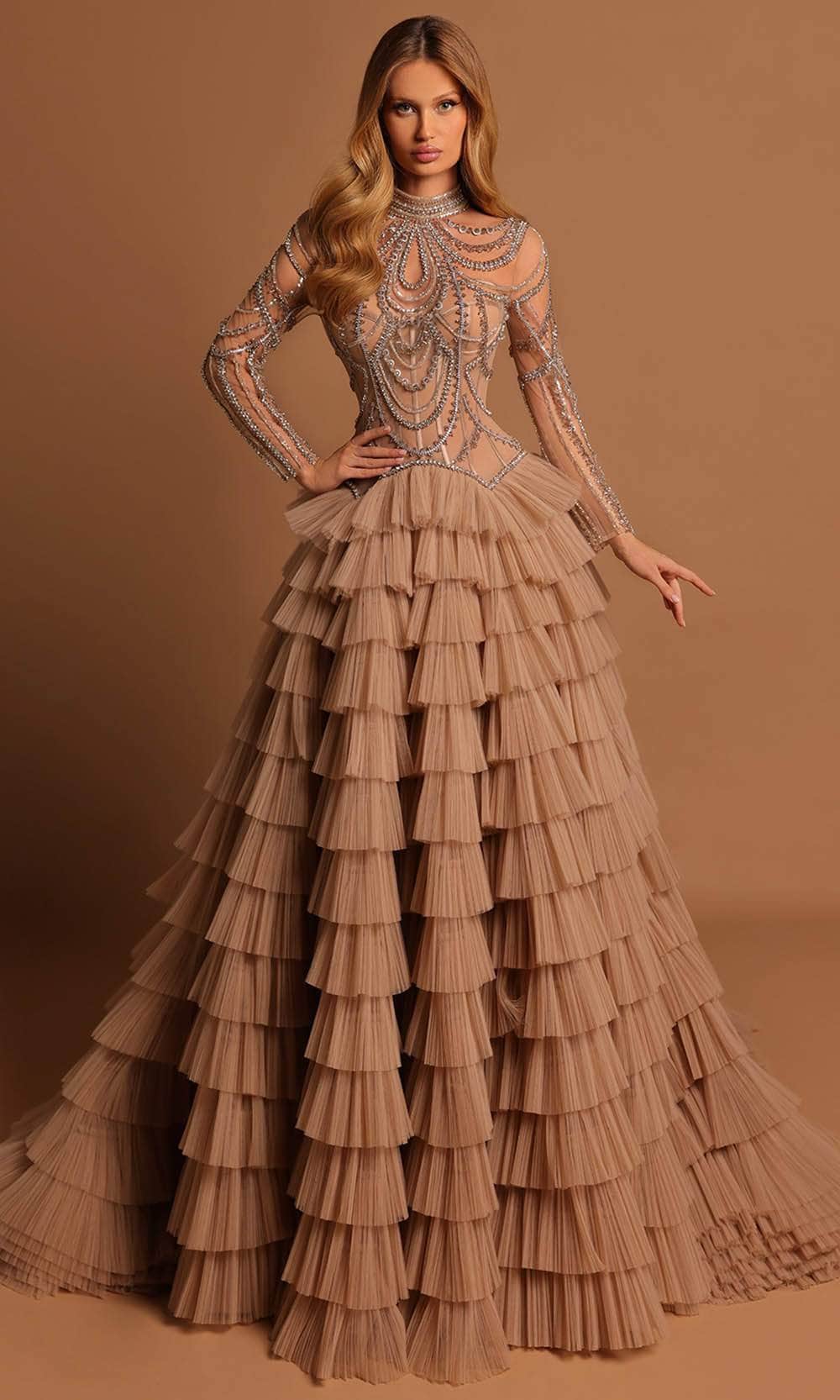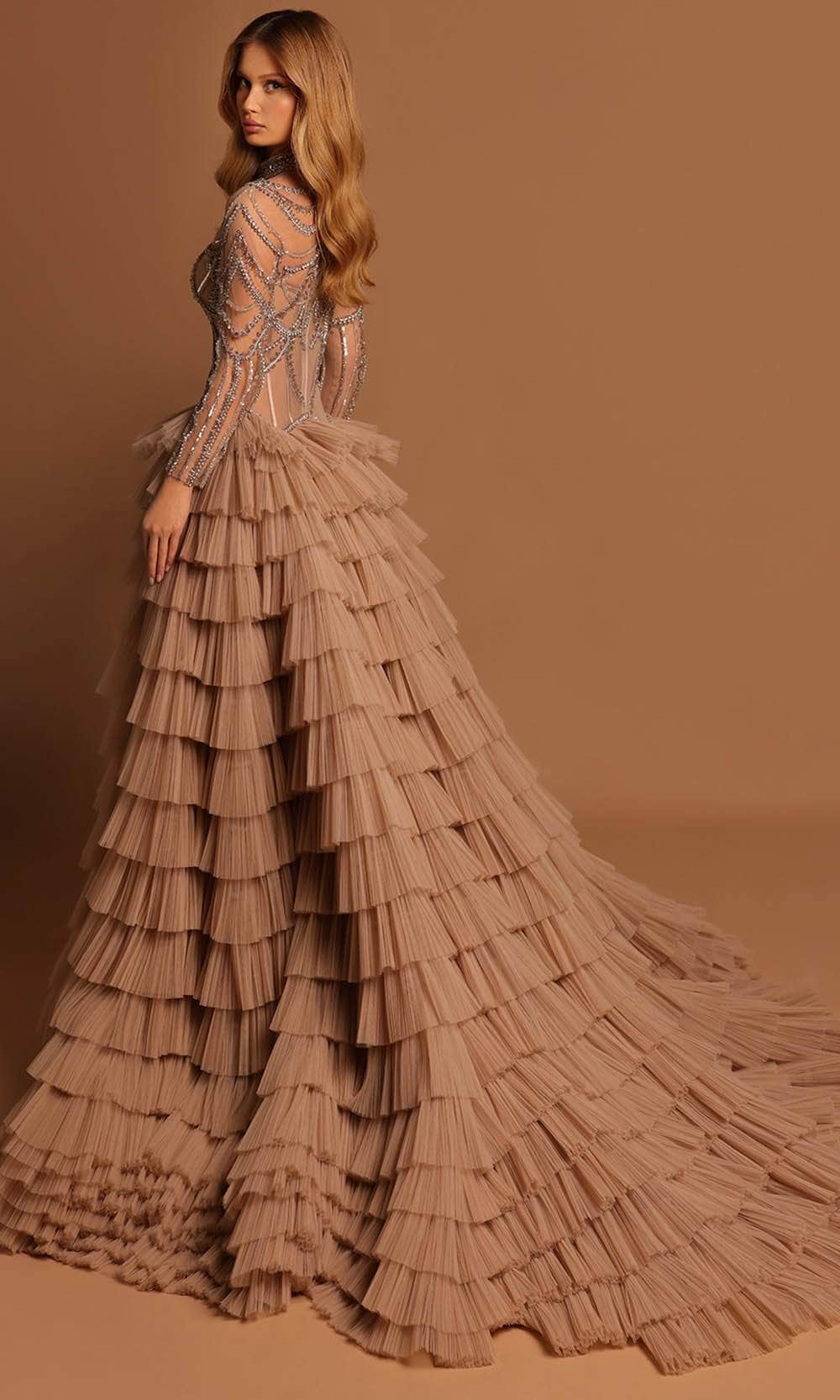 Enchant with grace in Tarik Ediz 98491, a captivating dress meticulously crafted from luxurious glitter tulle fabric. The long sleeves exude timeless elegance, while the fitted bodice, adorned with intricate beadwork, creates an opulent and captivating aesthetic. The high neckline adds a touch of refined sophistication, complementing the alluring silhouette. The floor-length tiered skirt cascades gracefully, culminating in a captivating train that promises an unforgettable entrance. Tarik Ediz 98491 epitomizes modern allure and timeless opulence.Model is wearing Champagne color.
