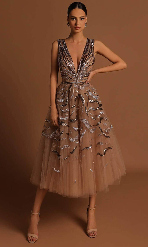 Shine brilliantly as you wear this fabulous Tarik Ediz 98559, an alluring A-line dress adorned with exquisite sequins, meticulously designed to mesmerize. The sleeveless bodice exudes timeless elegance, while the plunging V-neckline adds a touch of allure and sophistication. The tea-length A-line silhouette flows gracefully, creating a captivating and enchanting aesthetic. This Tarik Ediz 98559 masterpiece epitomizes a harmonious blend of contemporary allure and timeless sophistication, ensuring an unforgettable and captivating entrance. Model is wearing Champagne color.