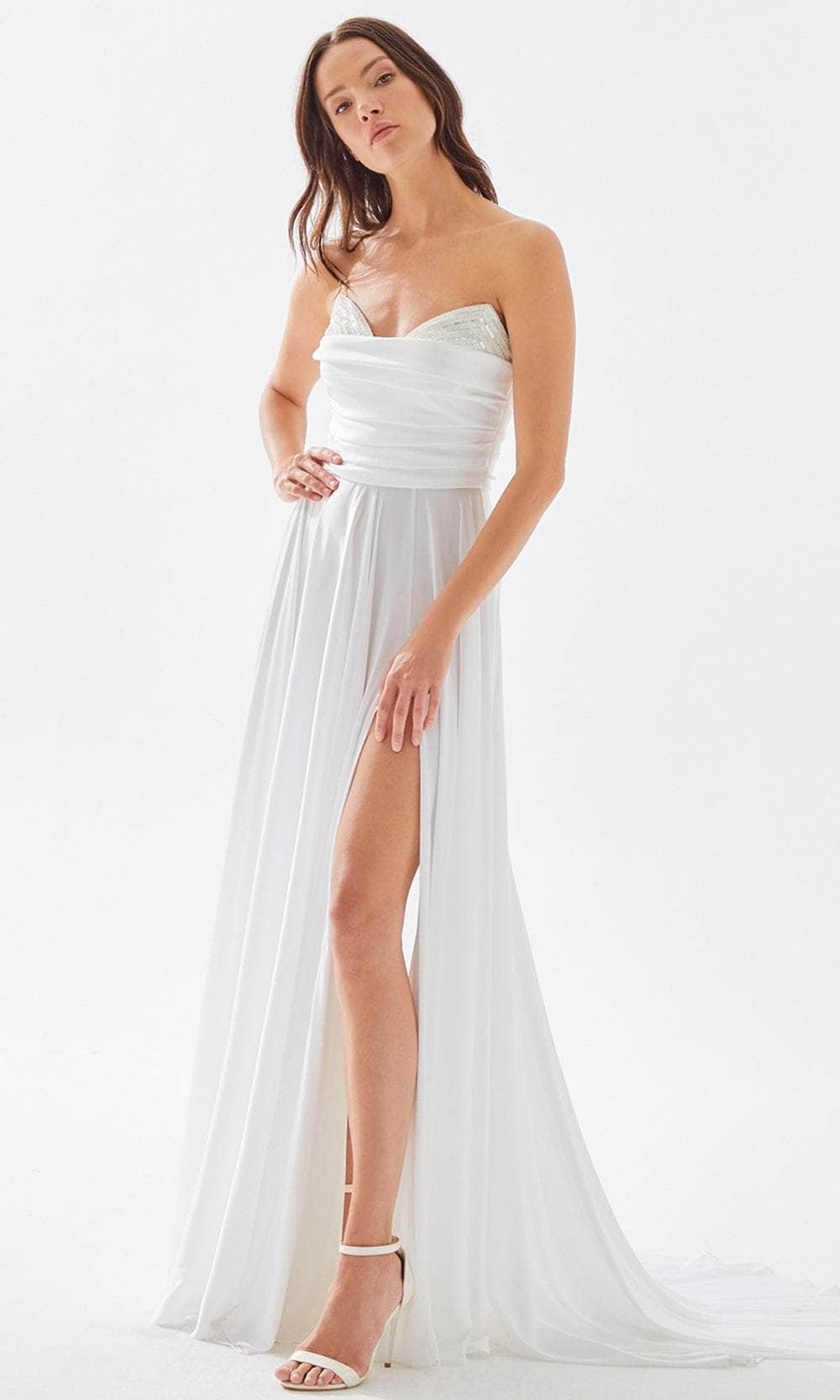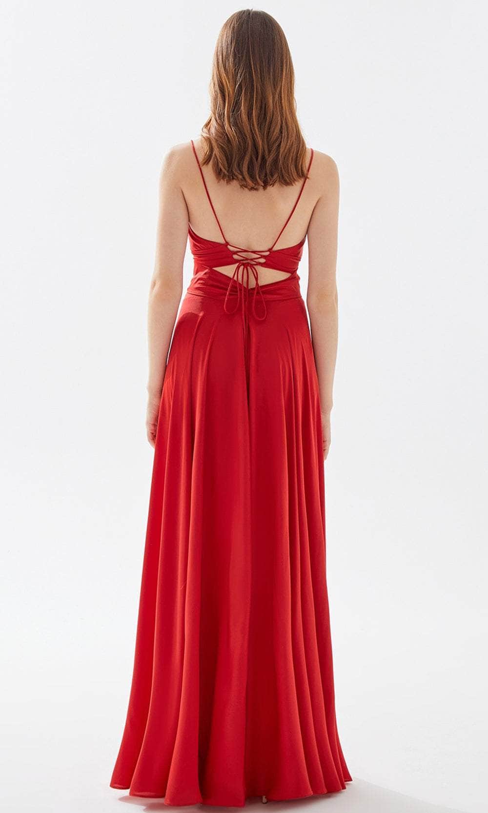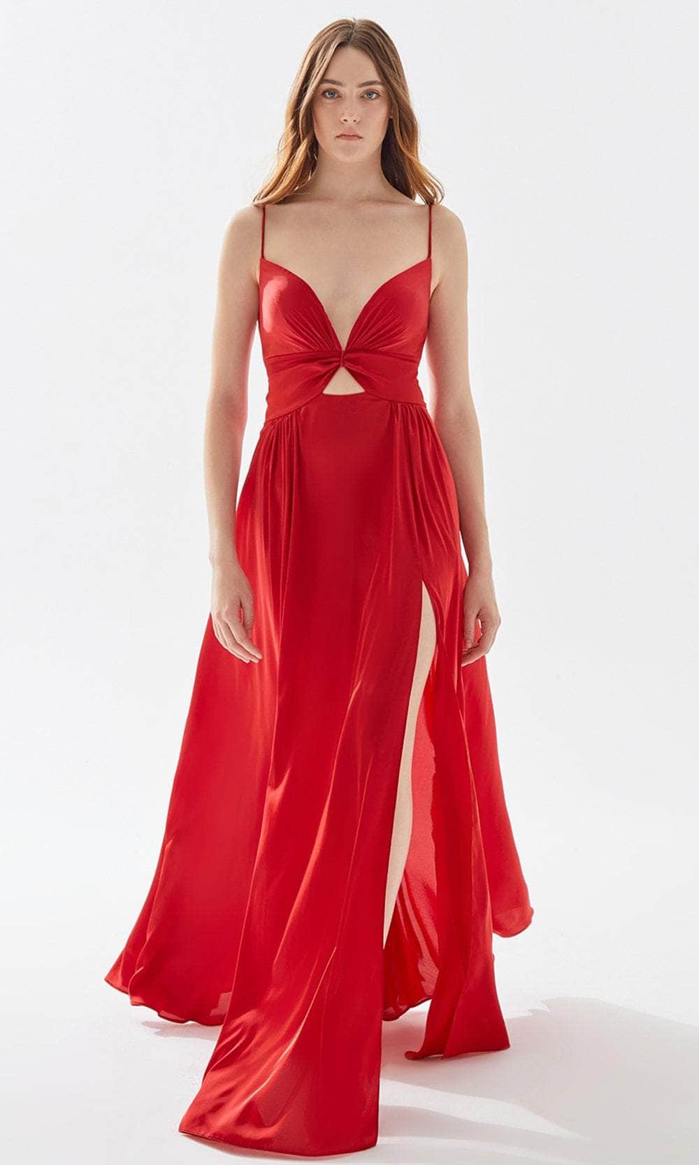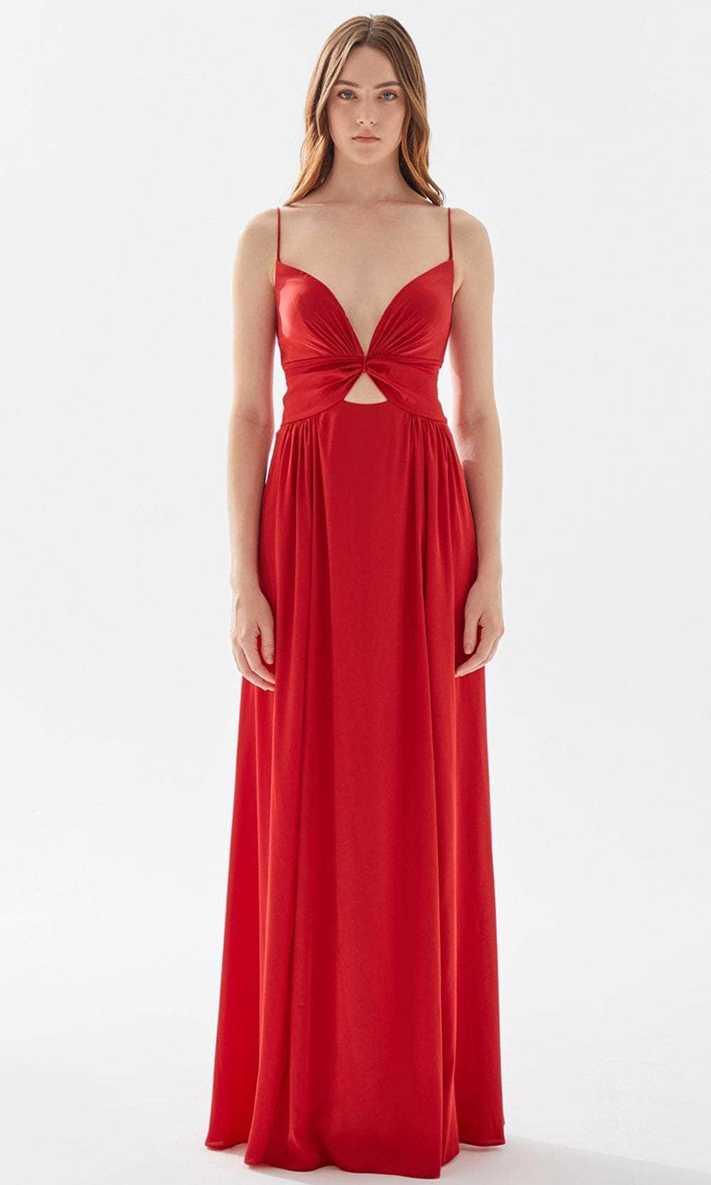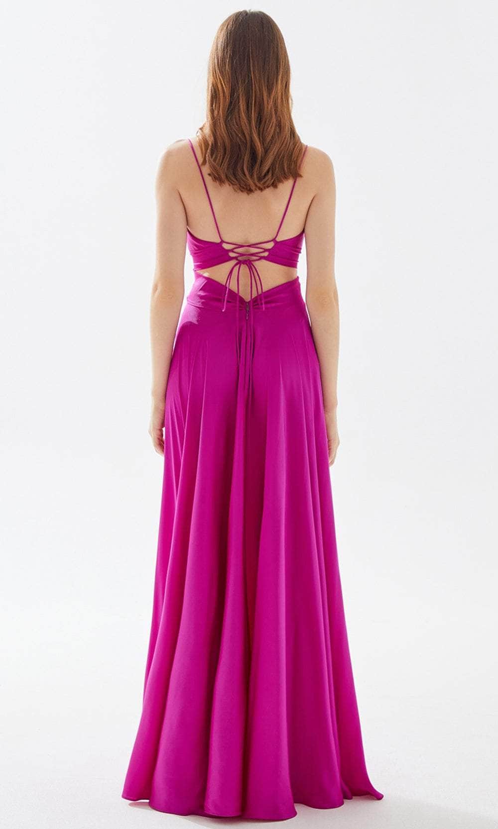 Set a style that would engage everyone in an enchanting evening in this Tarik Ediz 52005. This full length gown is styled with a unique butterfly bodice. A plunging neckline is paired with a triangular cutout just below, paired with delicate pleating for a butterfly wing effect. The A-line skirt features cartridge pleats on the sides of the hips, forming an A-line silhouette. Thin straps connect to a lace up back cutout detail. Show off your alluring perfection in this creation by Tarik Ediz 52005. Models are wearing Fuchsia and Red and White colors.