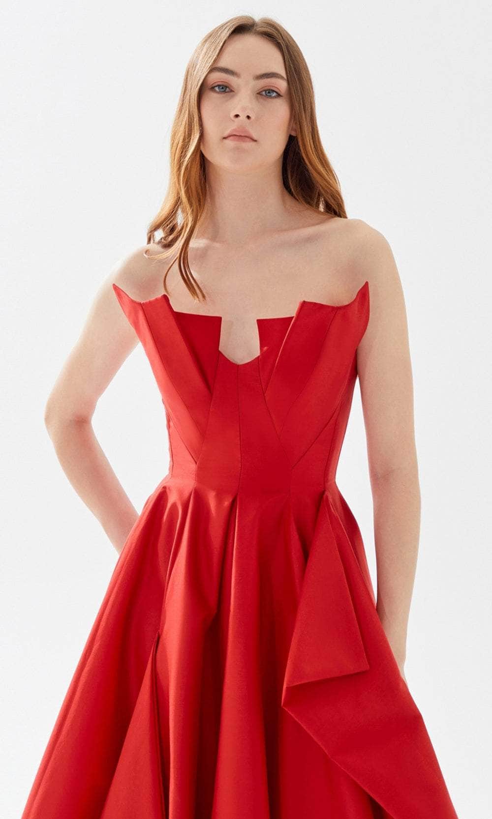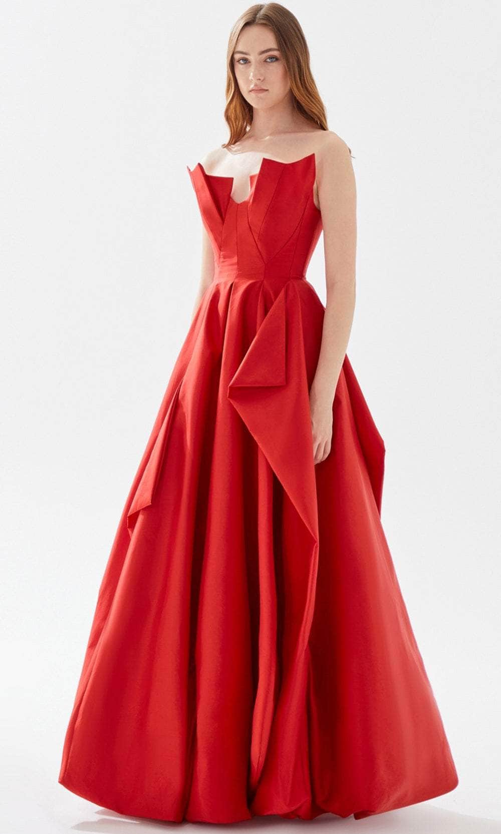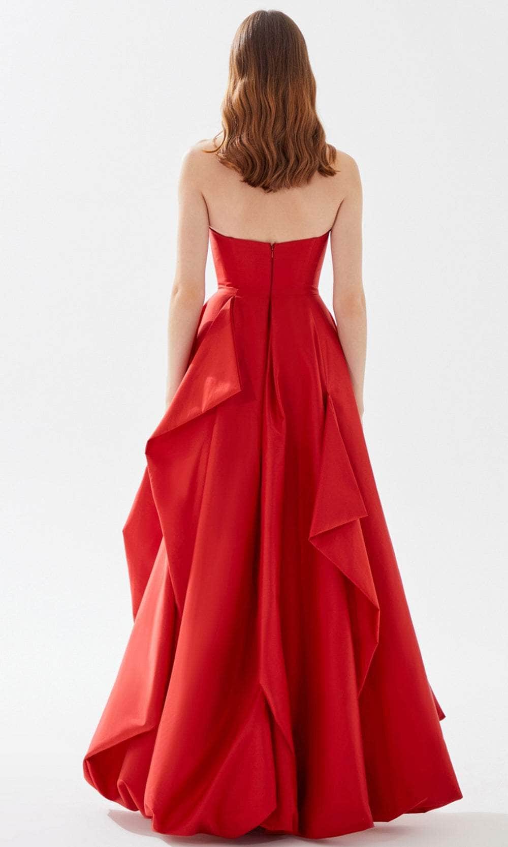 Fantasize a night of eloquent style and poise at your black-tie event while wearing this charming Tarik Ediz 52025 creation. This piece is a showstopper as it features a strapless neckline with a detailed bust on its bodice. The floor-length A-line skirt has ruffled draped detail making this piece stand out. Expect to be turning heads as you walk into your special event wearing this creatively romantic evening gown from Tarik Ediz 52025 creation. The model is wearing Black and Red colors.