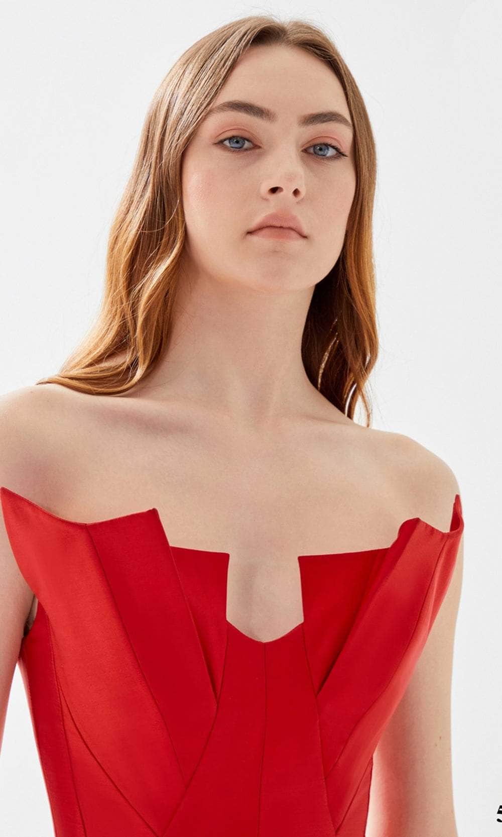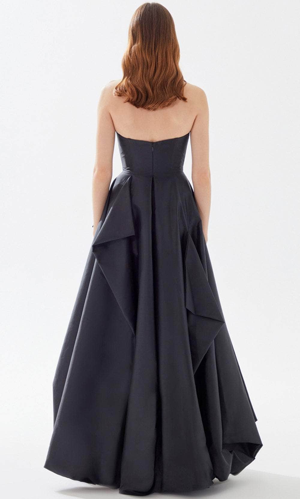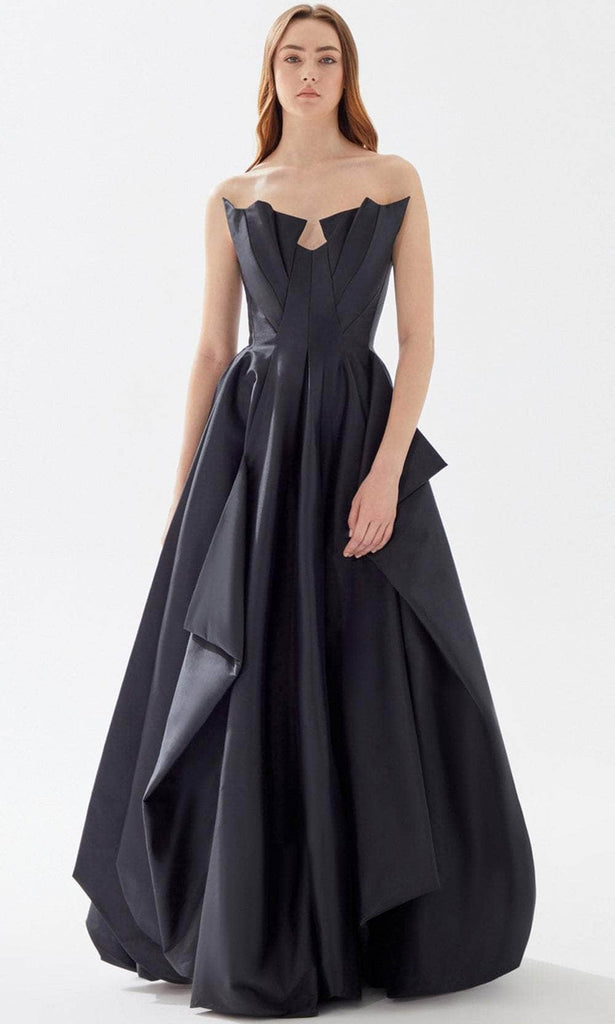 Fantasize a night of eloquent style and poise at your black-tie event while wearing this charming Tarik Ediz 52025 creation. This piece is a showstopper as it features a strapless neckline with a detailed bust on its bodice. The floor-length A-line skirt has ruffled draped detail making this piece stand out. Expect to be turning heads as you walk into your special event wearing this creatively romantic evening gown from Tarik Ediz 52025 creation. The model is wearing Black and Red colors.