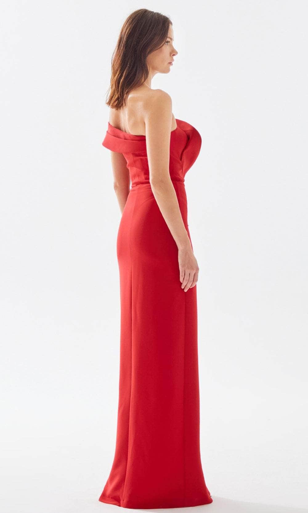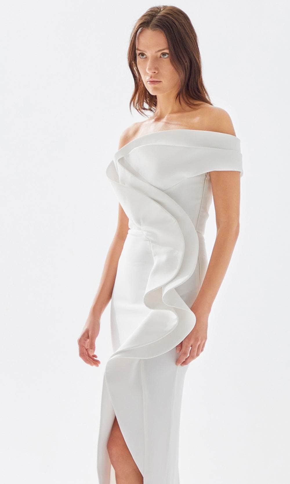 Lavish in the exceptional beauty of this ultra chic Tarik Ediz 52029 creation on the red carpet. Exceptionally tailored to reveal a luxurious feel with its voluminous ruffled design, this piece flaunts an asymmetrical bodice with an off shoulder short sleeve. Styled with a drape paneled back, the cascading ruffle accent trims the sexy slit. The sheath skirt sculpts and streams into a floor grazing hemline. Glow with an immaculate elegance in this exquisite Tarik Ediz masterpiece. Models are wearing the Ivory and Red colors.