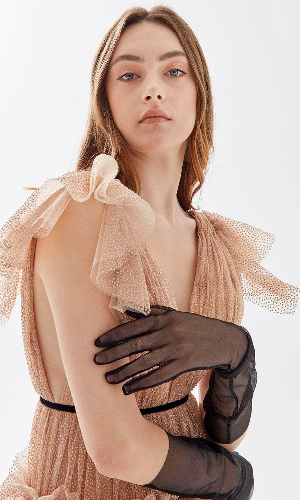 Achieve the next level of elegance in this Tarik Ediz 52035. Inspired by period styles from classic eras, this full length gown is designed with dramatic ruffles of tulle. The A-line skirt is voluminous with puffy tiered riffles and a chapel train. A thin band cinches the waist, moving upwards with vertical pleats along the bodice. Ruffled flounce sleeves frame a plunging V neckline. Flourish a chic style that will mesmerize the opulent crowd in this gorgeous Tarik Ediz Tarik Ediz 52035 Model is wearing Champagne color.