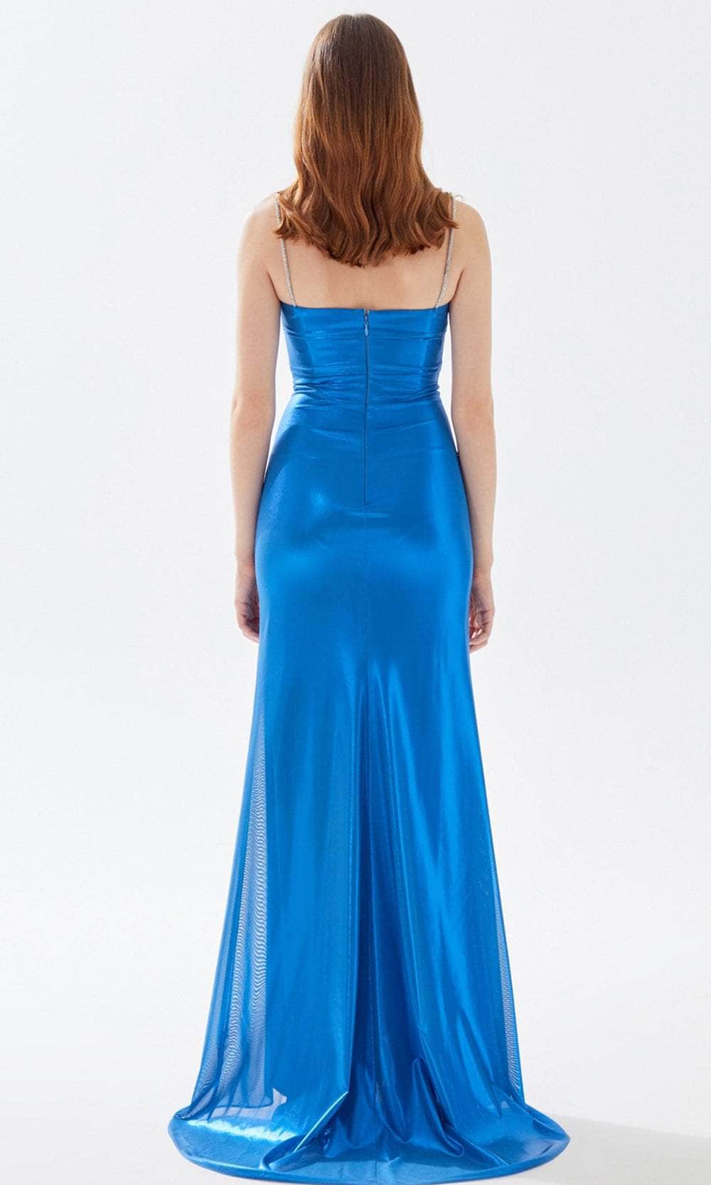 Embrace a classic sense of style in this engaging Tarik Ediz 52057 creation. This form-sculpting gown has fine ruching detail and features a straight-across neckline held together by beaded spaghetti straps. A center zipper is used to close the mid-open back. The skirt forms a full length sheath silhouette and flares out with a sweep train for a remarkable finish. Orchestrate your moment to stand out in this Tarik Ediz 52057 masterpiece. Models are wearing the Emerald and Bijou Blue colors.