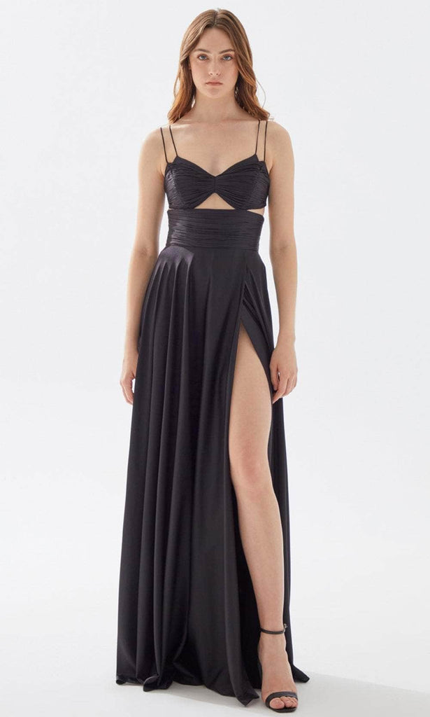 Walk down the red carpet with a flair for the romantic in this Tarik Ediz 52109 creation. Intricately textured with fine ruching gathering to texturize this ensemble, this beauty flaunts a sweetheart neckline with double spaghetti straps. Designed with a bandeau bodice and accented with cutouts and a wide waistband, the back reveals an open panel below a tie strap detail. The full-length A-line skirt flows to drapes the floor with its hemline. Make such a stunning sight to behold in this stylishly made Tarik Ediz masterpiece. Models are wearing the Black and Sunset colors.