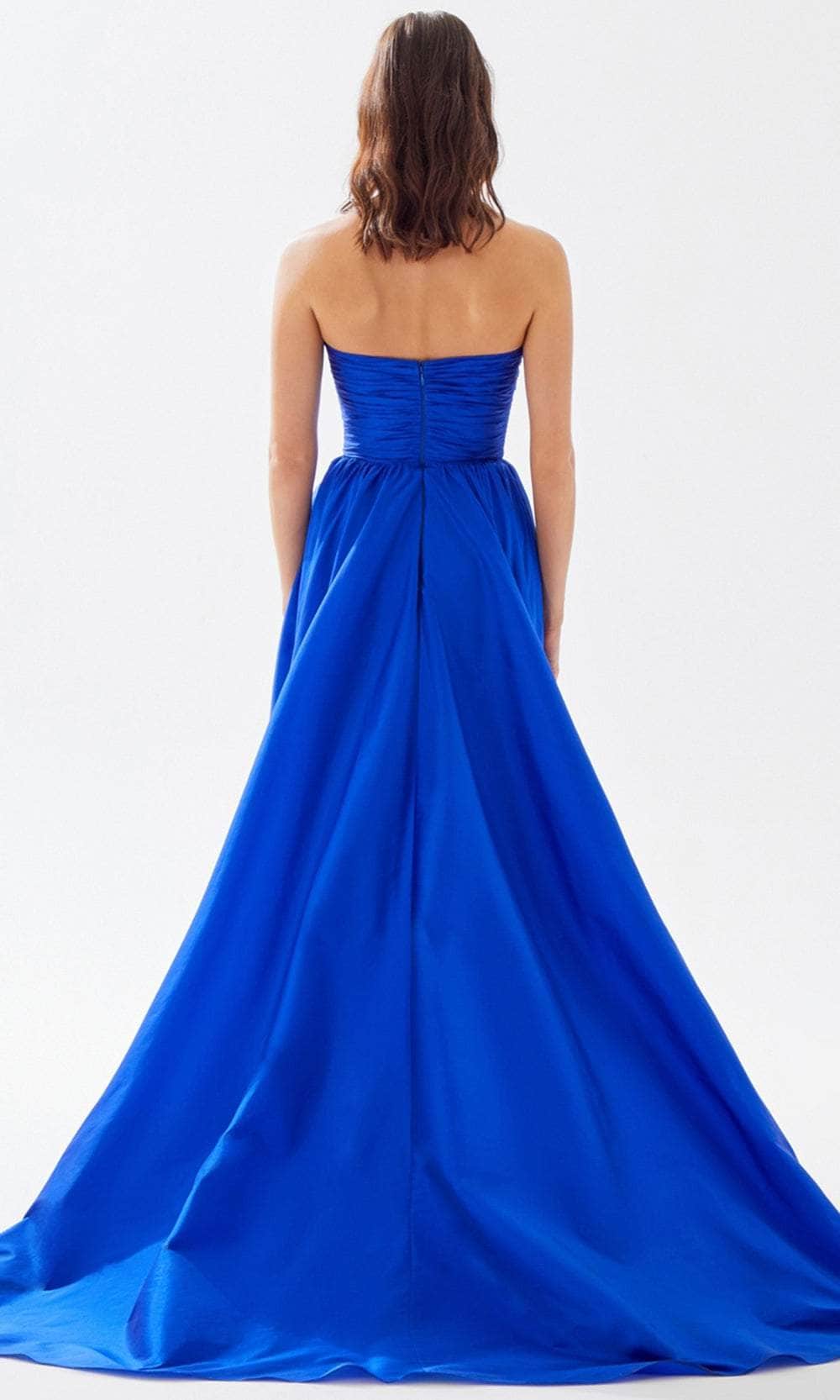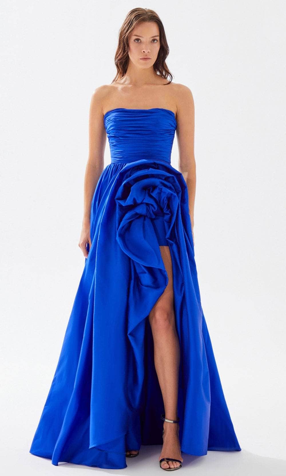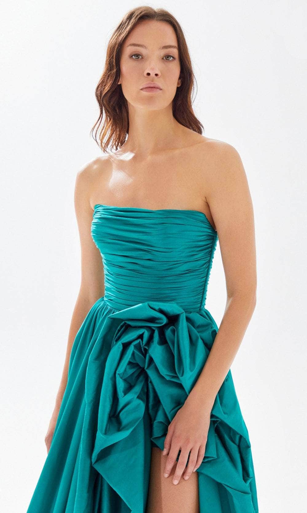 Glamour up for a night of pure bliss and romance in this ultra chic Tarik Ediz 52118 creation. Flaunting an intricate spectacle of shirring ornamenting the bodice, this piece parades a straight-across neckline on a strapless bodice. Styled with a midrise back and a concealed zipper closure, an oversized rosette detail graces the top of the high slit while the A-line skirt cascades to the floor with a court train. Bring back the luster into an idyllic night when donning this Tarik Ediz masterpiece. Models are wearing the Black, Emerald, and Royal Blue colors.