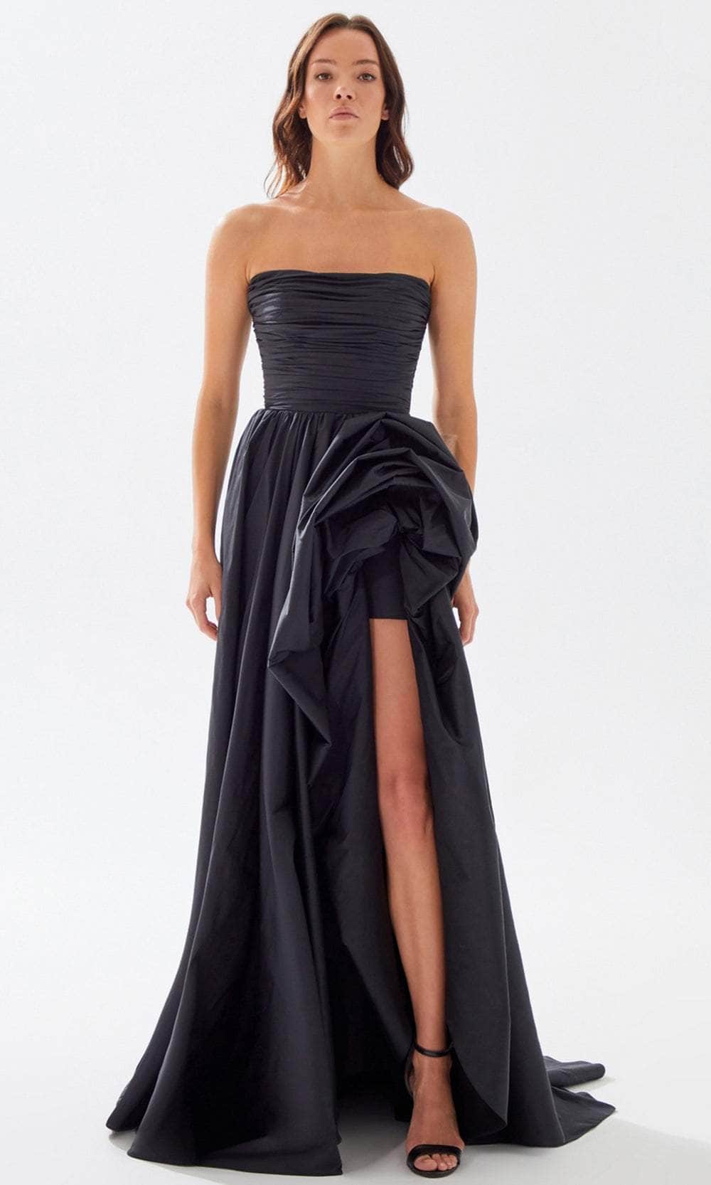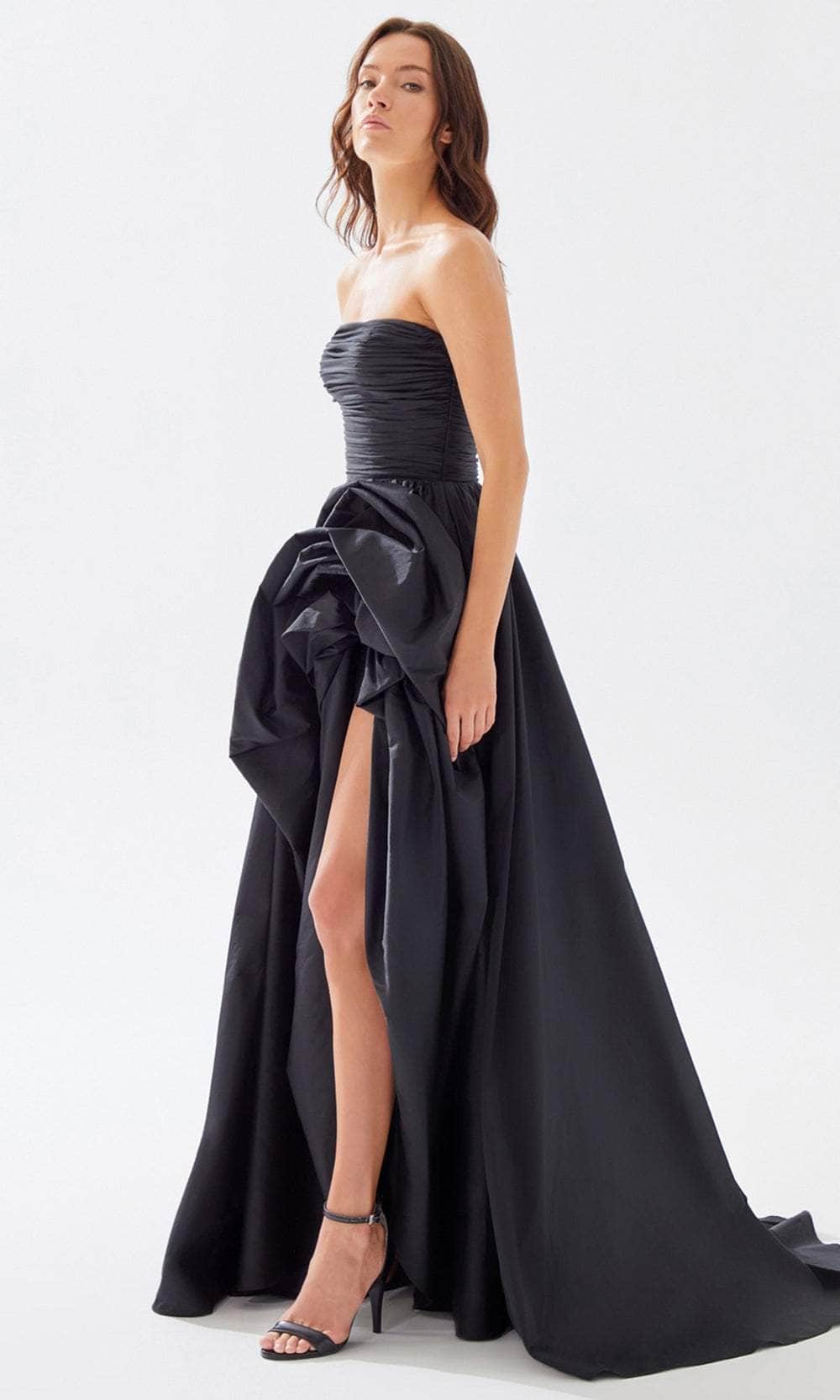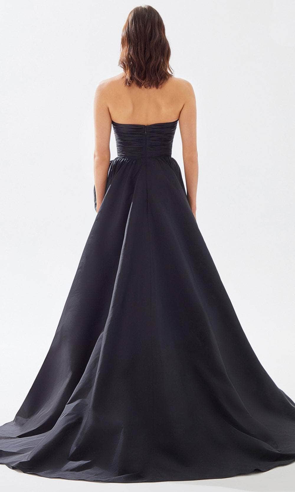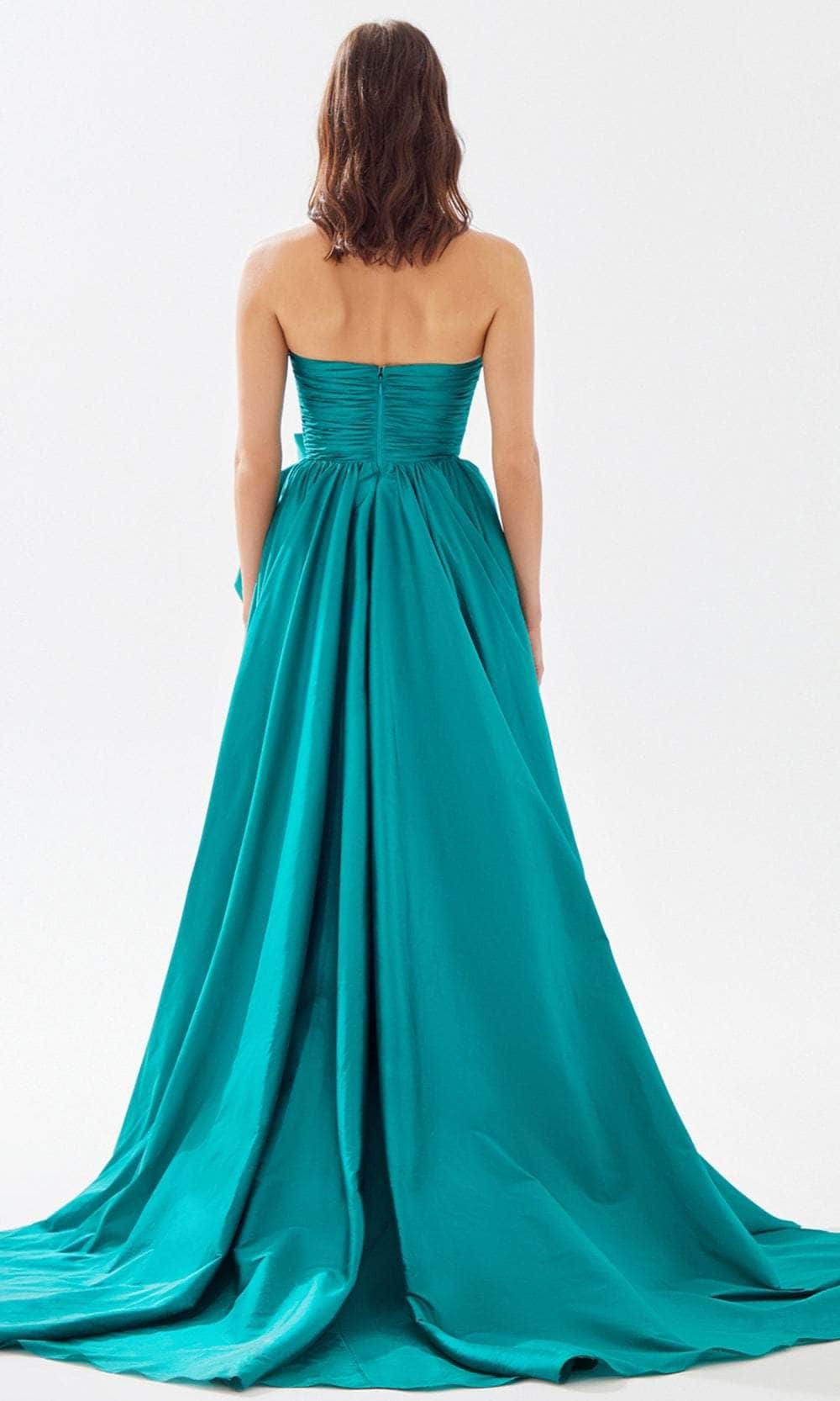 Glamour up for a night of pure bliss and romance in this ultra chic Tarik Ediz 52118 creation. Flaunting an intricate spectacle of shirring ornamenting the bodice, this piece parades a straight-across neckline on a strapless bodice. Styled with a midrise back and a concealed zipper closure, an oversized rosette detail graces the top of the high slit while the A-line skirt cascades to the floor with a court train. Bring back the luster into an idyllic night when donning this Tarik Ediz masterpiece. Models are wearing the Black, Emerald, and Royal Blue colors.