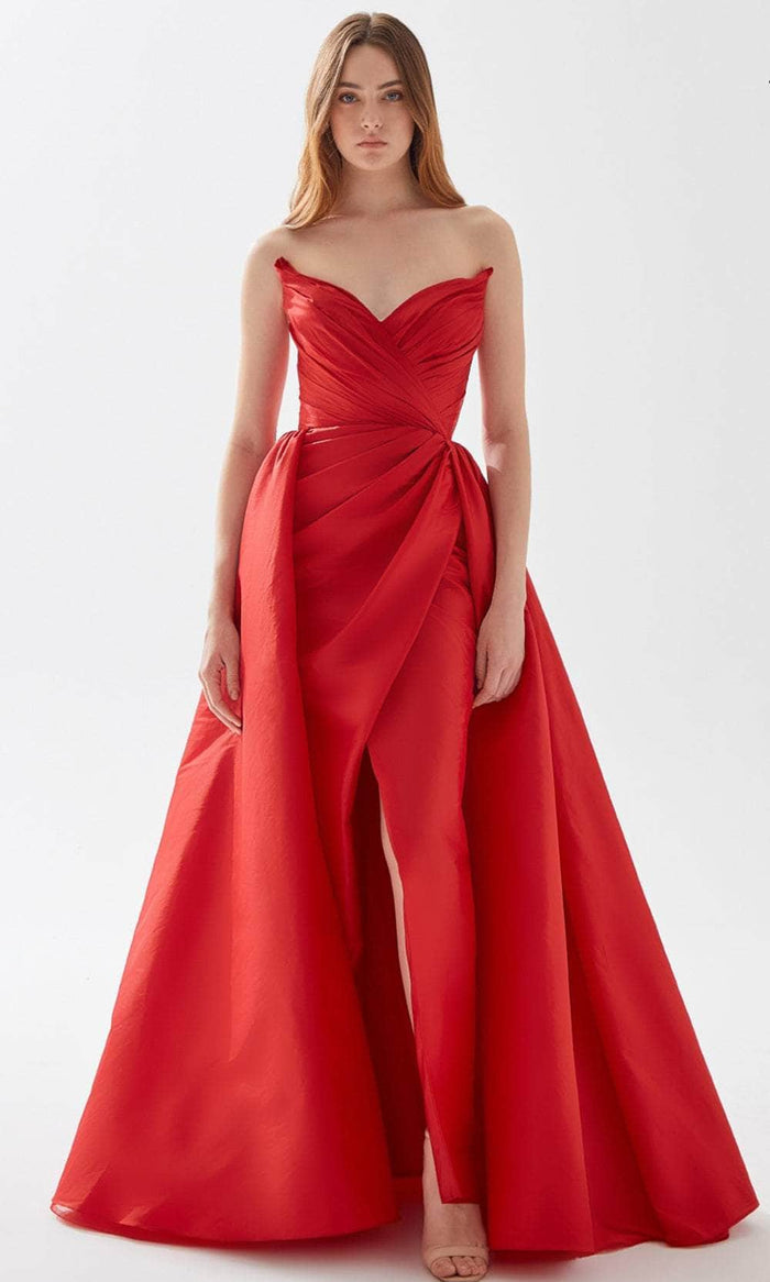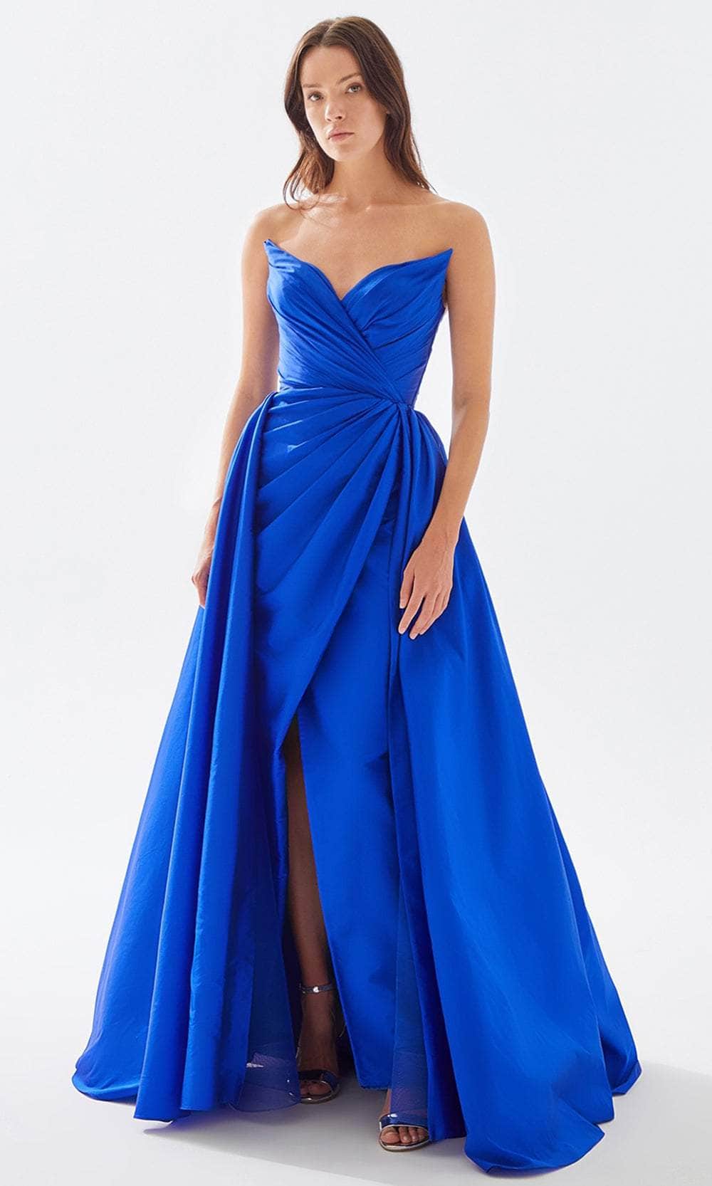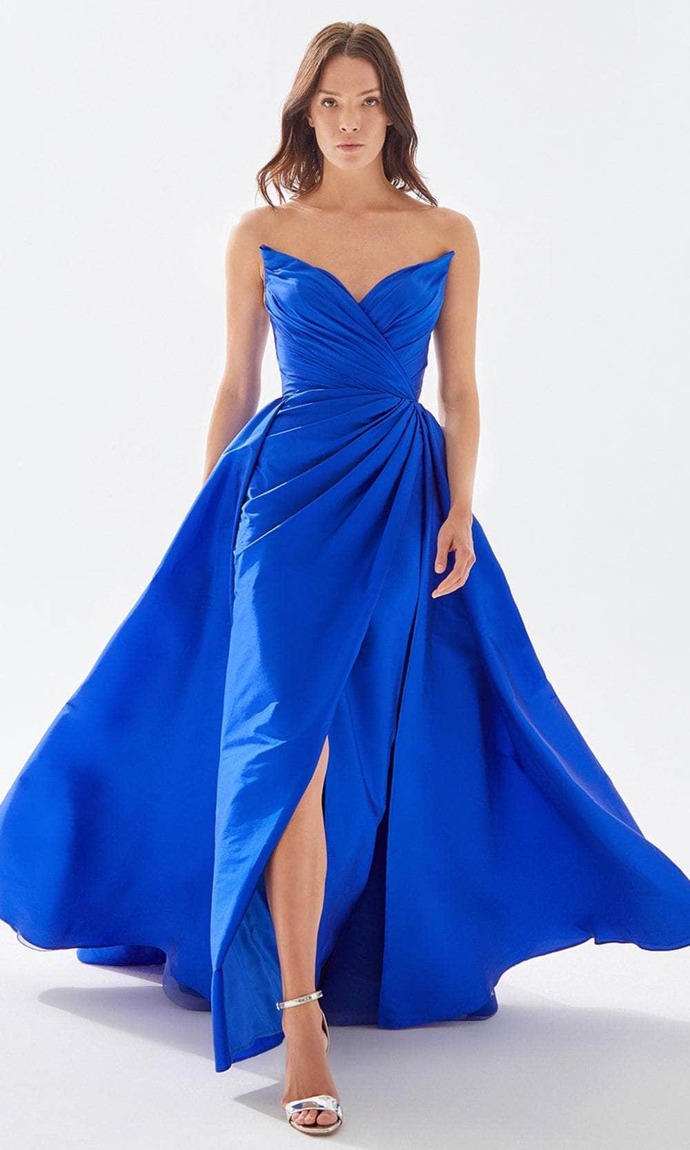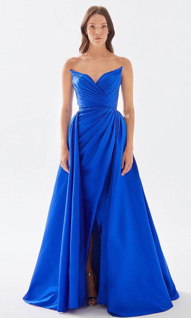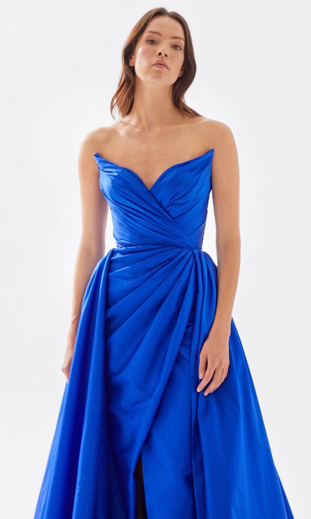 Embrace a classic sense of style in this engaging evening gown by Tarik Ediz 52126. Imposing in a regal fashion, this magnificent ensemble is ideal for your grand entrance. The strapless bodice impressed with artfully pleated detail in a faux wrap style, topped with a V neckline. From the tapered waist, the skirt billows out into a dramating A line overskirt, styled with diagonal pleats that tuck into the waist, revealing a high front slit. Fall in love with the sheer elegance of this Tarik Ediz 52126 creation. Models are wearing Royal Blue, Red and Emerald colors.