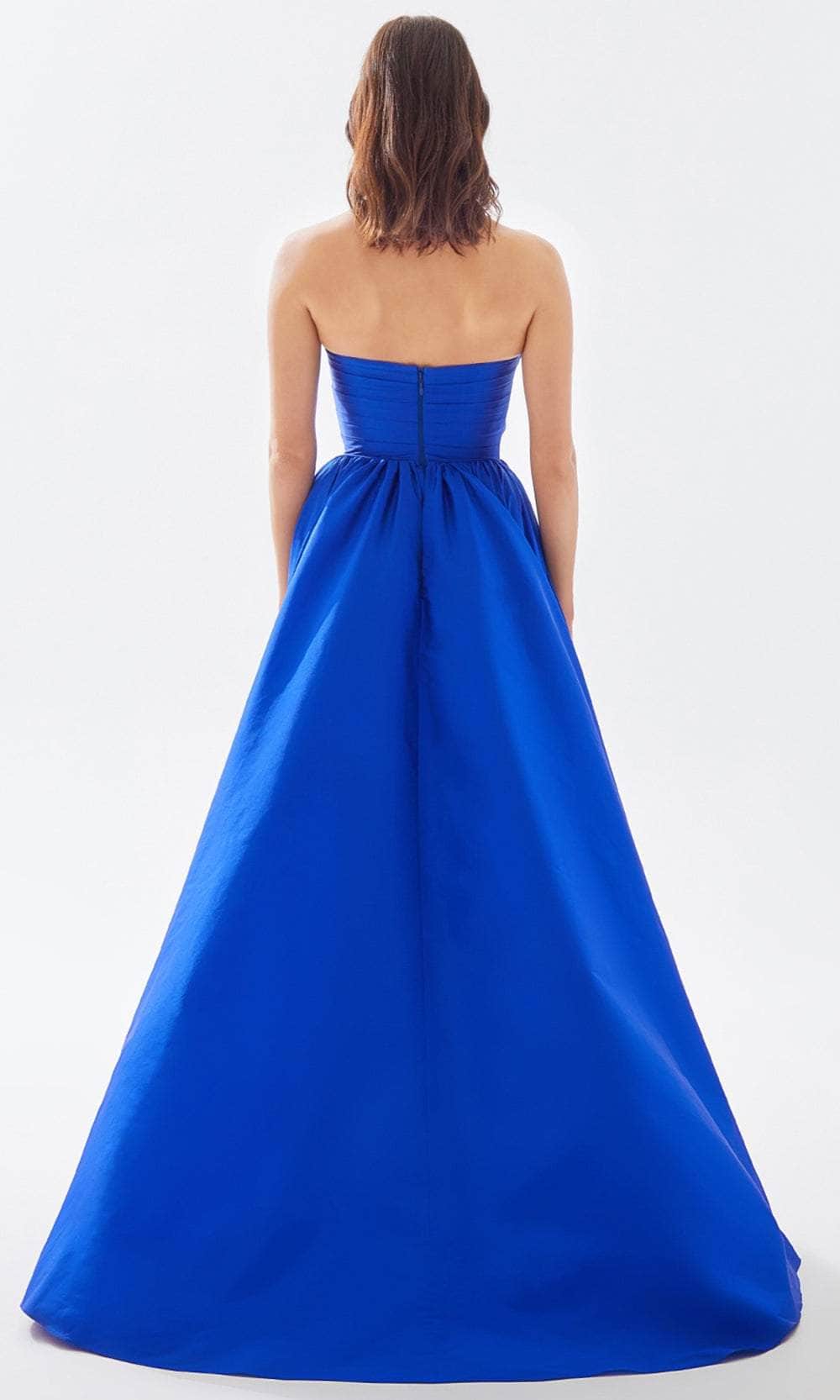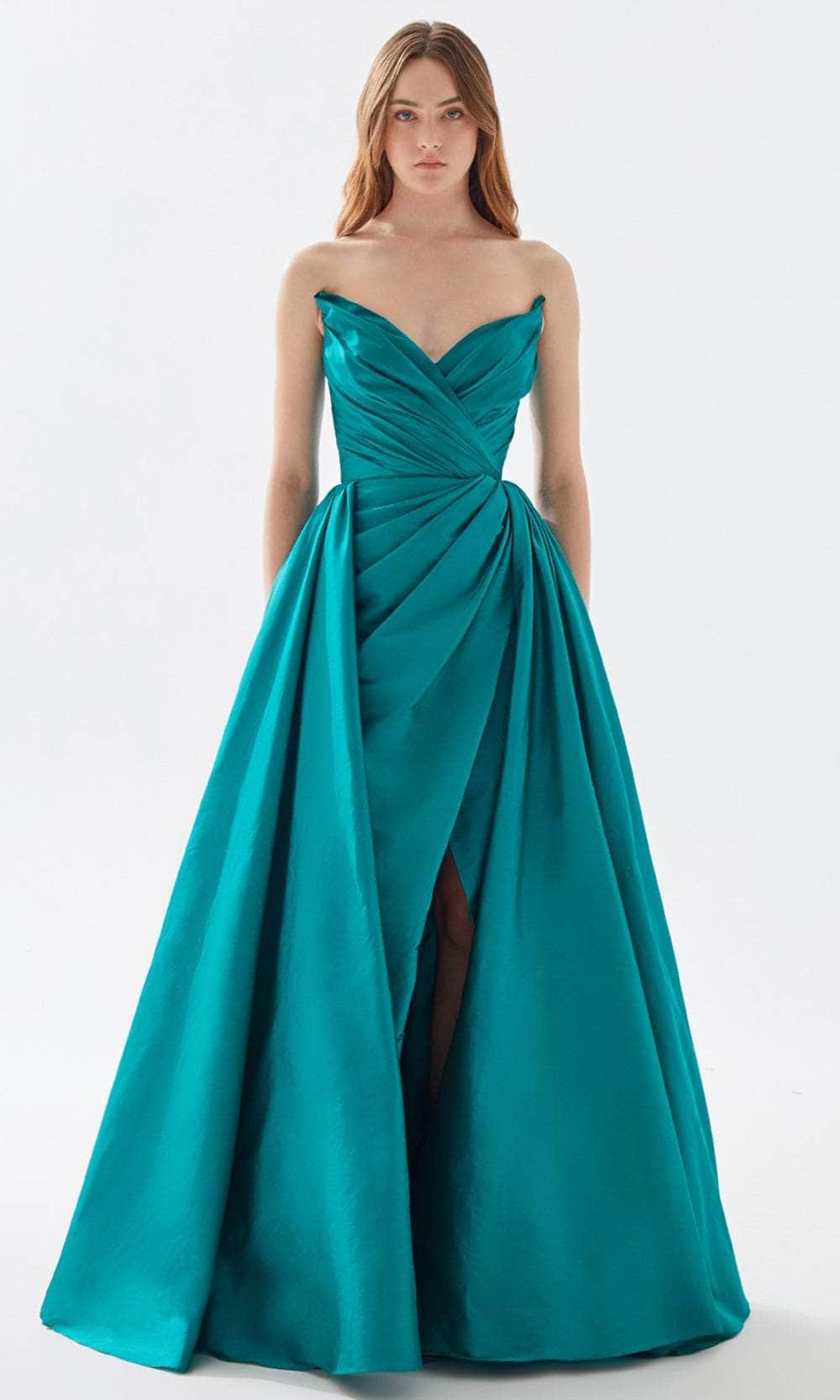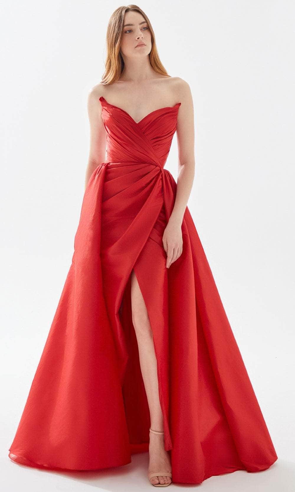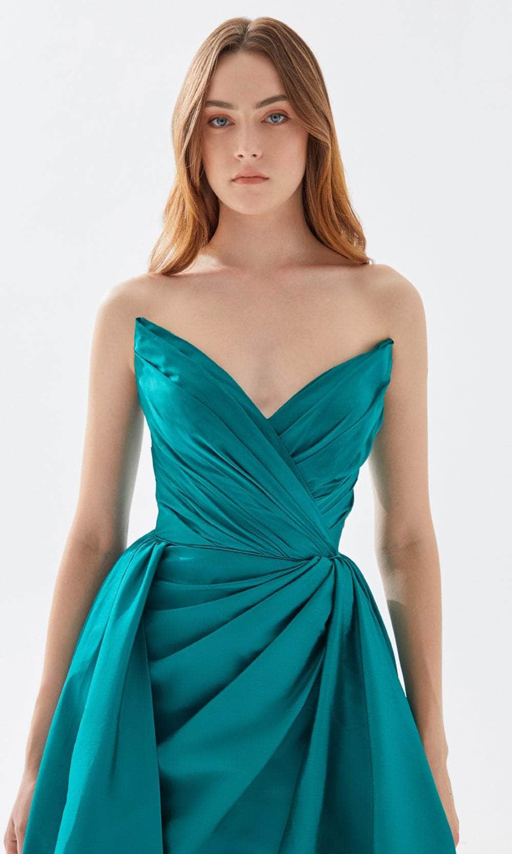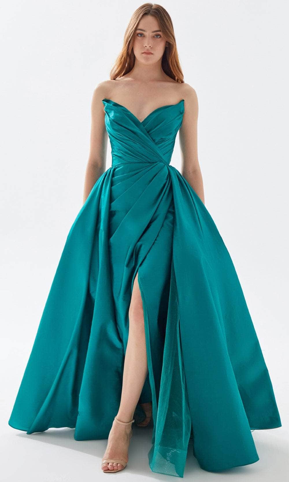 Embrace a classic sense of style in this engaging evening gown by Tarik Ediz 52126. Imposing in a regal fashion, this magnificent ensemble is ideal for your grand entrance. The strapless bodice impressed with artfully pleated detail in a faux wrap style, topped with a V neckline. From the tapered waist, the skirt billows out into a dramating A line overskirt, styled with diagonal pleats that tuck into the waist, revealing a high front slit. Fall in love with the sheer elegance of this Tarik Ediz 52126 creation. Models are wearing Royal Blue, Red and Emerald colors.