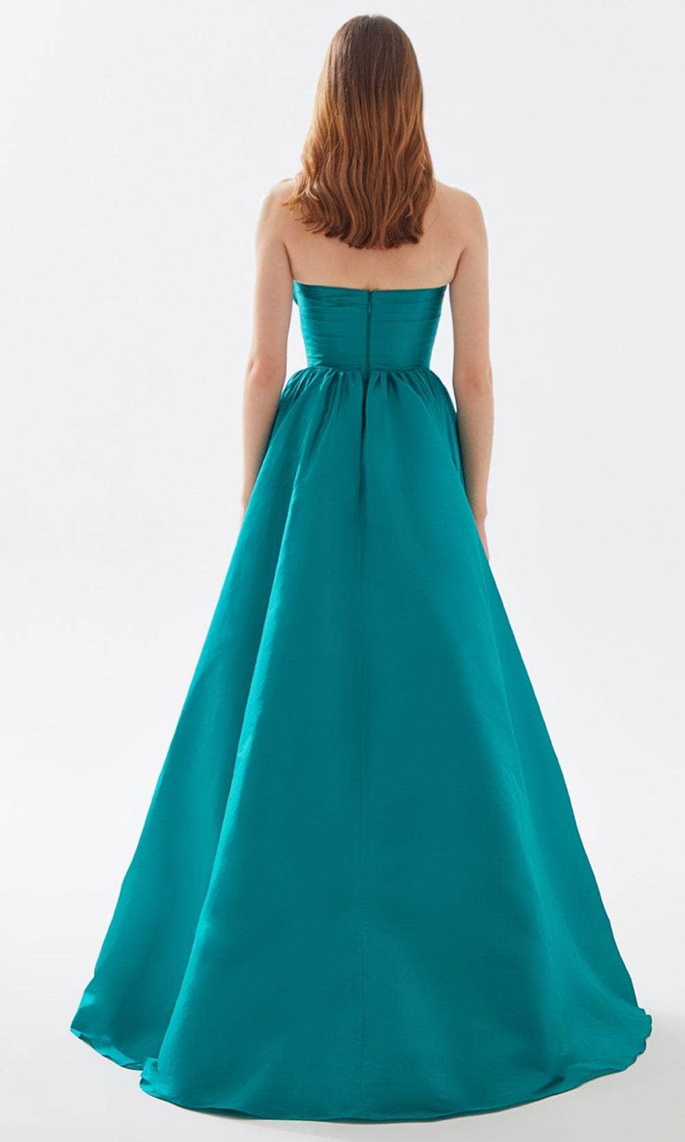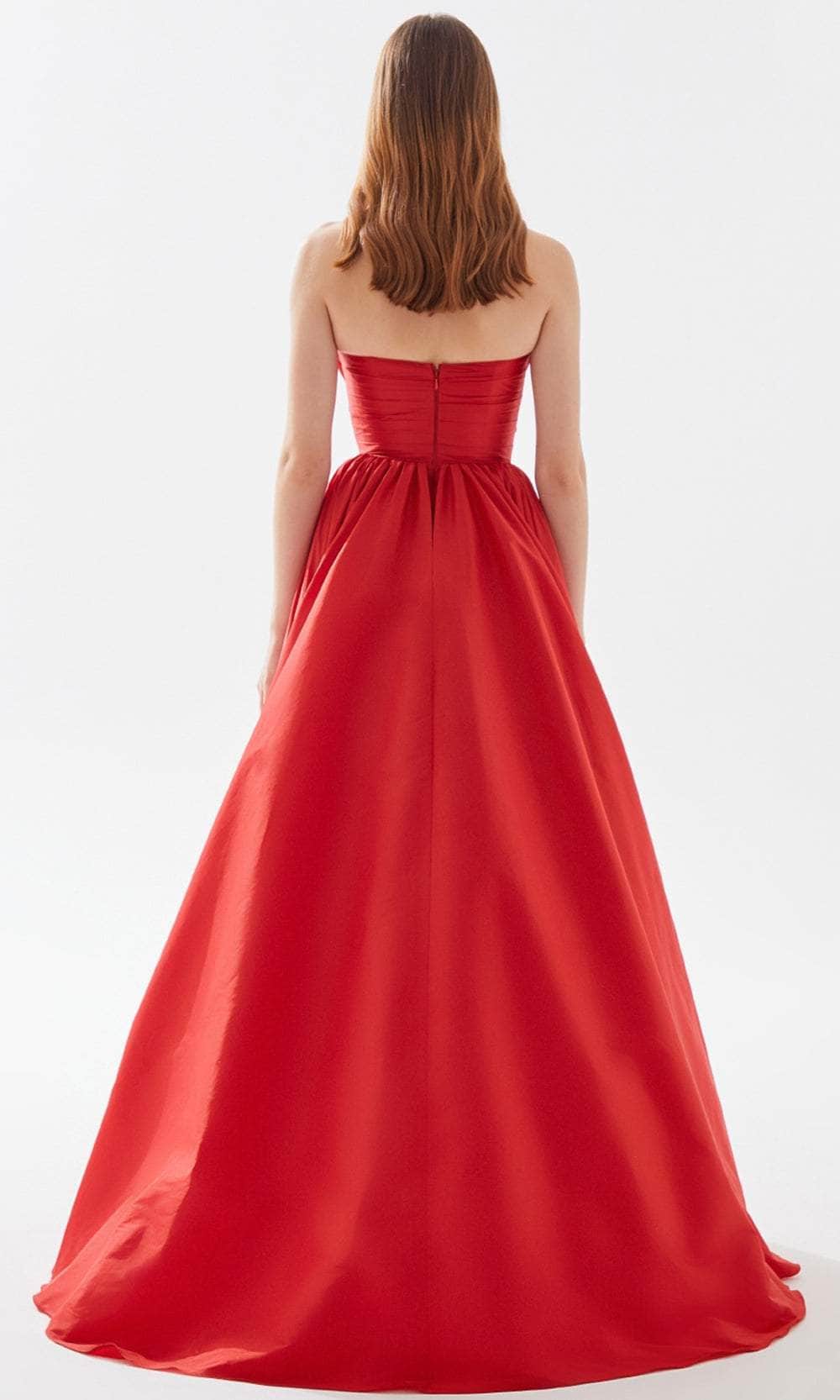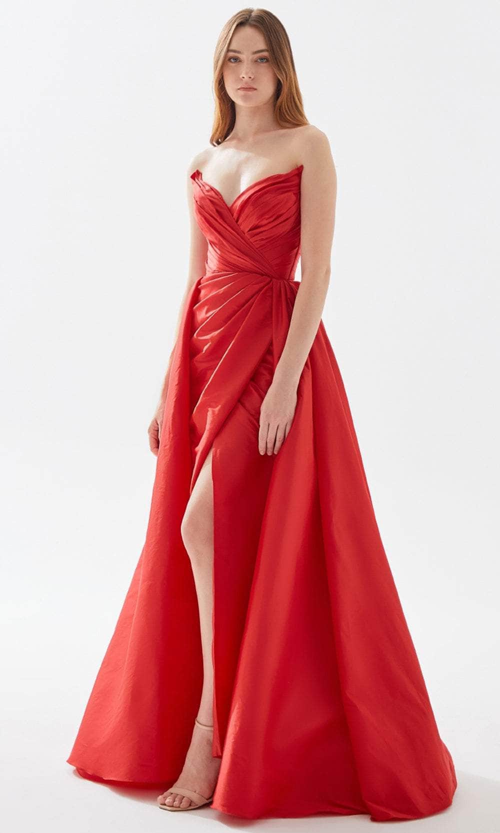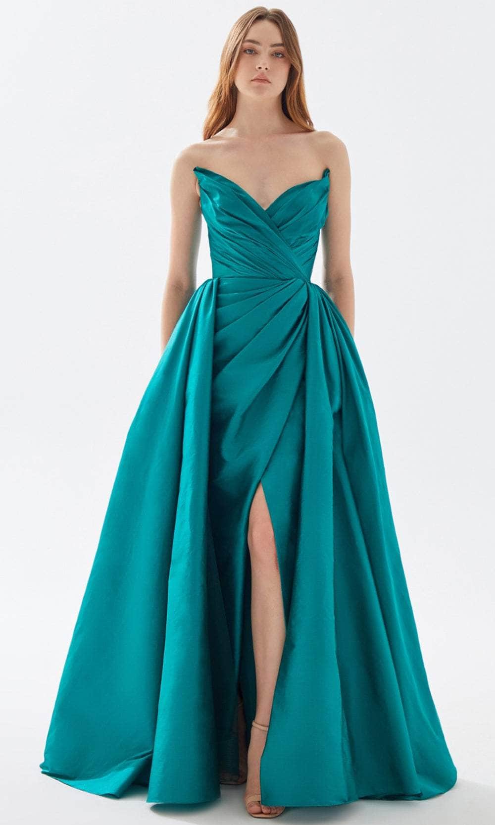 Embrace a classic sense of style in this engaging evening gown by Tarik Ediz 52126. Imposing in a regal fashion, this magnificent ensemble is ideal for your grand entrance. The strapless bodice impressed with artfully pleated detail in a faux wrap style, topped with a V neckline. From the tapered waist, the skirt billows out into a dramating A line overskirt, styled with diagonal pleats that tuck into the waist, revealing a high front slit. Fall in love with the sheer elegance of this Tarik Ediz 52126 creation. Models are wearing Royal Blue, Red and Emerald colors.