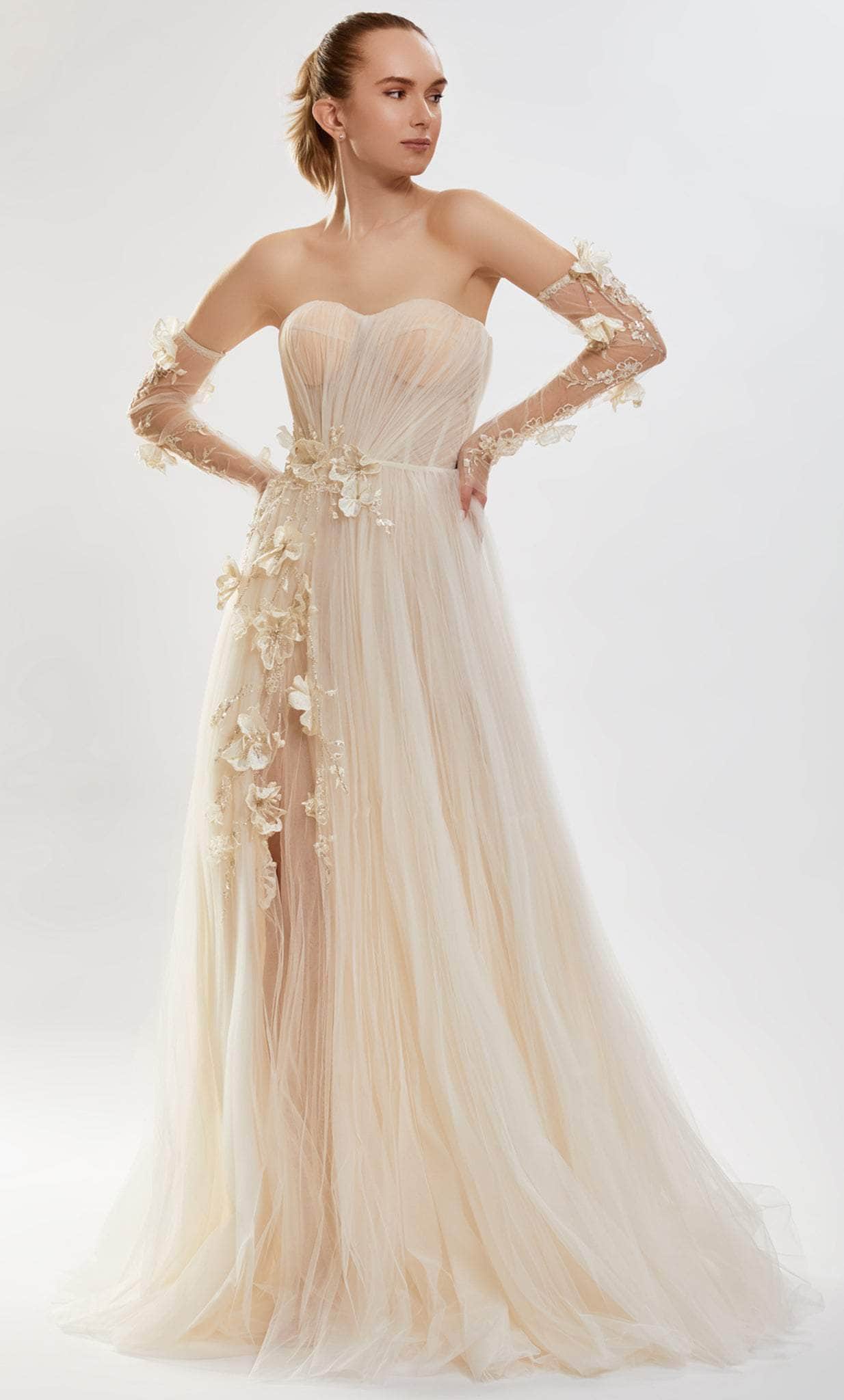 Be strikingly gorgeous in Tarik Ediz 52149 design. This magnificent dress creation features a sweetheart neckline and three-dimensional floral embellishments on the corset bodice and is secured with a back zipper from behind. The design follows down a voluminous skirt embedded with floral details and also contains a slit and finishes with a sweep train on the A-line silhouette. This 52149 will definitely bring out the goddess in you! Embellished gloves are sold separately.