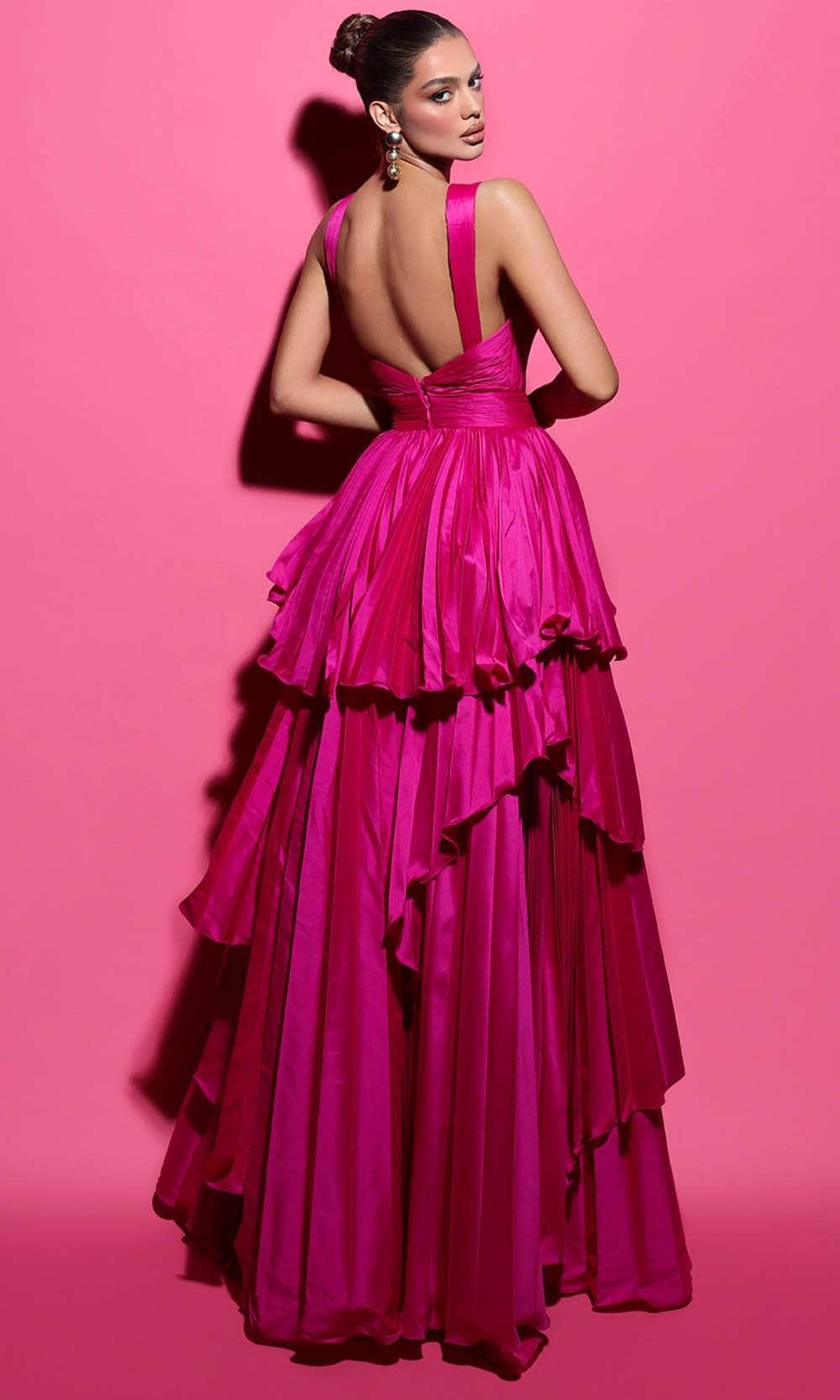 Showcase your fabulous vibe with the stunning Tarik Ediz 53036 evening gown. Crafted from taffeta fabric, this sleeveless ensemble features ruching details on the top bodice, a plunging V-neckline, a banded waist, and wide shoulder straps. The daring open back reveals just the right amount of skin, secured by the hidden zipper closure. The A-line skirt gracefully cascades to the floor, adorned with a thigh-high leg slit and pleated tiers that radiate luxury and magnificence. You embody a breath of fresh air in this dreamy Tarik Ediz 53036 masterpiece.Models are wearing the Powder, Orchid, and Mint colors.