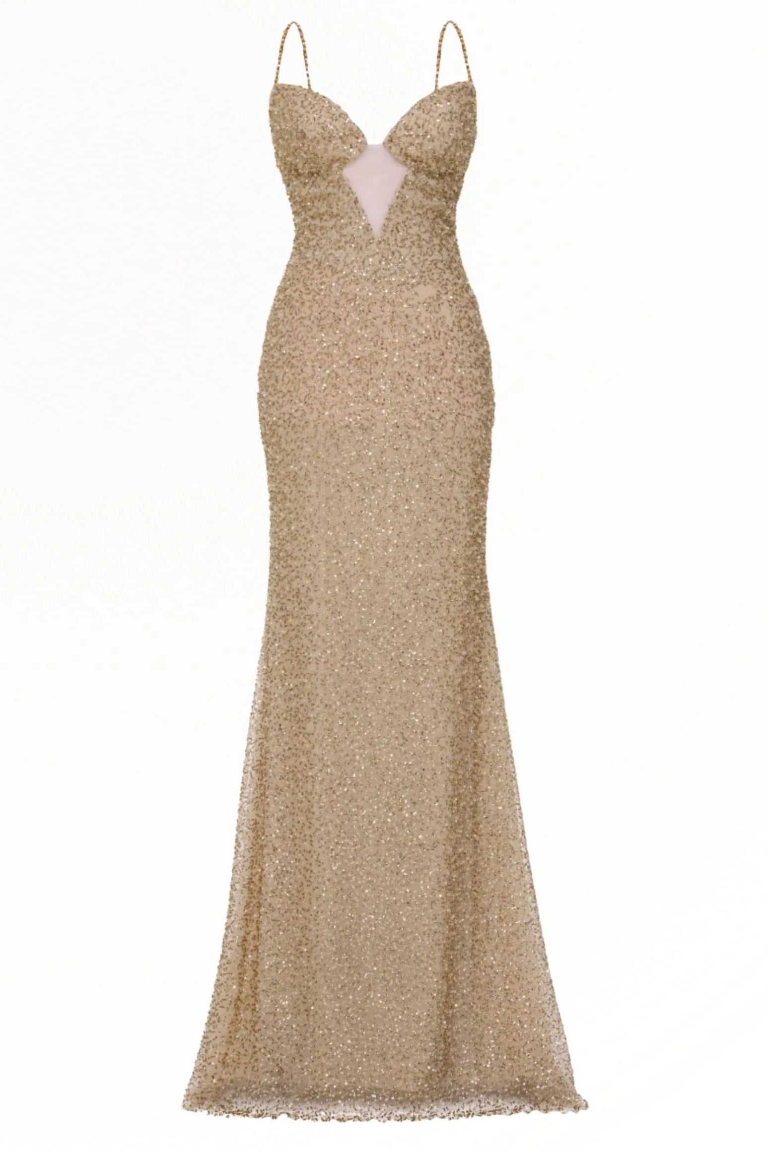 | Details: | Sleeveless, Spaghetti Straps, Illusion Cutout, Sequin, Open Back, Back Zipper, Sweep Train |