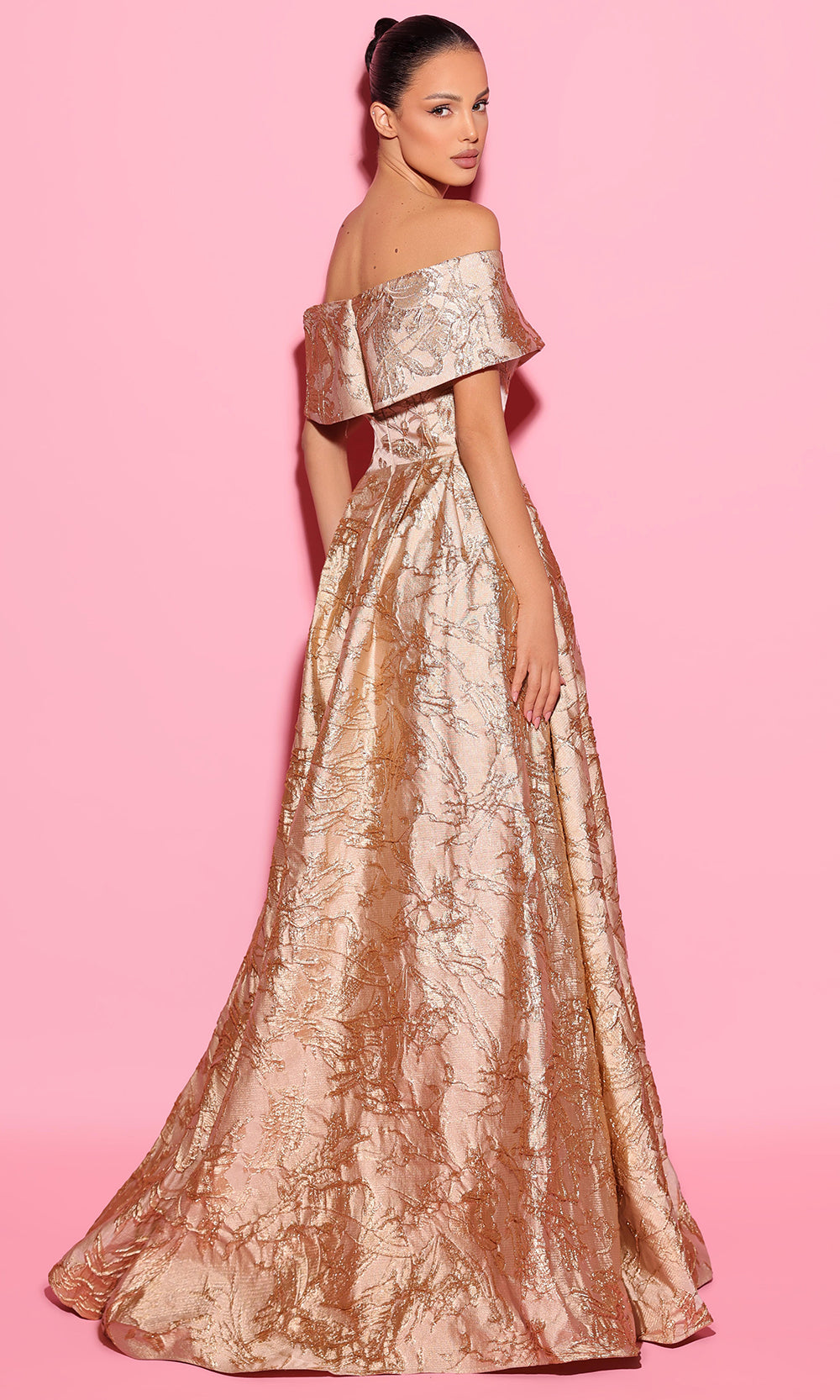 Make a dramatic entrance in Tarik Ediz 55082, a long jacquard gown that blends couture detail with classic grace. The off-shoulder neckline is framed by a fold-over accent and deep overlapped center, creating a striking focal point. A seam-fitted bodice enhances the silhouette, while the natural waistline transitions into a box-pleated A-line skirt with a bold high slit. Completed with a concealed back zipper, this gown is ideal for prom celebrations, gala evenings, or red-carpet events. Tarik Ediz 55082 radiates polished glamour. Model is wearing Gold color.