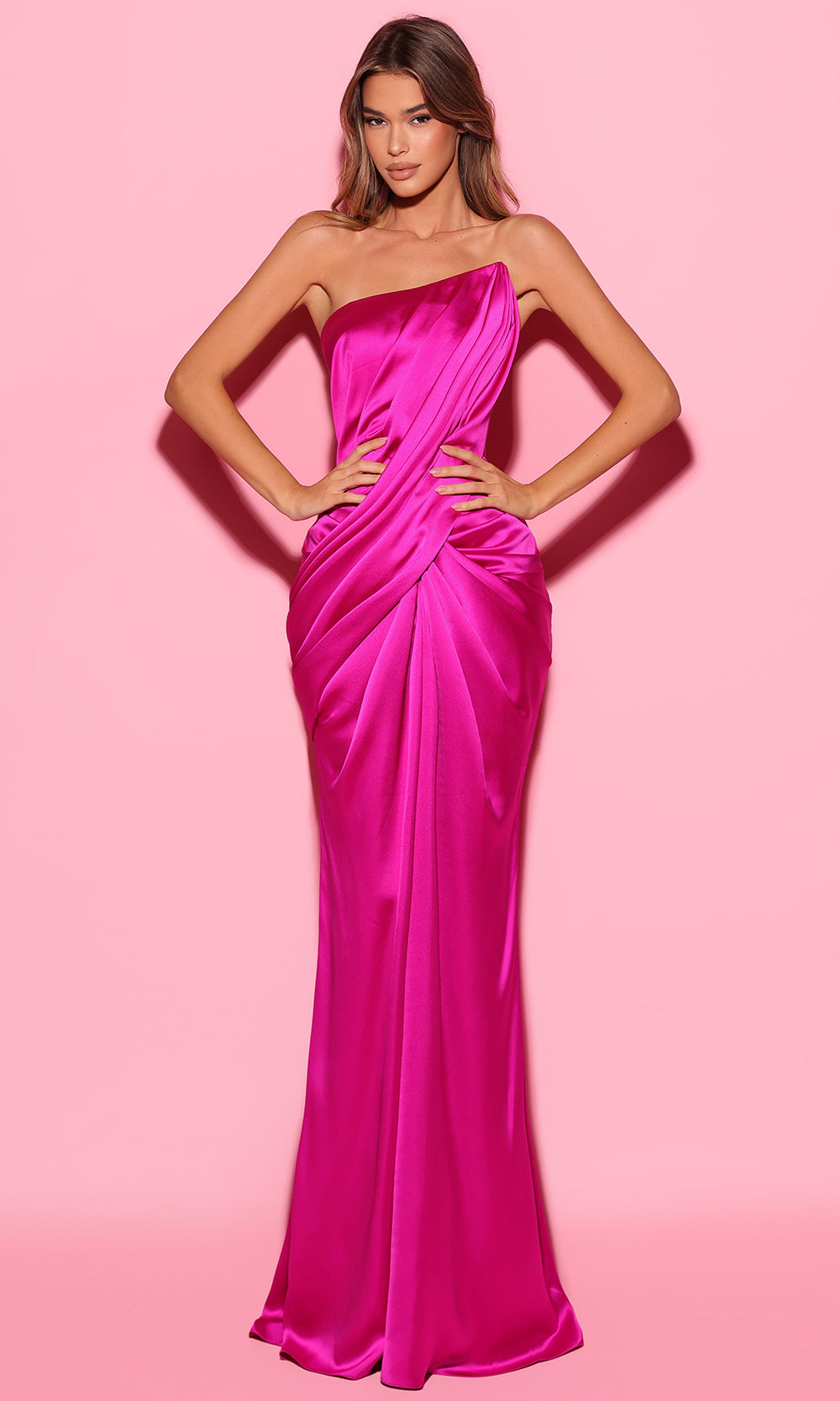 | Details: | Strapless, Drape Pleats, Sash accent, Mid-open back, Concealed back zipper, Form fitting |