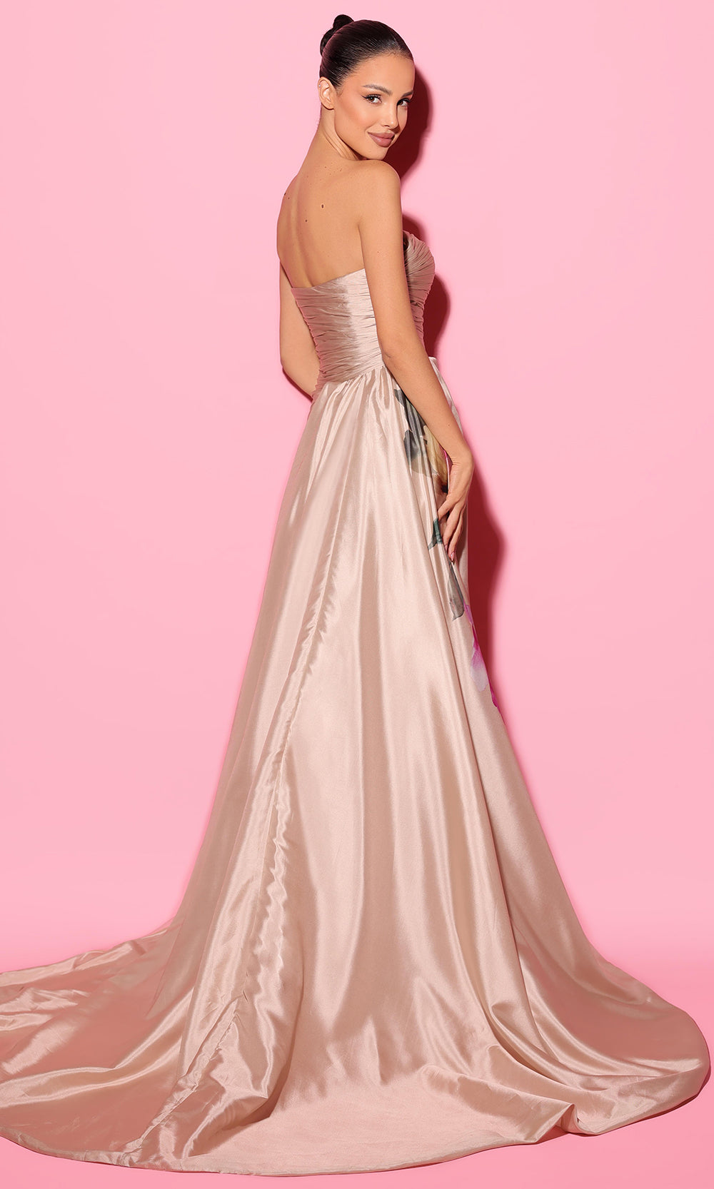 | Details: | Floral Print, Strapless, Ruching, High leg slit, Fitted bodice, Mid-Open back, Sweep train |
