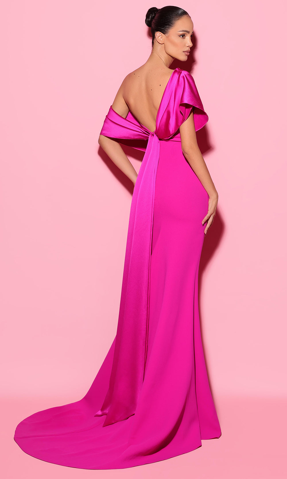 Bold design meets refined detail in Tarik Ediz 55122, a satin and crepe gown crafted for unforgettable entrances. The off?shoulder asymmetric drape fully covers the bodice, sculpting the figure with dramatic precision. Fitted through the hips, the skirt flares into a mermaid silhouette with a graceful sweep train. At the back, a striking open design is highlighted by a tie?ribbon with an extended tail. Completed with couture finish, Tarik Ediz 55122 is ideal for galas, prom nights, or upscale soirées, offering both drama and elegance. Model is wearing Fuchsia color.