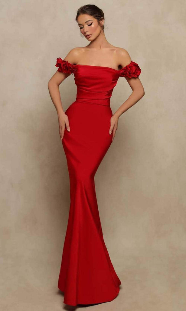 Flaunt your fabulous curves in this mesmerizing evening gown by Tarik Ediz 98016. Featuring a lightly ruched bodice, this full length evening gown has a straight neckline and off-shoulder sleeves with rose ruffle detail. The skirt is sleek and sophisticated, hugging the curves in a sheath silhouette. This Tarik Ediz 98016 creation is truly a definition of glamour. Model is wearing the Red color.
