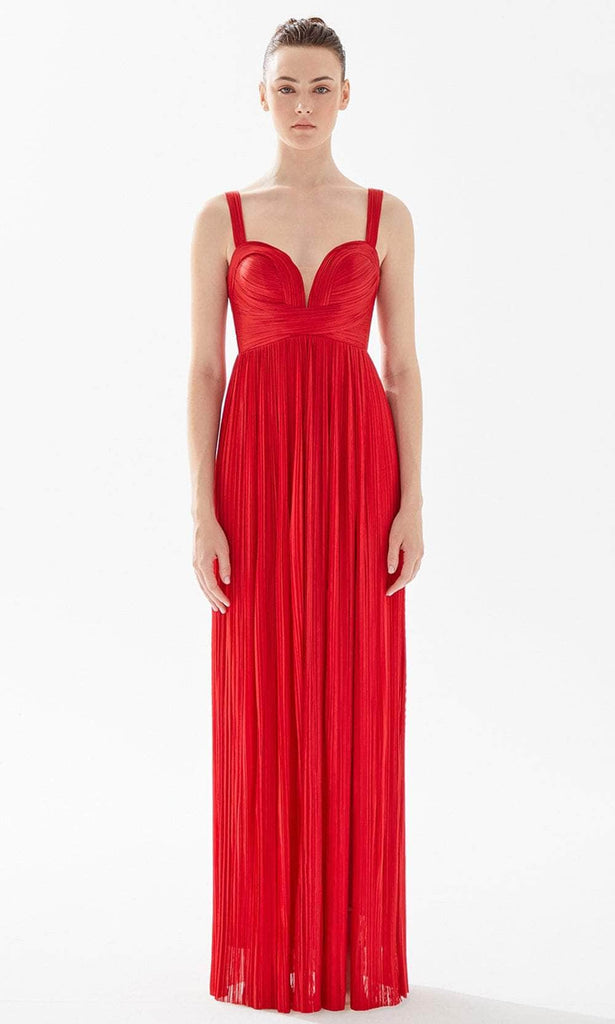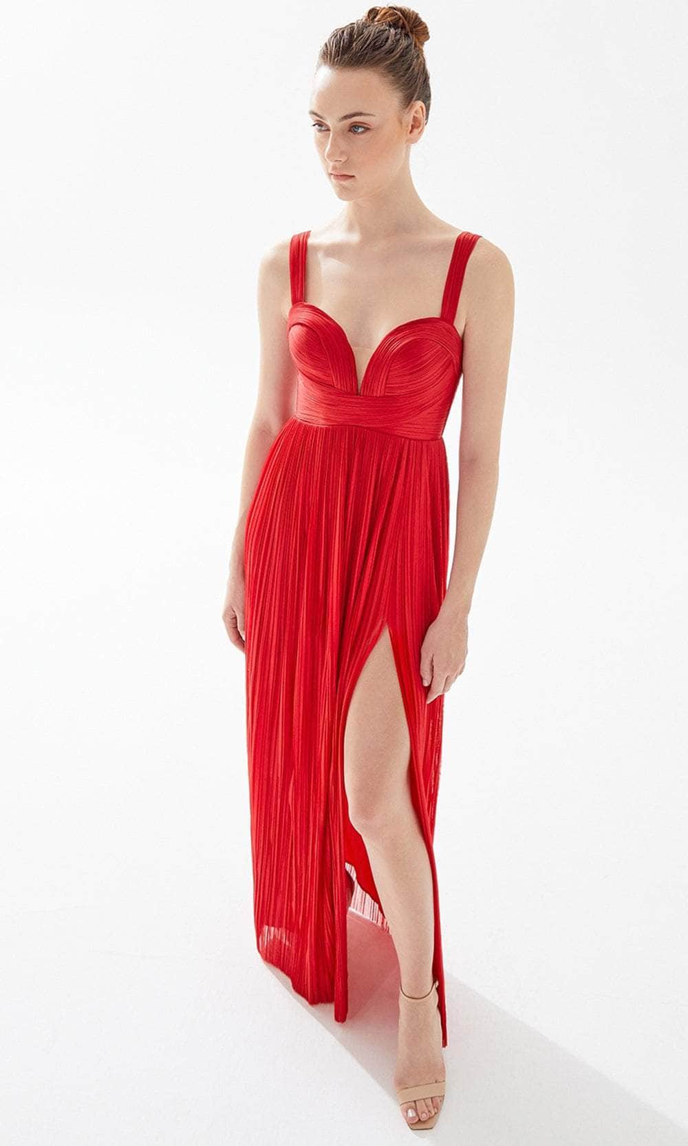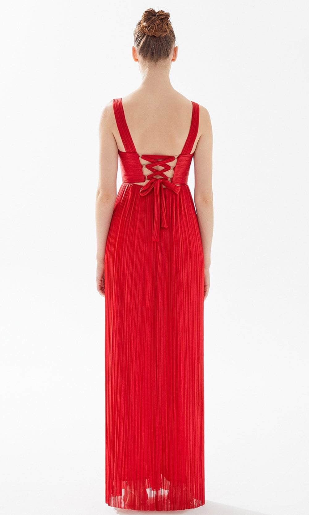 Show off your classy style when you wear this design from Tarik Ediz 98216. Rendered with fine pleated details, this chic gown showcases a sleeveless bodice crowned by a deep sweetheart neckline and wide shoulder straps. Nipped with a lace-up back, the skirt creates a A-line silhouette streaming elegantly to a full length hem. This Tarik Ediz 98216 creation is a stunning choice for prom, semi formals or any occasion. Model is wearing the Red color.