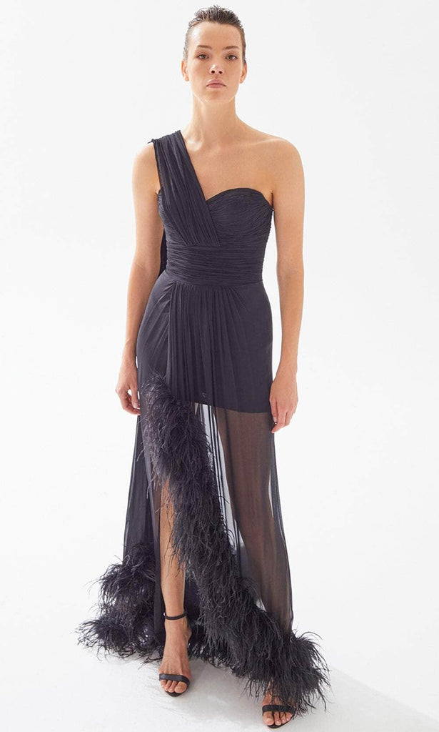 Be ready to fascinate everyone in this dress by Tarik Ediz 98224. Fabricated from chiffon, which is a comfortable and supple fabric that also manages to give off a flowy impression. A sweetheart neckline and a single shoulder strap are fashioned on a ruched bodice in this dress. The sheath-like form of the skirt is see-through, and it features a high slit that is highlighted with feather details. This Tarik Ediz 98224 is awesome for prom or for any special night event! Model is wearing a Stone color.