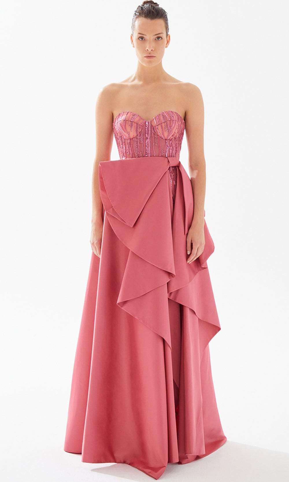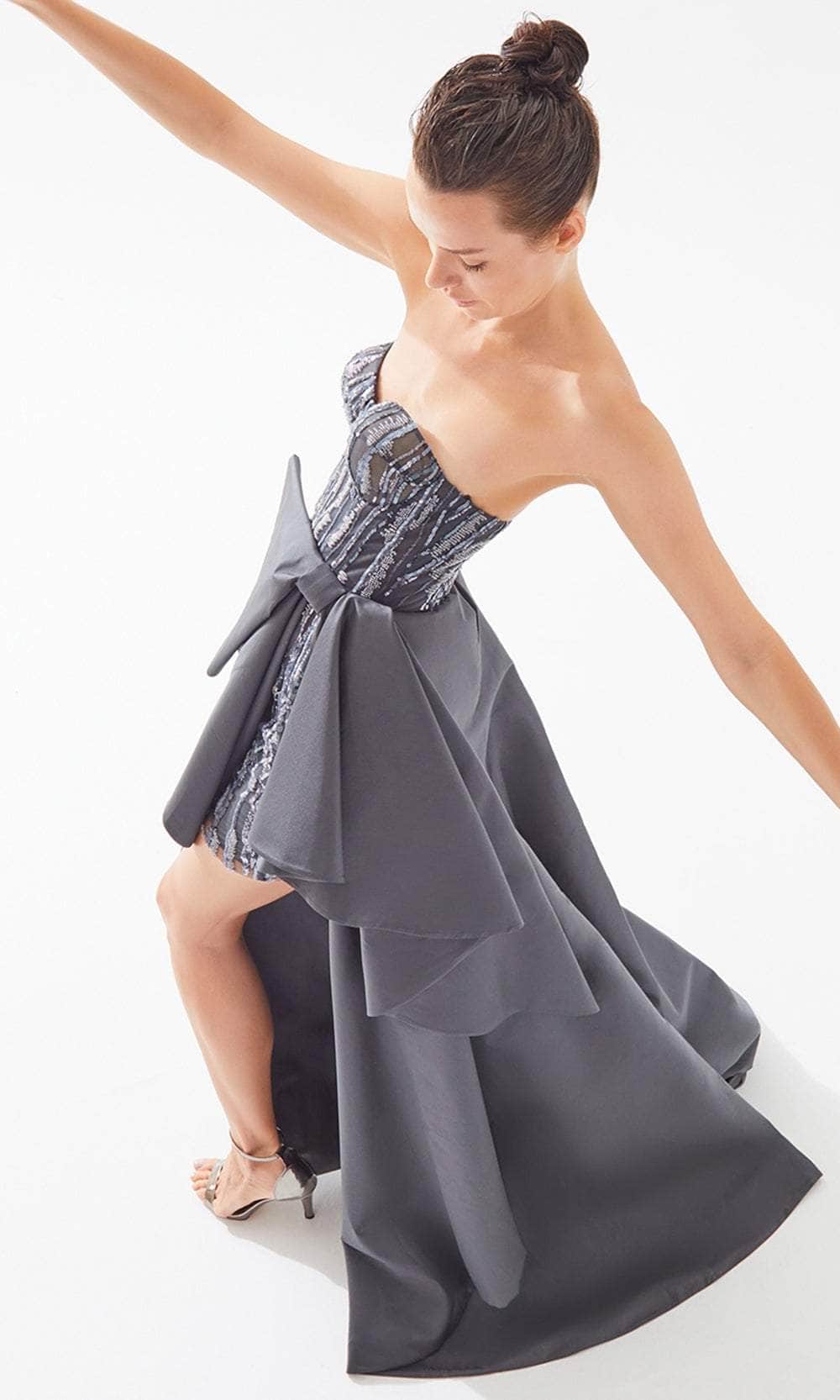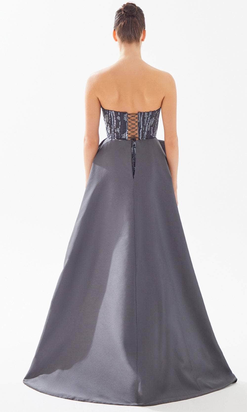 You are more than gorgeous when you wear this unbeatable evening gown from Tarik Ediz 98270. Beautifully encrusted with beadwork and sequin on the strapless bodice, this style features a sweetheart neckline and a mid-open lace-up back. The taffeta A-line skirt highlights a large bow accent from the waist and creates a ruffle draped flowing to the full length hem, completed in a sweeping train. Create magical moments as you revel in Tarik Ediz 98270 creation. Models are wearing the Rose and Anthracite colors.