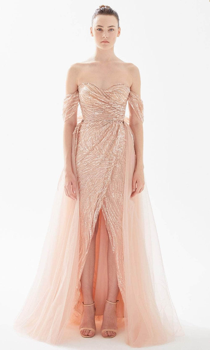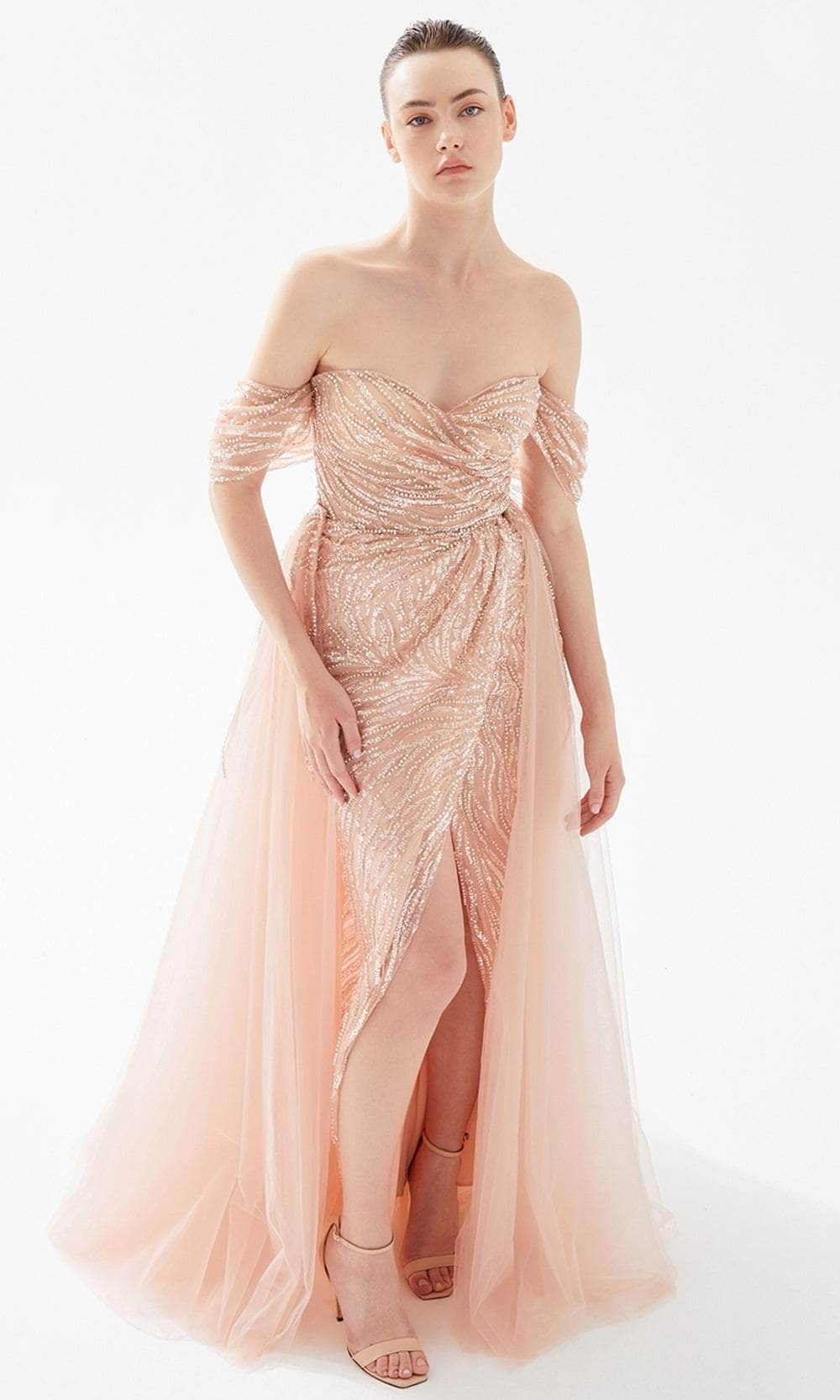 Scintillate with the elegance of ethereal goddesses in this fascinatingly ornate Tarik Ediz 98309 Evening Gown. Sparkling with tiny jewels on sheer overlay, this ensemble presents a strapless sweetheart neckline and off-shoulder drape sleeves and sculpted bodice and gathered ruched on the fitted waist. The gowns sheath skirt allow you to displays those sexy legs with its high front slit opening. This magnificent creation is completed by a sheer overskirt that flows softly in magnificent waves as it brushes down the floor with a sweep of train. Effortlessly stand out among the finest beauties of the night in this impeccable Tarik Ediz 98309 Evening Gown. Model is wearing the dress in Powder color.