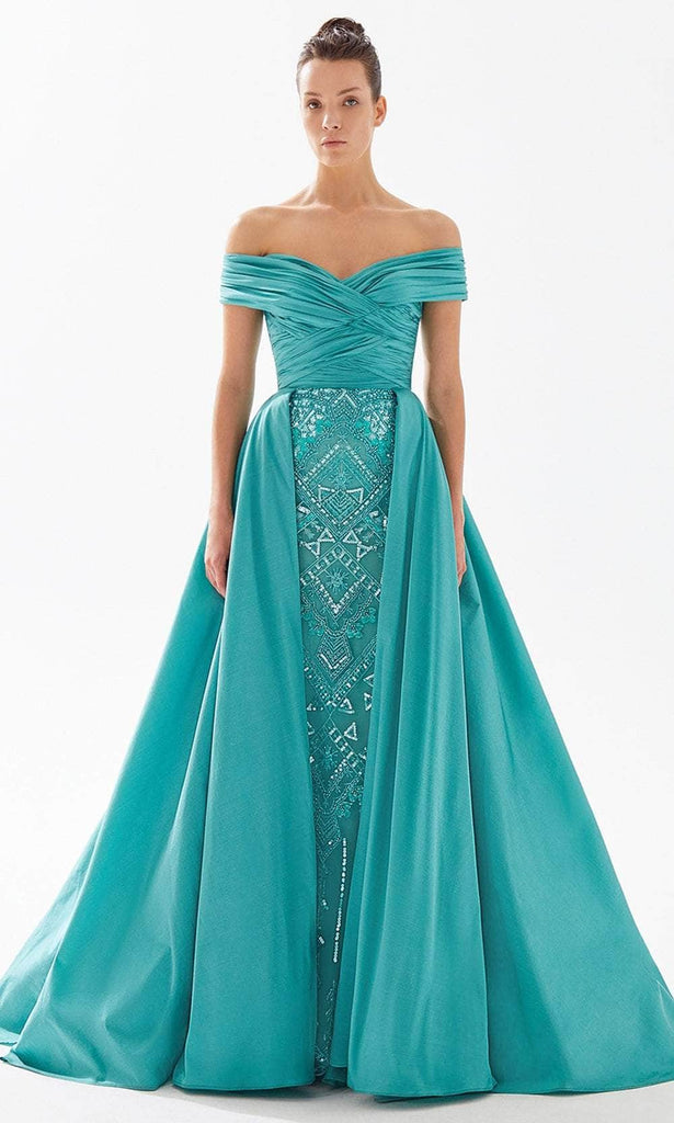 Exude extraordinary class in this stunning Tarik Ediz 98333 Evening Gown. This gown features an off-shoulder neckline traversing into slim sleeves on a ruched, crisscross fitted bodice. The dress has a sculpted cinched waist and full-length sheath skirt that is designed with gallant arrangements of beaded embellishment while the ballgown silhouette overskirt add a magnificent finish to this spectacular ensemble. Revel in the captivating prowess of this remarkable design from this year’s Evening Gown collection of Tarik Ediz. Model is wearing the dress in Nil Green color.