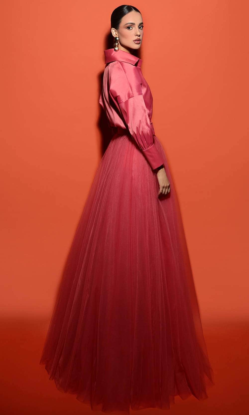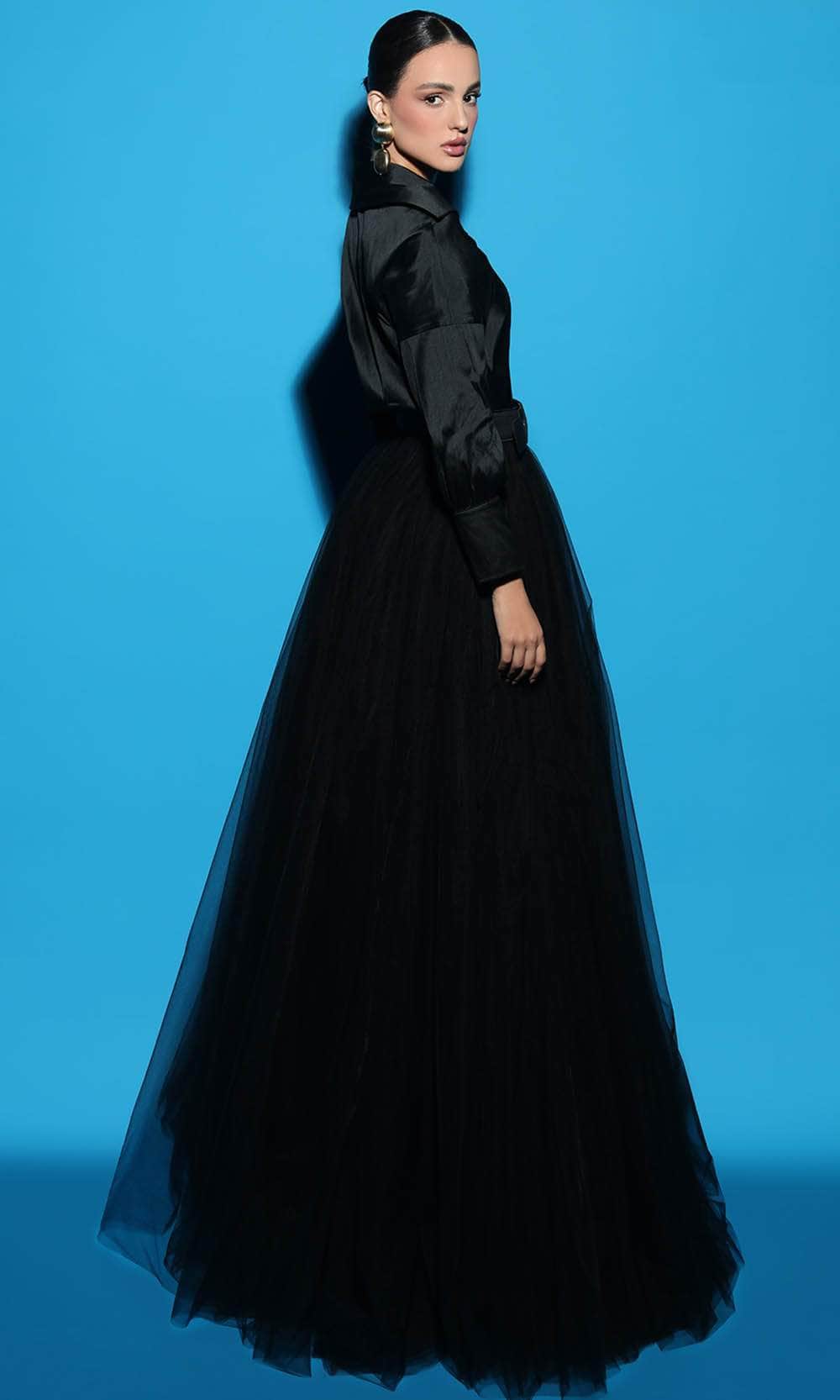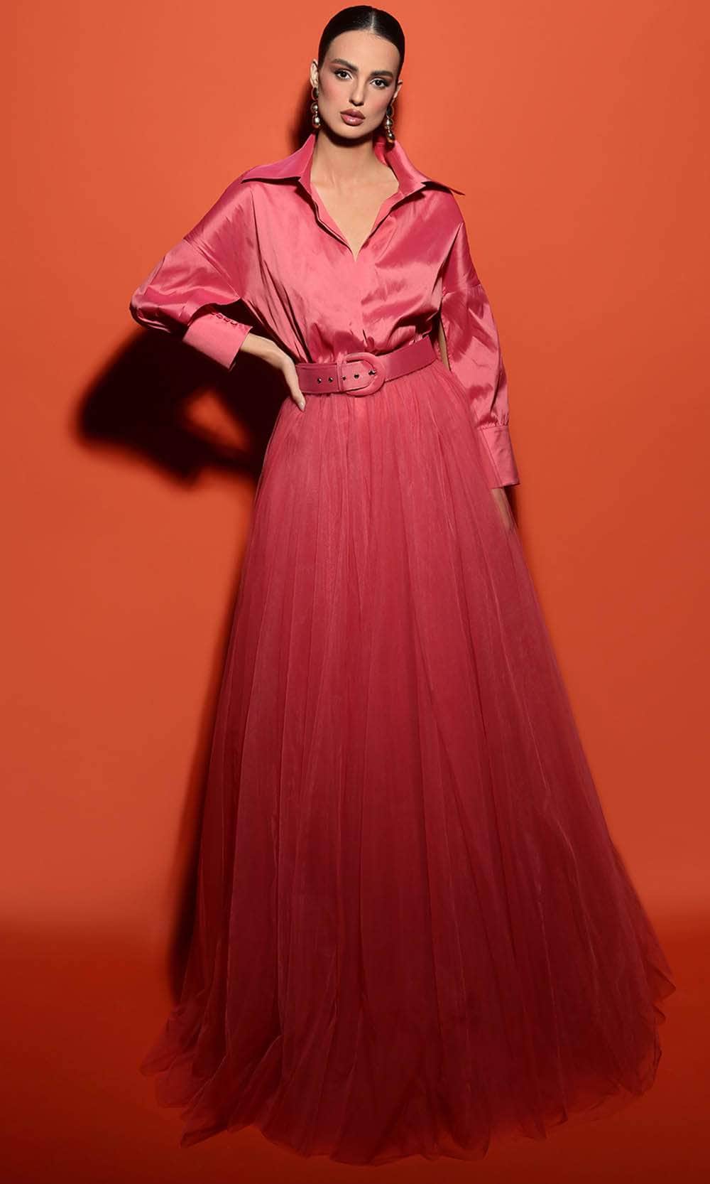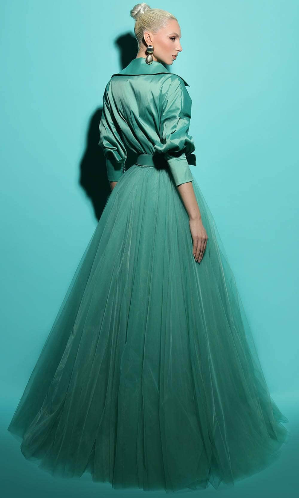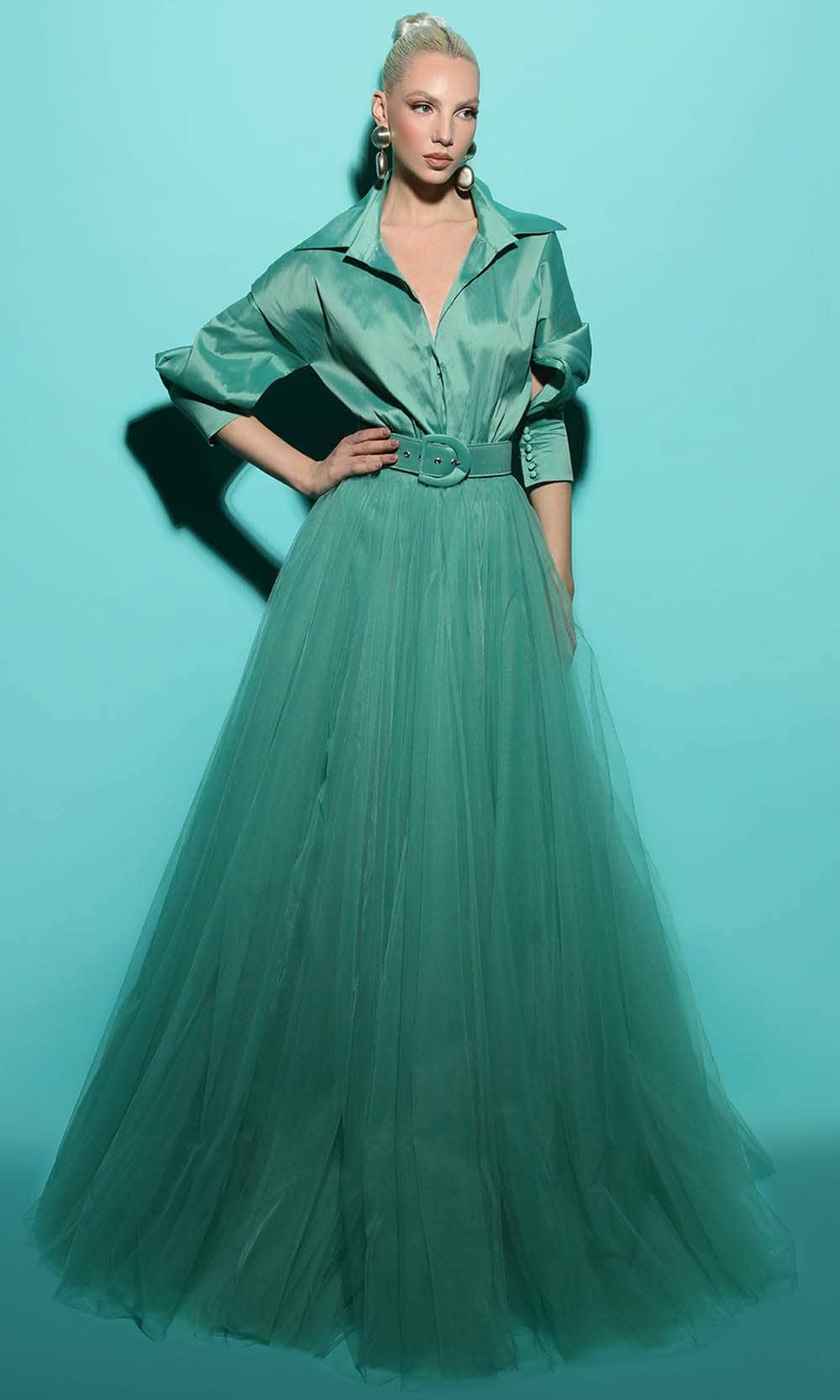 Embrace a wonderful evening in this amazing creation by Tarik Ediz 98405. This gown boasts a timeless beauty with its collared deep v-neckline, full back, and long sleeves with buttons cuff. The buckled belt emphasizes your waist for a sleeker look. The ruched skirt gracefully glides into an A-line silhouette with an enthralling sweep train finish. This Tarik Ediz 98405 gown is specially designed to make that special occasion worth reminiscing. Models are wearing the Terracotta, Black, and Basil Green colors.