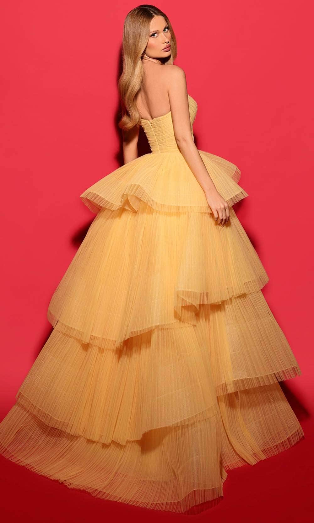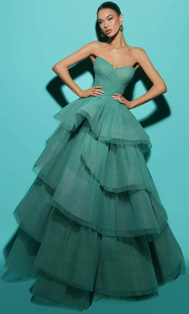 Take their breath away at your special event in this Tarik Ediz 98426 masterpiece. Made from a glittering tulle fabric, this beautiful ensemble displays a sweetheart neckline and strapless bodice that draws attention to your collarbone and shoulders. The ruched design throughout the fit and flare bodice oozes luxury and charm. A convenient zipper closure at the mid-open back keeps this gown in place. The A-line skirt is enhanced by tiered detailing, and it glides magnificently to the floor and sweeping train. Create magical moments as you revel in Tarik Ediz 98426 long gown. Models are wearing the Terracotta, Golden Yellow, Bijou Blue, and English Green colors.