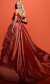 You will command attention at your upcoming formal event in this tantalizing Tarik Ediz 98458 creation. Gorgeously crafted with pleats gathering on a wrap style bodice, this stunner features an off shoulder neckline with an oversized bow accenting one side of the waist, Detailed with a trim of feathers along the high slit, the back is rendered with a wide v-open back and a concealed zipper closure. The sheath skirt is overlaid with an overskirt and a sweeps down into a court train. Be seduced by the beautiful design and timelessness of this Tarik Ediz 98458 masterpiece. Models are wearing the Navy, Fuchsia, Royal Blue, and Sunset colors.