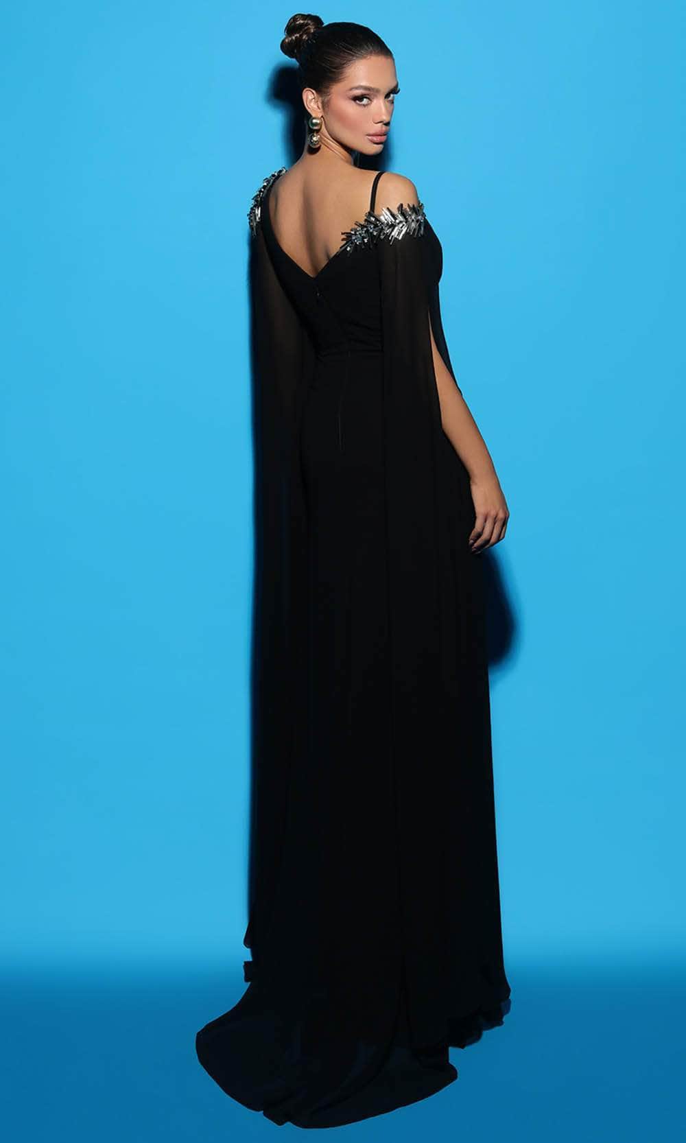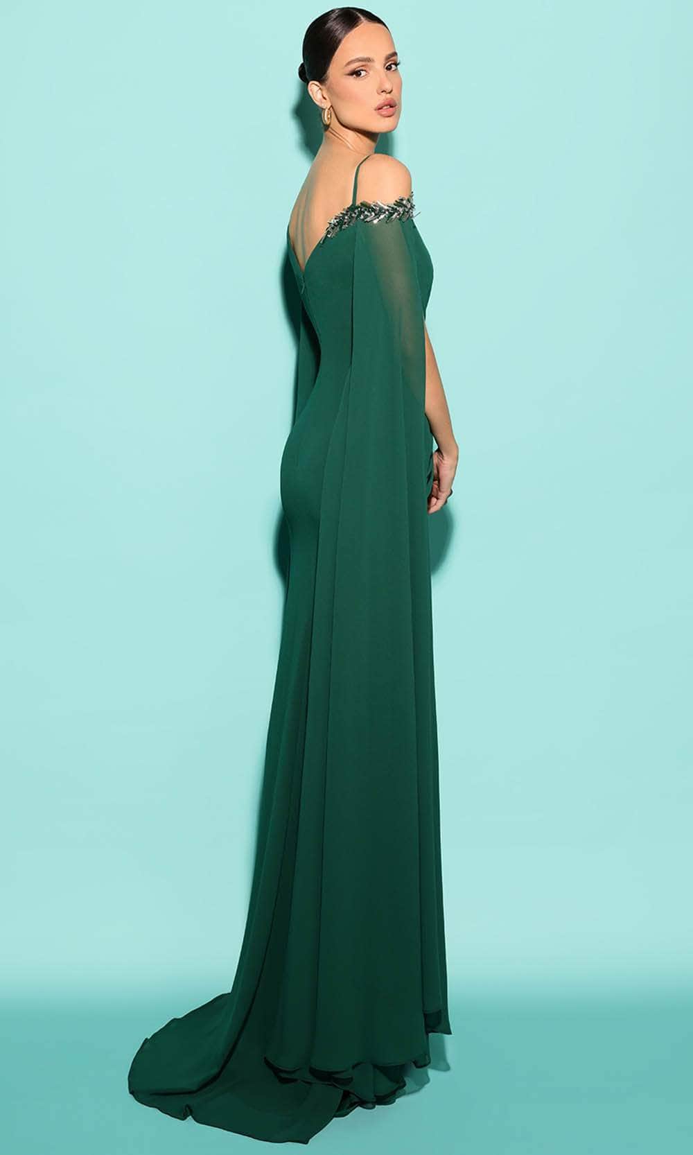 Dress to impress on your next formal event in this captivating Tarik Ediz 98492 gown. It features a V-neckline, spaghetti straps, and delicate beaded details hinting at the shoulders and waist, where the waist adorned with subtle embellishments and around it is elegantly ruched with a high slit that adds a touch of allure to this sheath gown. Tarik Ediz 98492 creation is an exquisite choice for those who appreciate understated glamour and modern elegance! Models are wearing Black and Emerald colors.