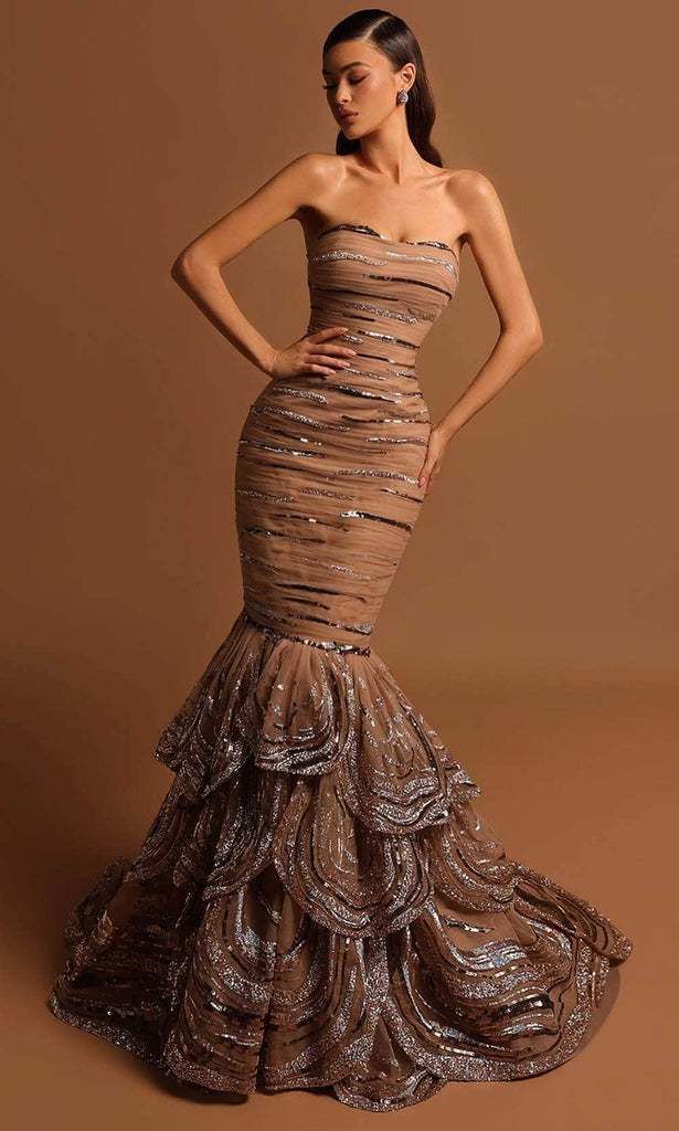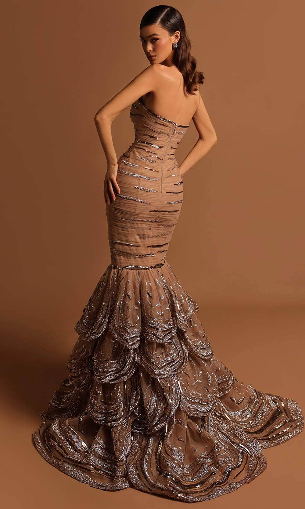 Look jaw-dropping in this dramatic gown by Tarik Ediz 98556. Designed to make you feel like a true queen, this strapless style has ruched detailing on the bodice that highlights your hourglass figure. It’s adorned with delicate sequins that exude extravagance and definitely catch the light. The tantalizing mid-open back comes with a zipper closure to ensure an impeccable fit. The mermaid skirt streams down to the floor with a captivating sweeping train and ruffled tier finish. Be the center of attention at your next event in this beautiful Tarik Ediz 98556 masterpiece. Model is wearing the Champagne color.