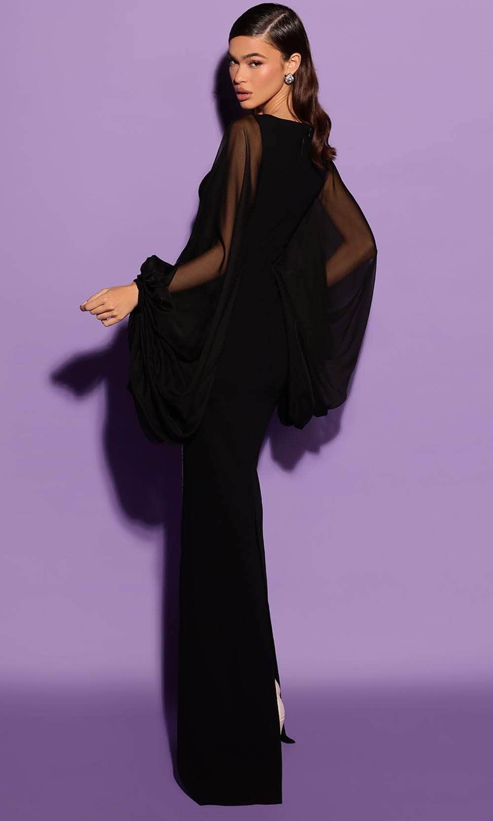 Make an amazing statement when you walk in this stylish Tarik Ediz 98563 creation. This attention-grabbing gown is constructed of crepe fabric, and displayed a ribbon pattern of beaded applique that gives a sense of grandeur. The bateau neckline is perfectly paired with the full back, and illusion cape long sleeves. The stunning sheath skirt embraces your figure, ending in full length hem and back slit for ease of movement. This evening gown by Tarik Ediz 98563 is a red carpet knockout! Model is wearing the Black color.