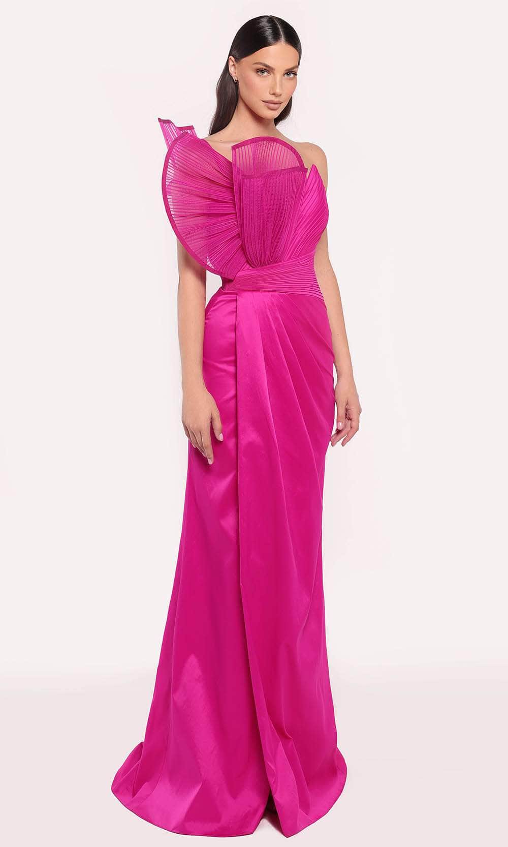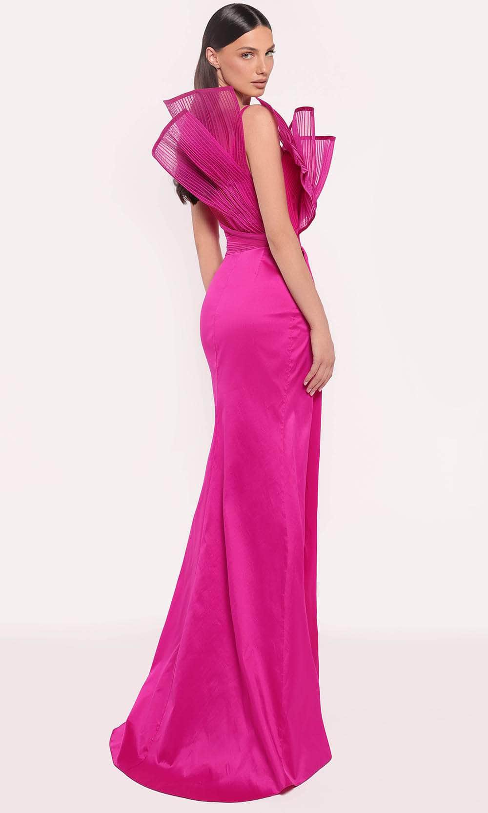 Adorn yourself in the Tarik Ediz 98705 masterpiece, a symphony of refined elegance. This exquisite gown, crafted from luxurious taffeta, showcases meticulous craftsmanship. Its tailored lines sculpt your silhouette, while the structured one-shoulder strap and tiered bodice create a captivating allure. The structured bodice, featuring a midrise back, adds a touch of sophistication. The trumpet skirt, with a foldover slit and sweeping train, complements the overall elegance of the gown. This Tarik Ediz 98705 creation is the perfect choice for those seeking a gown that exudes the epitome of grace and style for any formal occasion. Models are wearing the Black and Orchid colors.