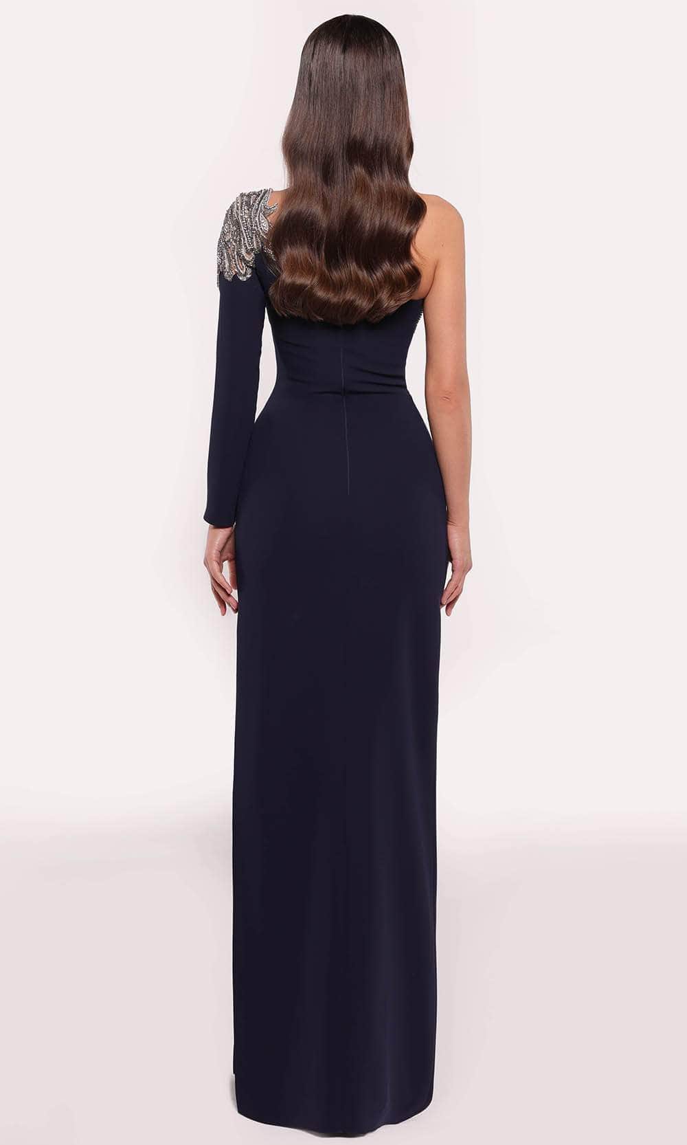 Be an emblem of exquisite taste in this Tarik Ediz 98712 masterpiece. This exquisite evening dress, crafted from luxurious crepe, is a testament to meticulous craftsmanship. Its tailored lines sculpt your silhouette, while the one-shoulder neckline adorned with intricate teardrop beadwork creates a captivating allure. The long sleeve and asymmetrical open back add a touch of sophistication. The sheath skirt parades a floor-length hem. Sparkle like a dream wearing this Tarik Ediz 98712 stunner. Model is wearing the Navy color.