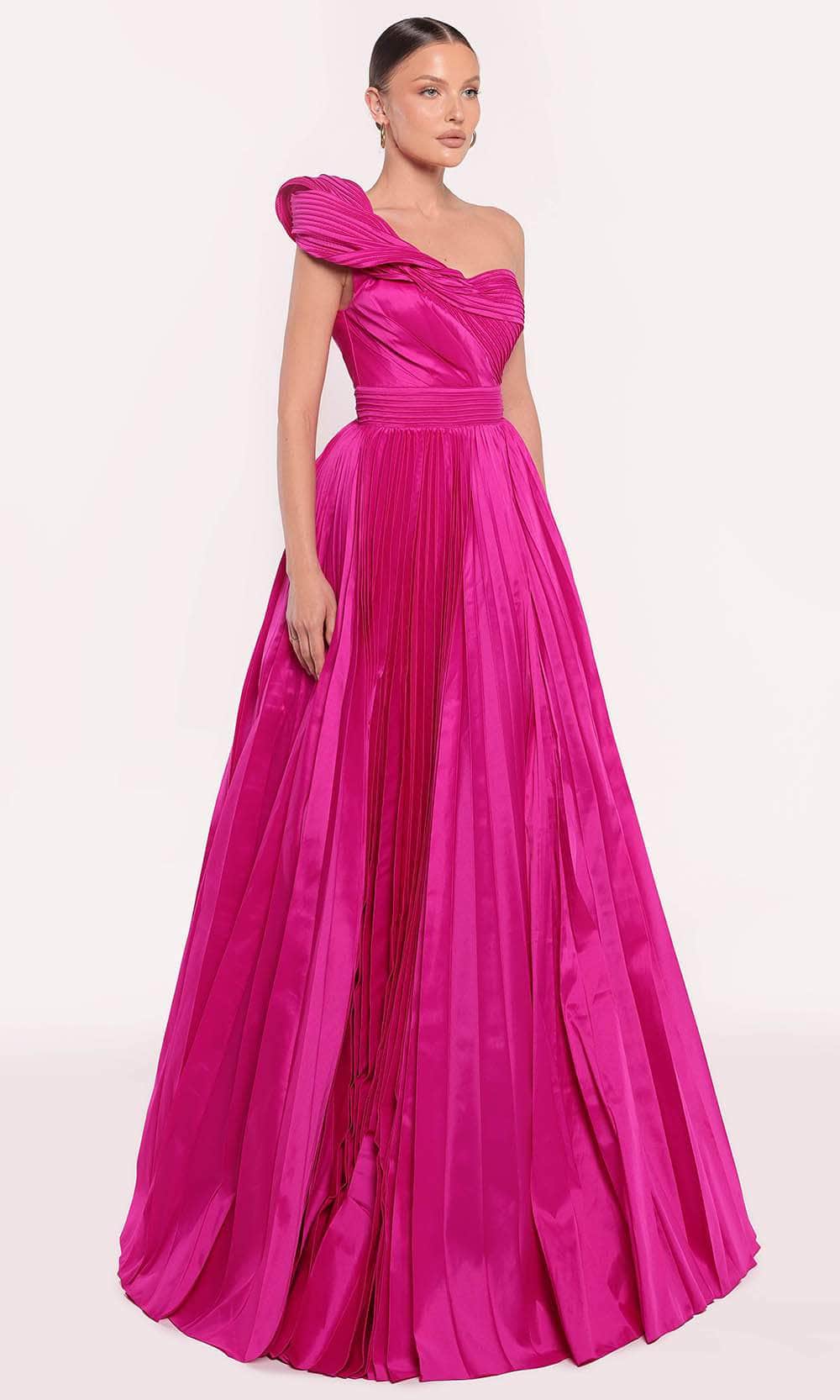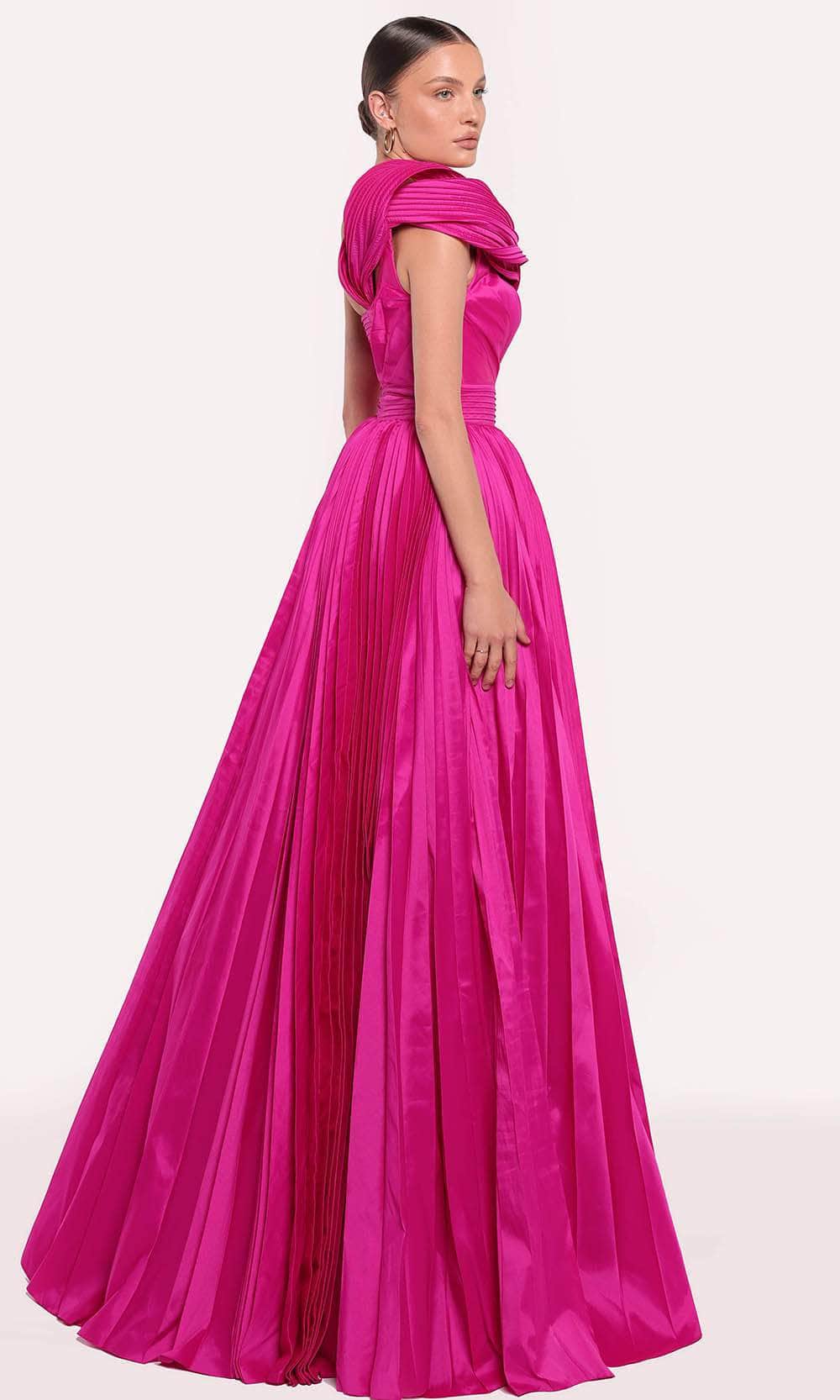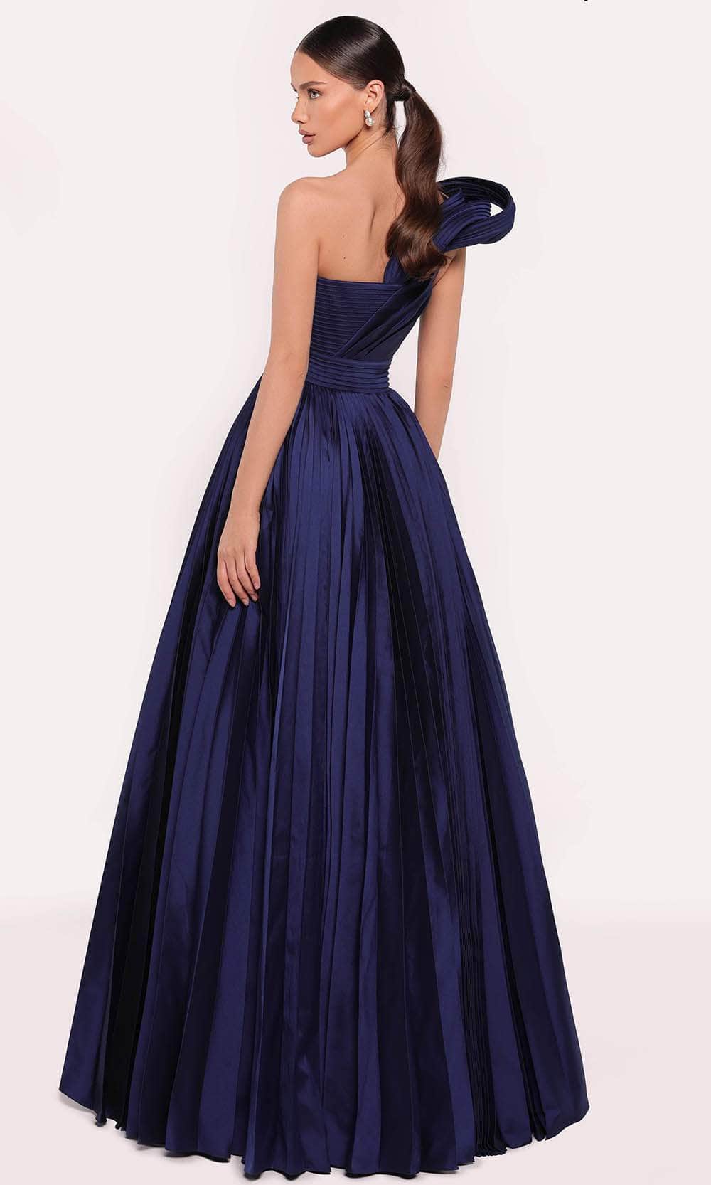 Become an emblem of perfection wearing this Tarik Ediz 98714 masterpiece. This exquisite evening gown, crafted from luxurious taffeta fabric, is a testament to meticulous craftsmanship. Its tailored lines sculpt your silhouette, while the structured one-shoulder strap and shirred textured bodice create a captivating allure. The structured bodice, featuring a midrise back, adds a touch of sophistication. The pleated A-line skirt, with a sweeping train, complements the overall elegance of the gown. This Tarik Ediz 98714 creation is the perfect choice for those seeking a gown that exudes modern sophistication and style for any formal occasion. Models are wearing the Navy, and Orchid colors.