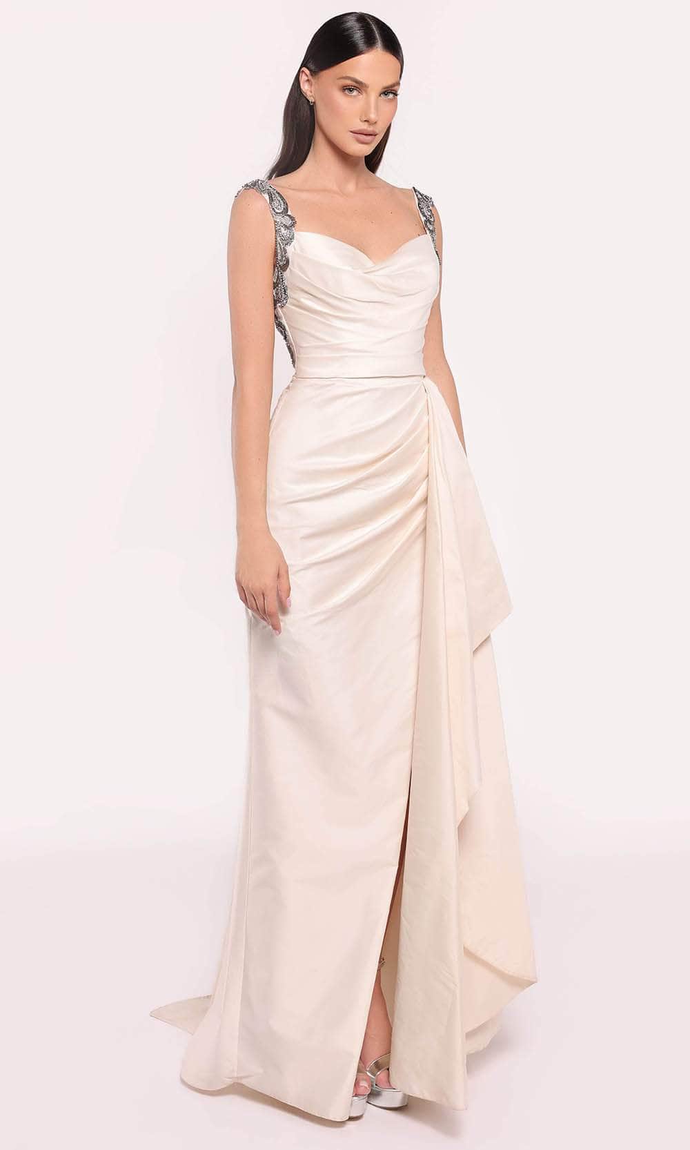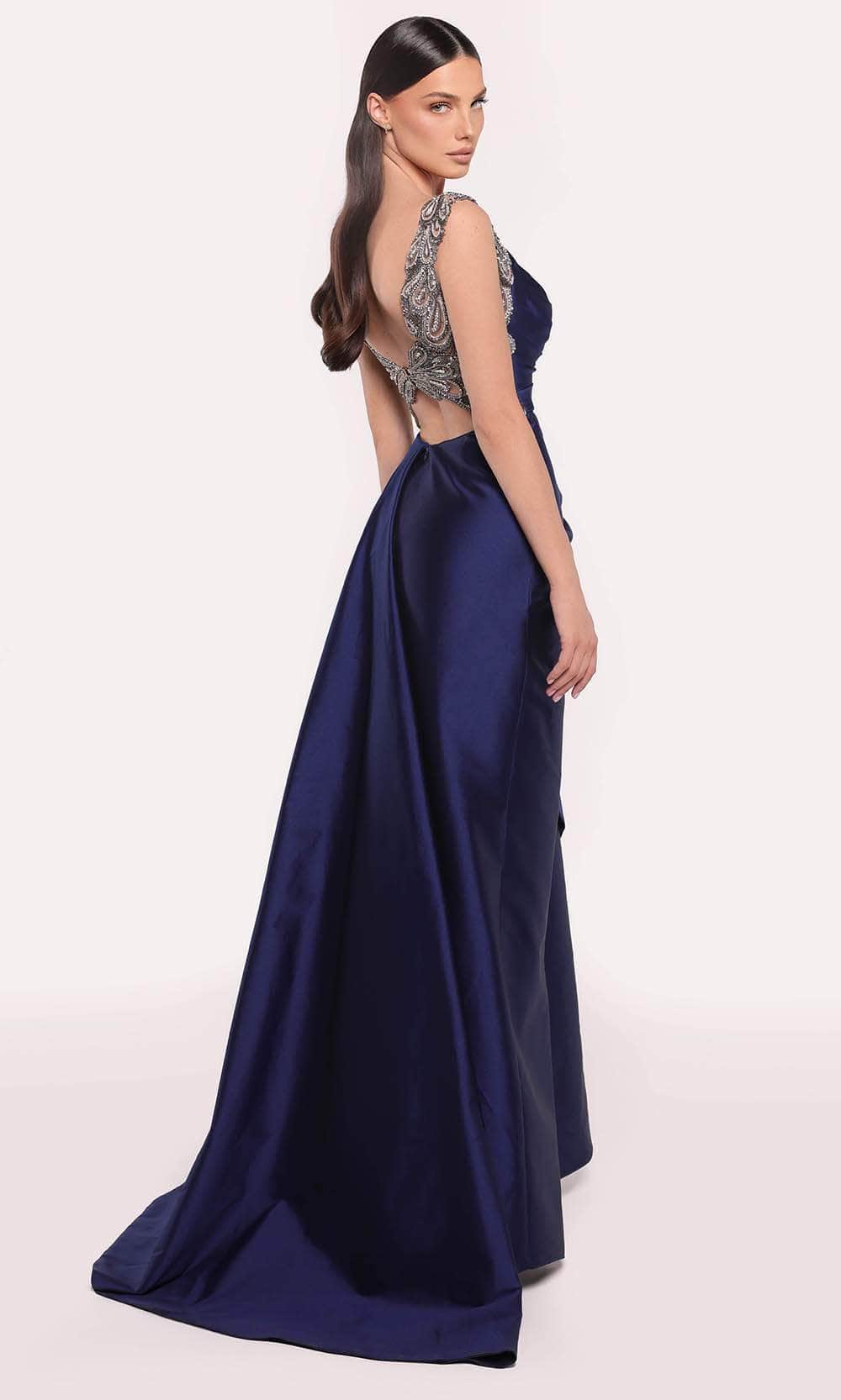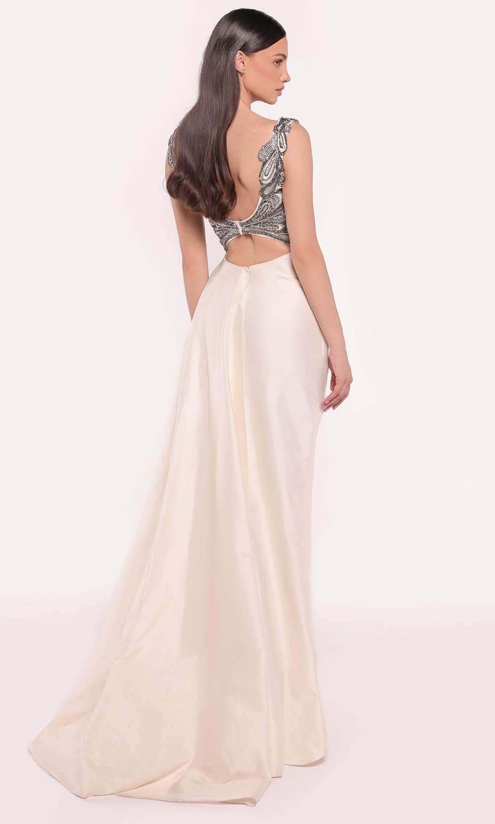 Indulge in the epitome of timeless elegance with the Tarik Ediz 98738 masterpiece. This exquisite evening gown, crafted from luxurious taffeta fabric, is a testament to meticulous craftsmanship. Its tailored lines sculpt your silhouette, while the sleeveless bodice adorned with paisley beadwork and the sweetheart neckline create a captivating allure. The scoop open back with a low cutout design adds a touch of sensuality. The sheath skirt, featuring a high slit and cascading drapes, flows gracefully into a sweeping train. This Tarik Ediz Tarik Ediz 98738 creation is the perfect choice for those seeking a gown that exudes sophistication and style for any formal occasion. Models are wearing the Vanilla and Navy colors.