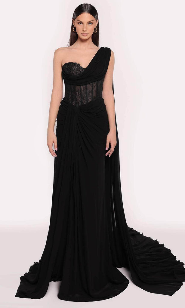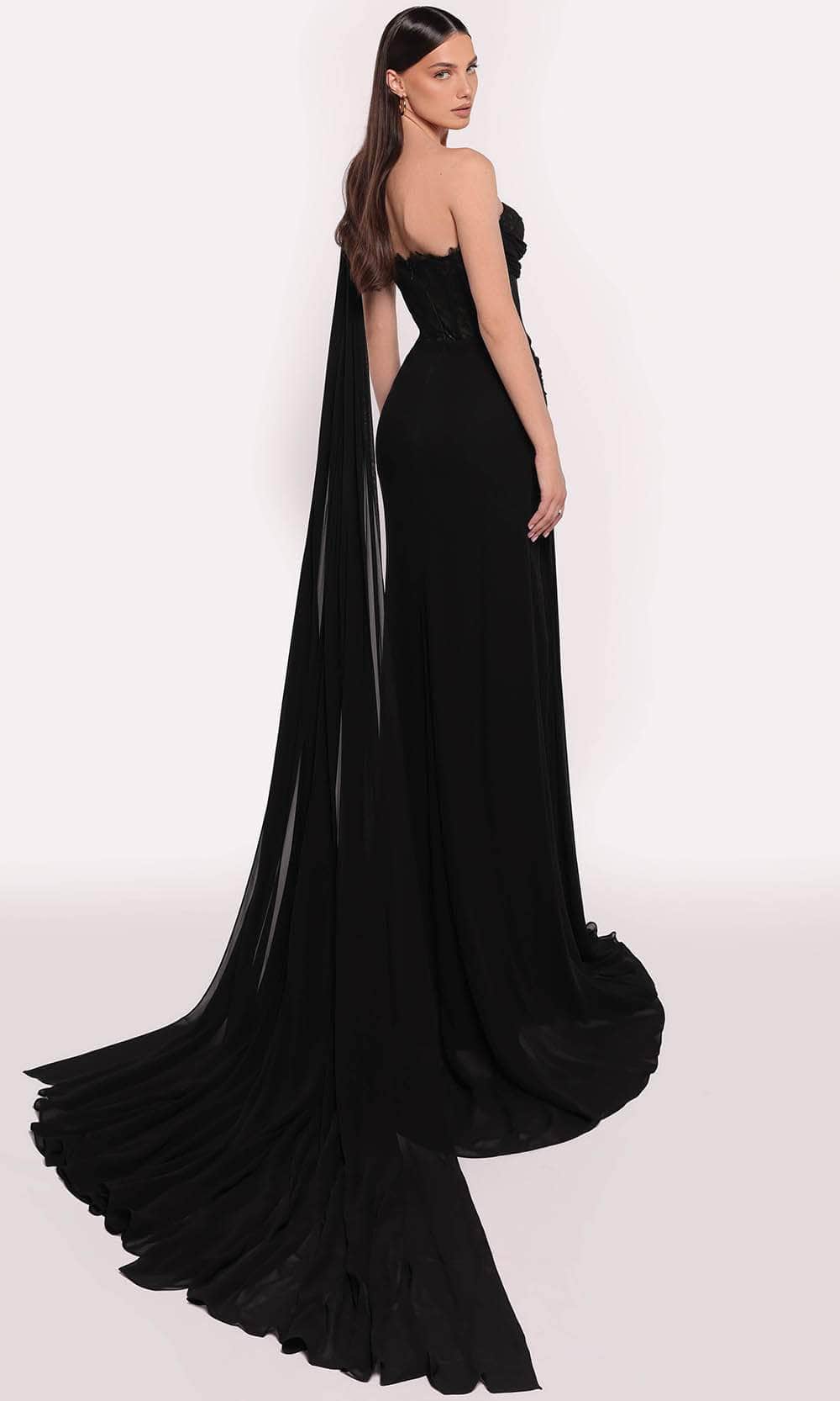 A modern interpretation of classic style, this Tarik Ediz 98772 gown is both timeless and trendy. This exquisite evening dress, crafted from luxurious lace and chiffon, is a testament to meticulous craftsmanship. Its tailored lines sculpt your silhouette, while the draped sash on the lace bustier bodice and one-shoulder neckline create a captivating allure. The corset-boned midriff and draped accent on the sheath skirt add a touch of sophistication. The cascading sash and overskirt complement the overall elegance. This Tarik Ediz 98772 creation is the perfect choice for those seeking a gown that exudes modern sophistication. Model is wearing the Black color.