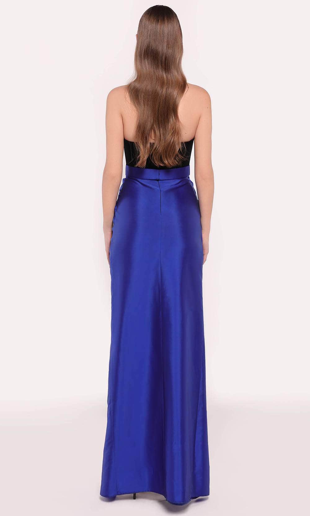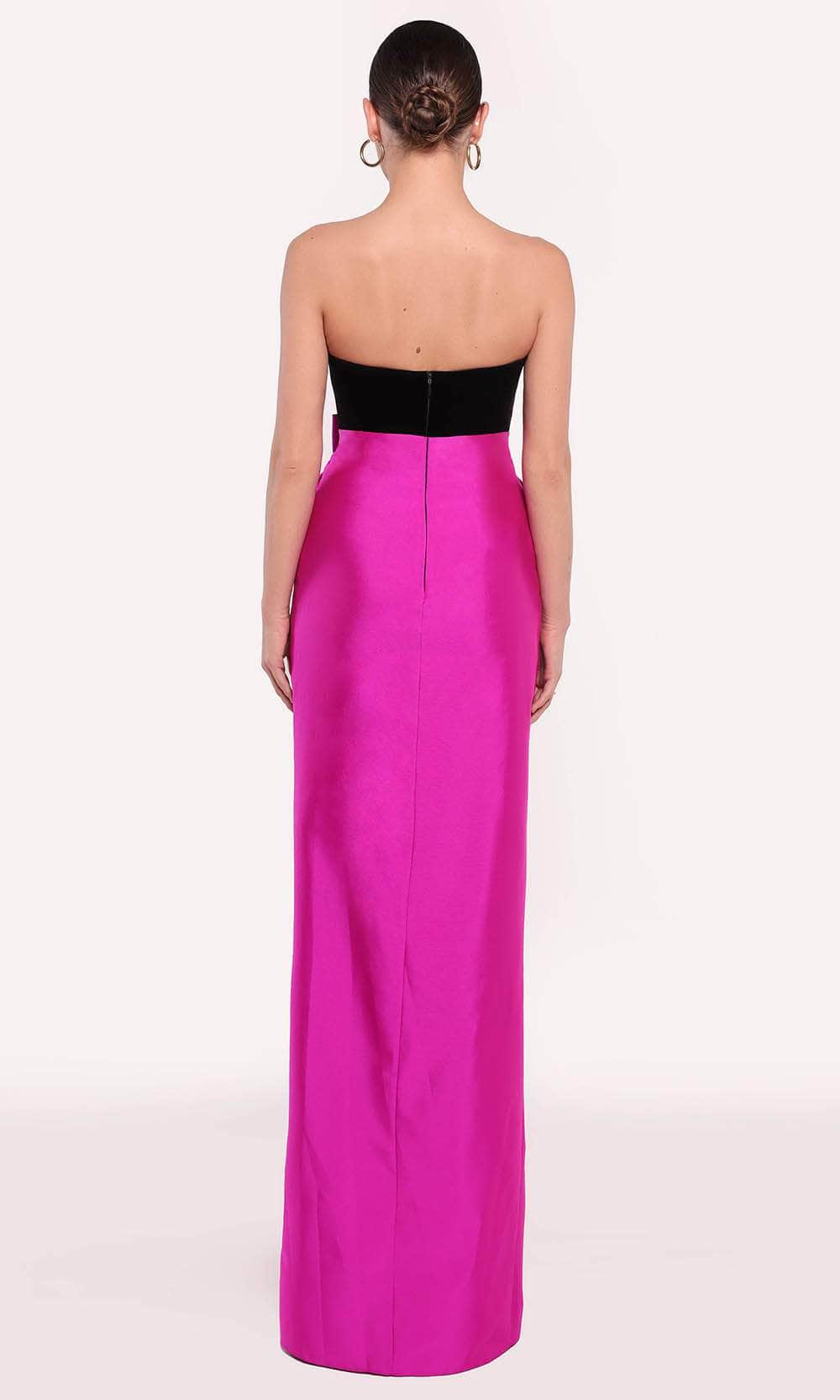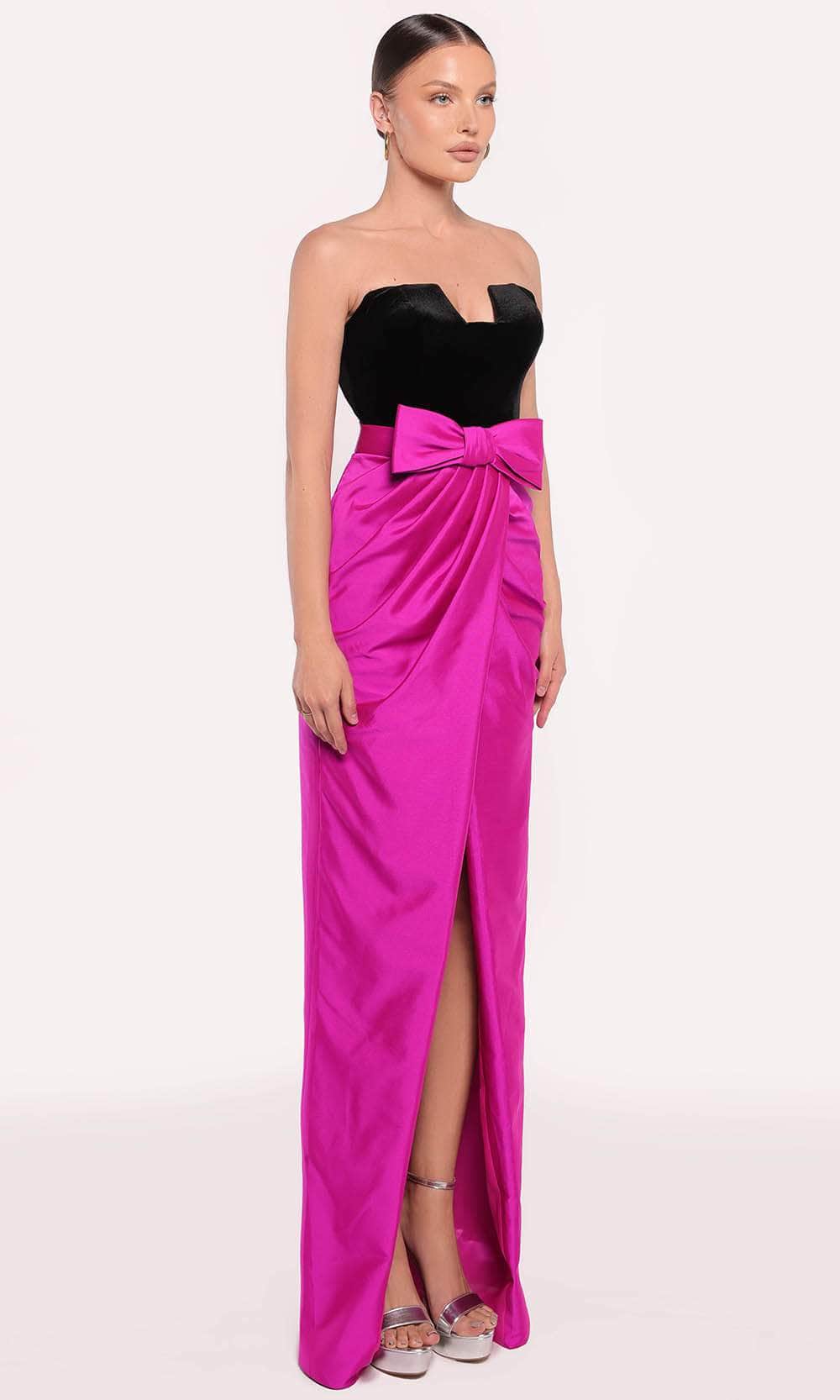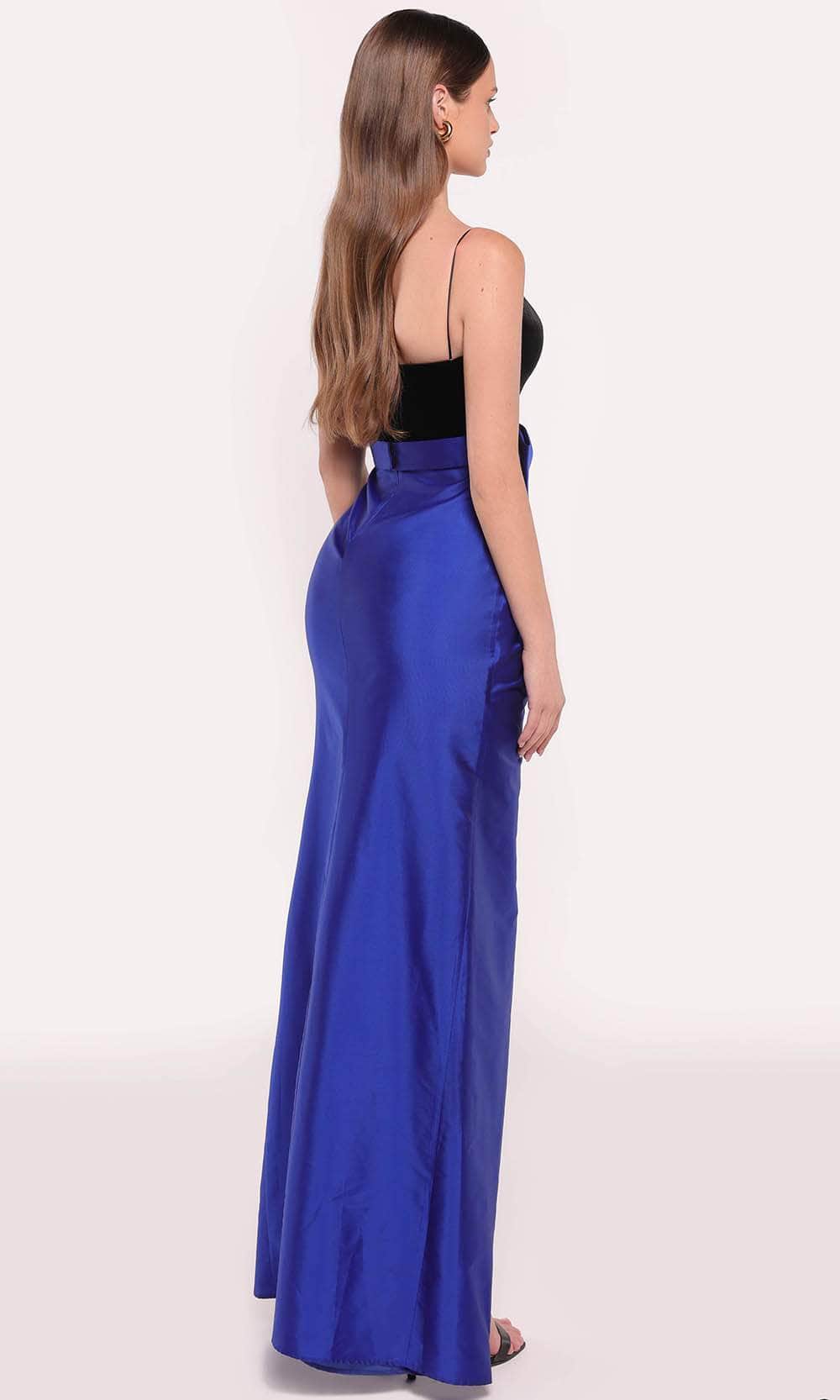 | Details: | Two-Tone, Modified Notch Bodice, Bow Detailed Waist, Draping, Front Slit, Floor Length Hem |