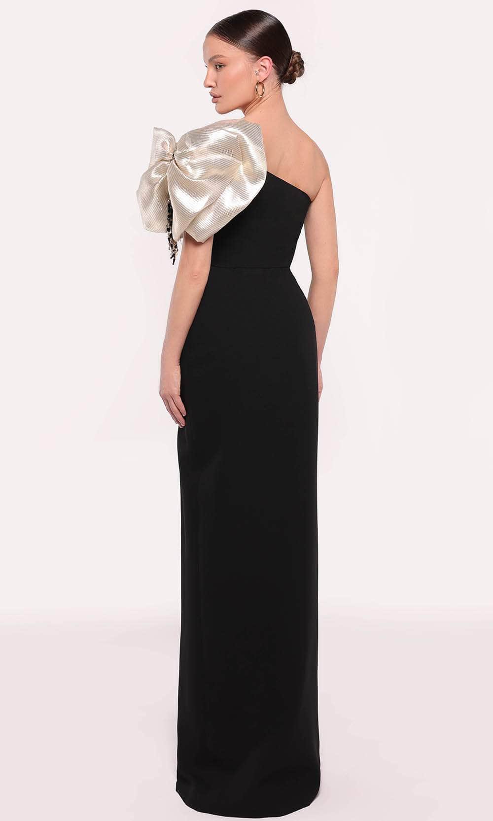 The Tarik Ediz 98800 evening dress, a sartorial masterpiece, is a captivating blend of modern and timeless sophistication. Its tailored lines sculpt the feminine form with a supple crepe fabric, while the metallic oversized bow adorned with beaded fringes adds a touch of glamour. The asymmetrical neckline and midrise back create a flattering silhouette, complemented by the sheath skirt with a high slit and floor-length hem. This Tarik Ediz 98800 evening dress is a testament to unparalleled elegance Models are wearing the Black/Gold colors.