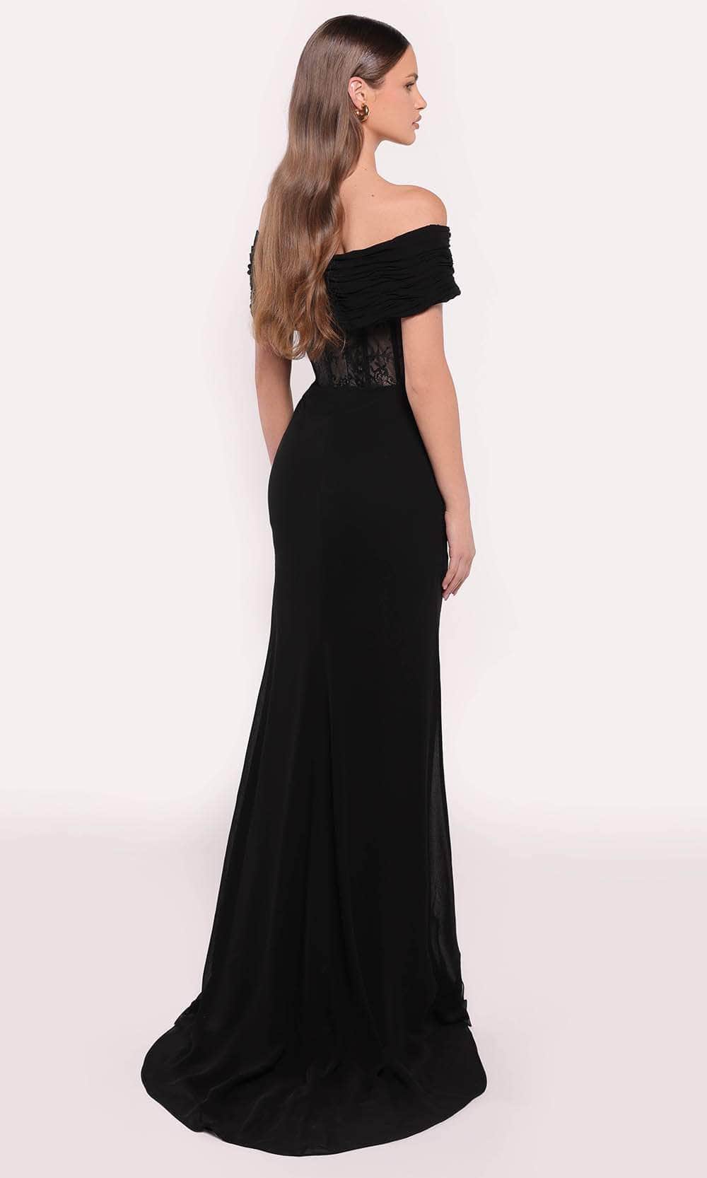 Be the center of attention in the Tarik Ediz 98815 dress. This stunning evening gown, made from luxurious fabric, showcases exceptional craftsmanship. Its tailored design flatters your figure, while the chiffon overlay adds a touch of sophistication. The corset boned bodice and draped off-shoulder neckline further enhance its elegance. The embellished floral accent on one side of the waist adds a touch of charm. The sheath skirt with a high slit and a sweeping train complements the overall look. Make a statement and leave a lasting impression in the unforgettable Tarik Ediz 98815 gown. Model is wearing the Black color.