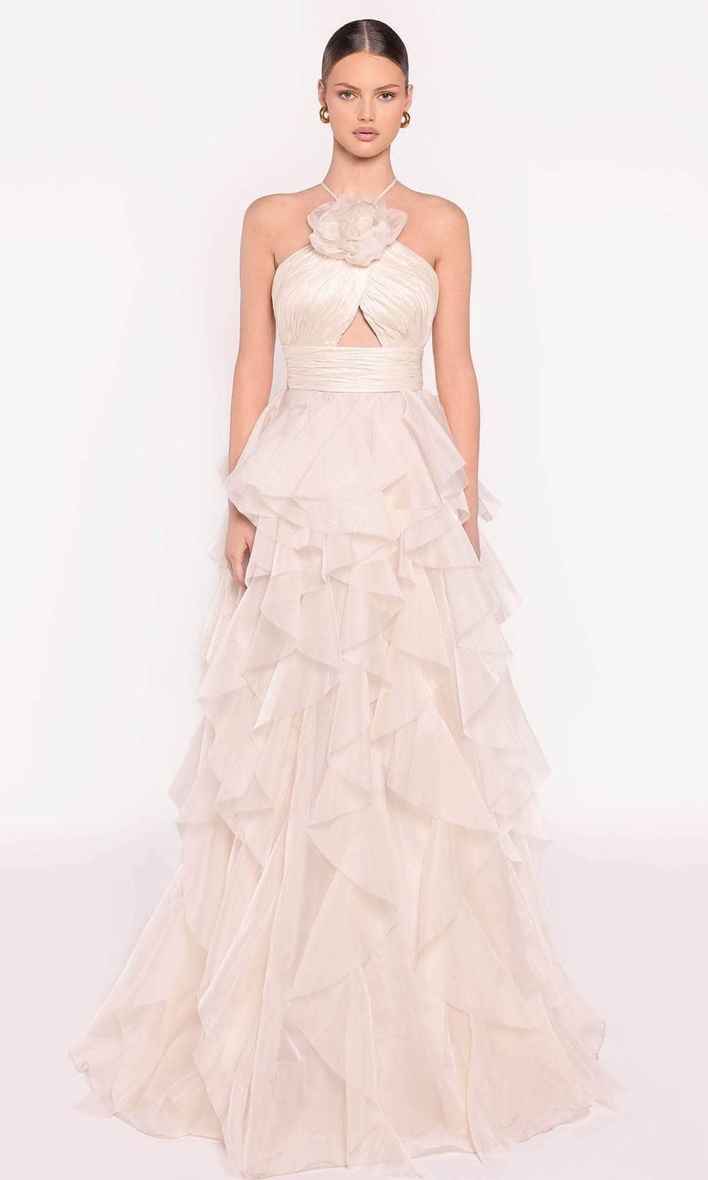 | Details: | Cross Halter Strap, Floral Applique with Cutout, Shirred Bodice and waistband, Tiered Skirt, Sweep Train |