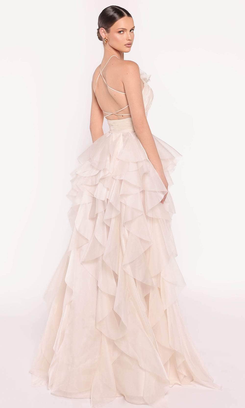 Delight in the luxurious fabrics and intricate details of this Tarik Ediz 98818 masterpiece. This exquisite evening dress, crafted from luxurious shirred taffeta, is a testament to meticulous craftsmanship. Its tailored lines sculpt your silhouette, while the cross halter strap neckline and midrise back create a captivating allure. The shirred bodice, adorned with a floral applique cutout, adds a touch of sophistication. The tiered A-line skirt, cascading into a sweeping train, complements the dress's overall elegance. This Tarik Ediz 98818 creation indulge your senses. Model is wearing the Vanilla color.