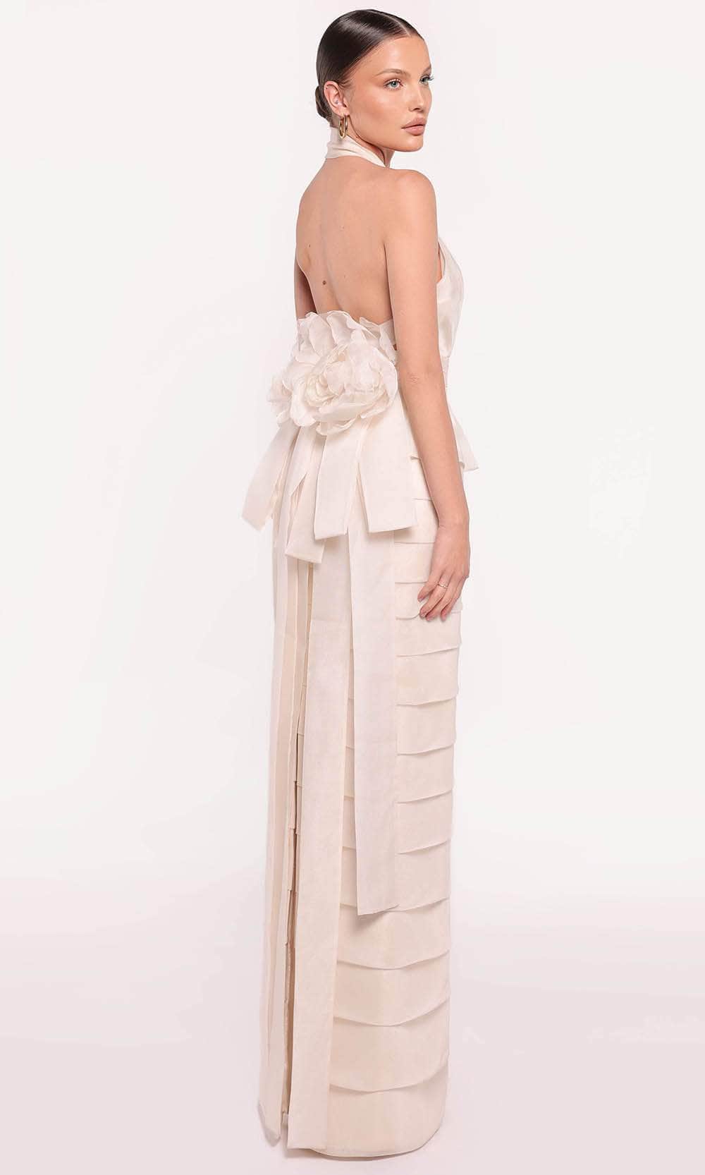 Details: Sleeveless Bodice, Shirred Waistband, Peplum Accent, Midrise Back with an Oversized Floral Accent, Floor Length Hem